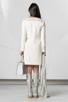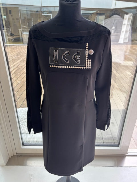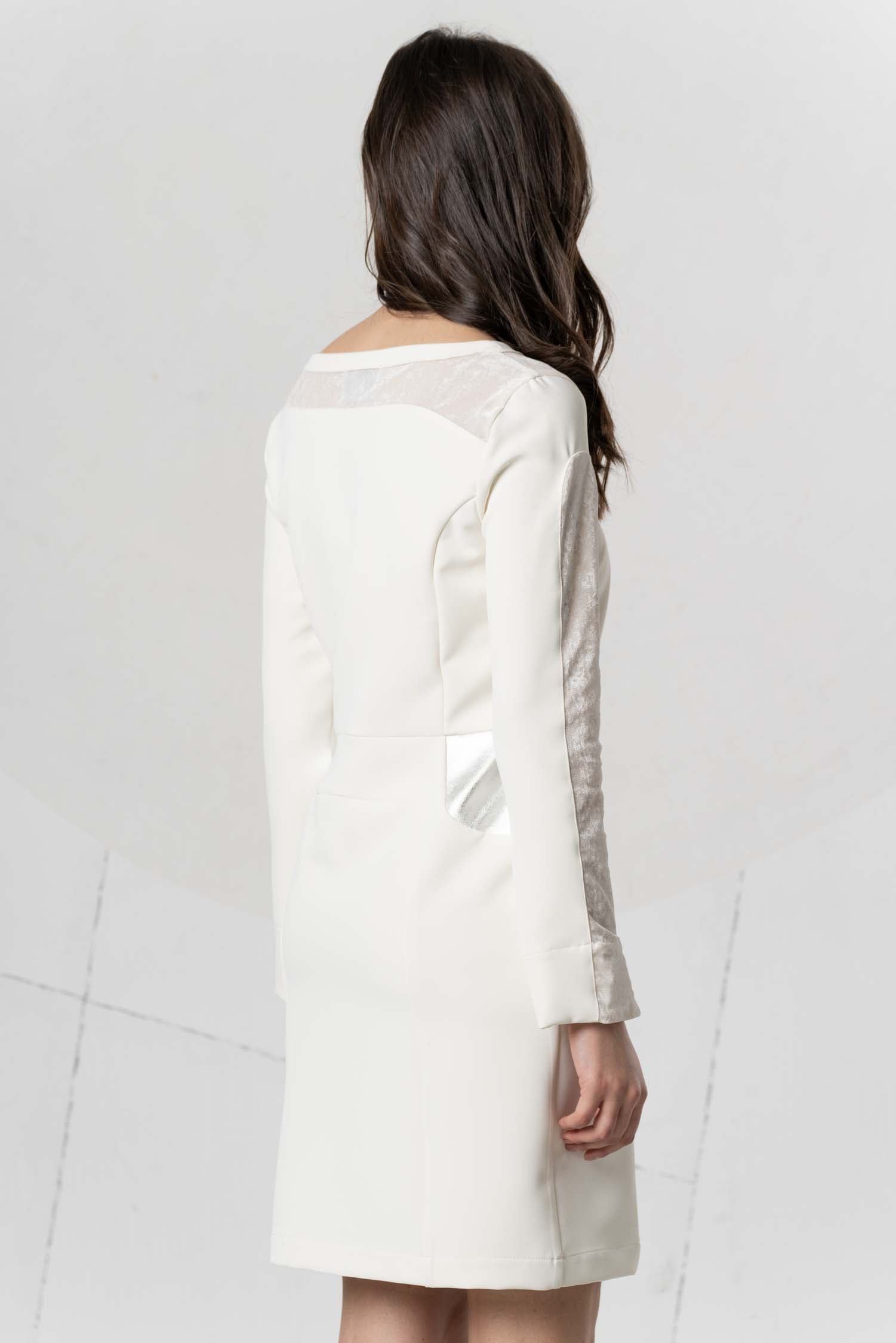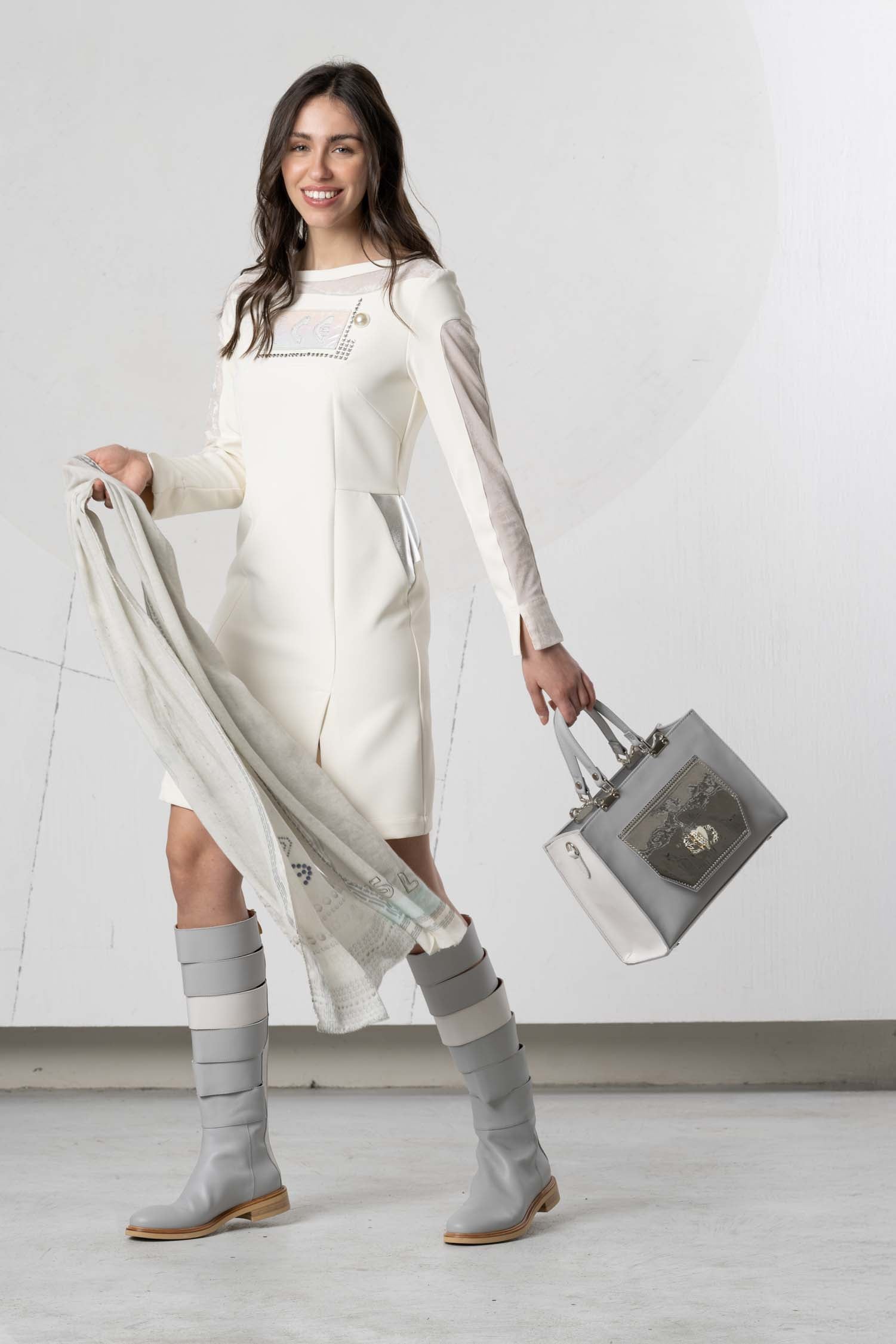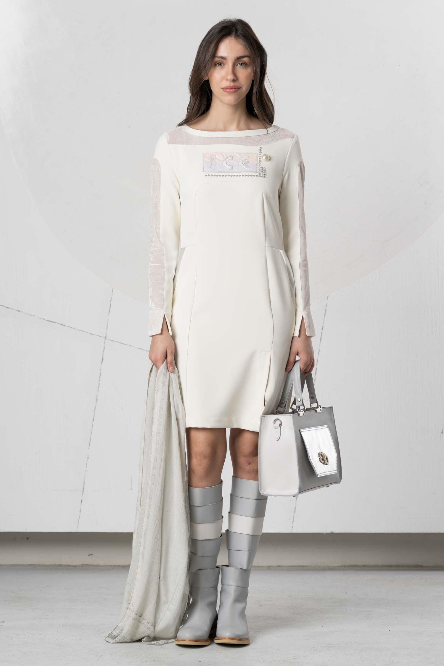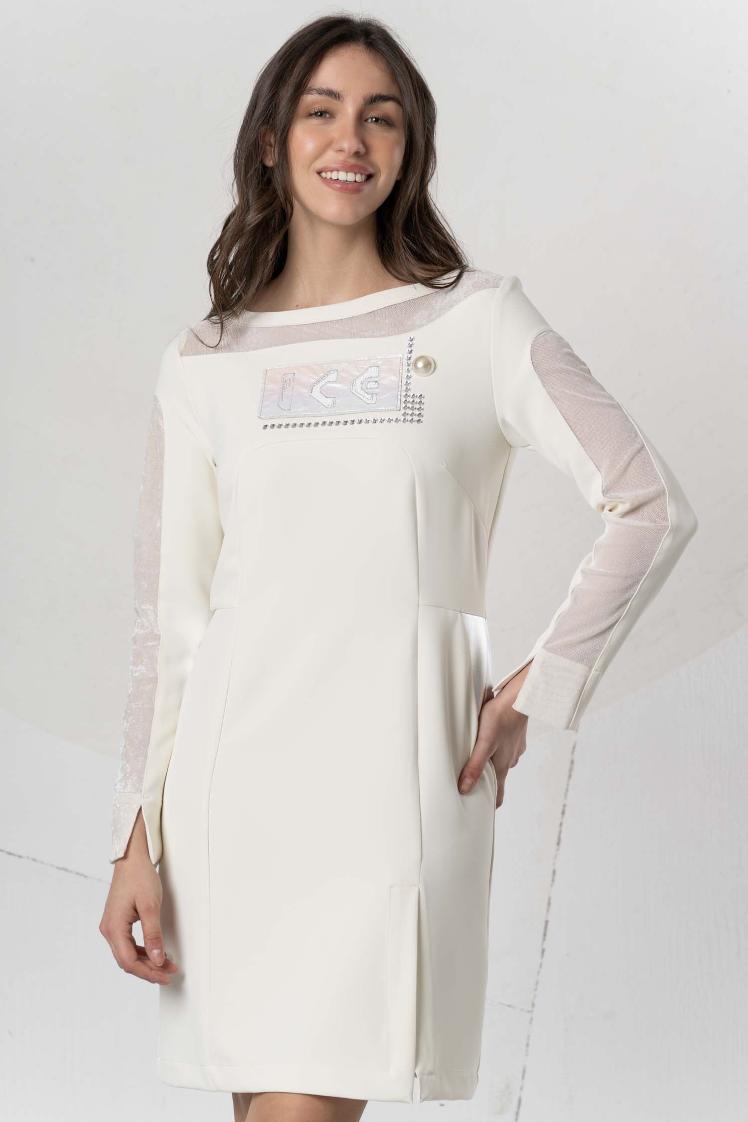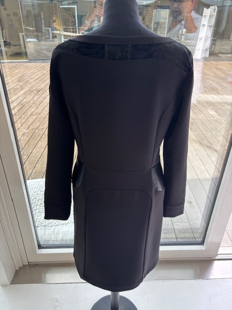 Das knielange Kleid besticht durch die Kombination verschiedener Stoffe in Schwarz und Cremefarbend, die eine elegante und strukturierte Optik erzeugen. Die langärmelige Gestaltung unterstreicht die anspruchsvolle Silhouette und macht das Modell zu einer vielseitigen Wahl für stilbewusste Frauen, die Wert auf hochwertige Verarbeitung und zeitloses Design legen.