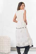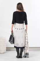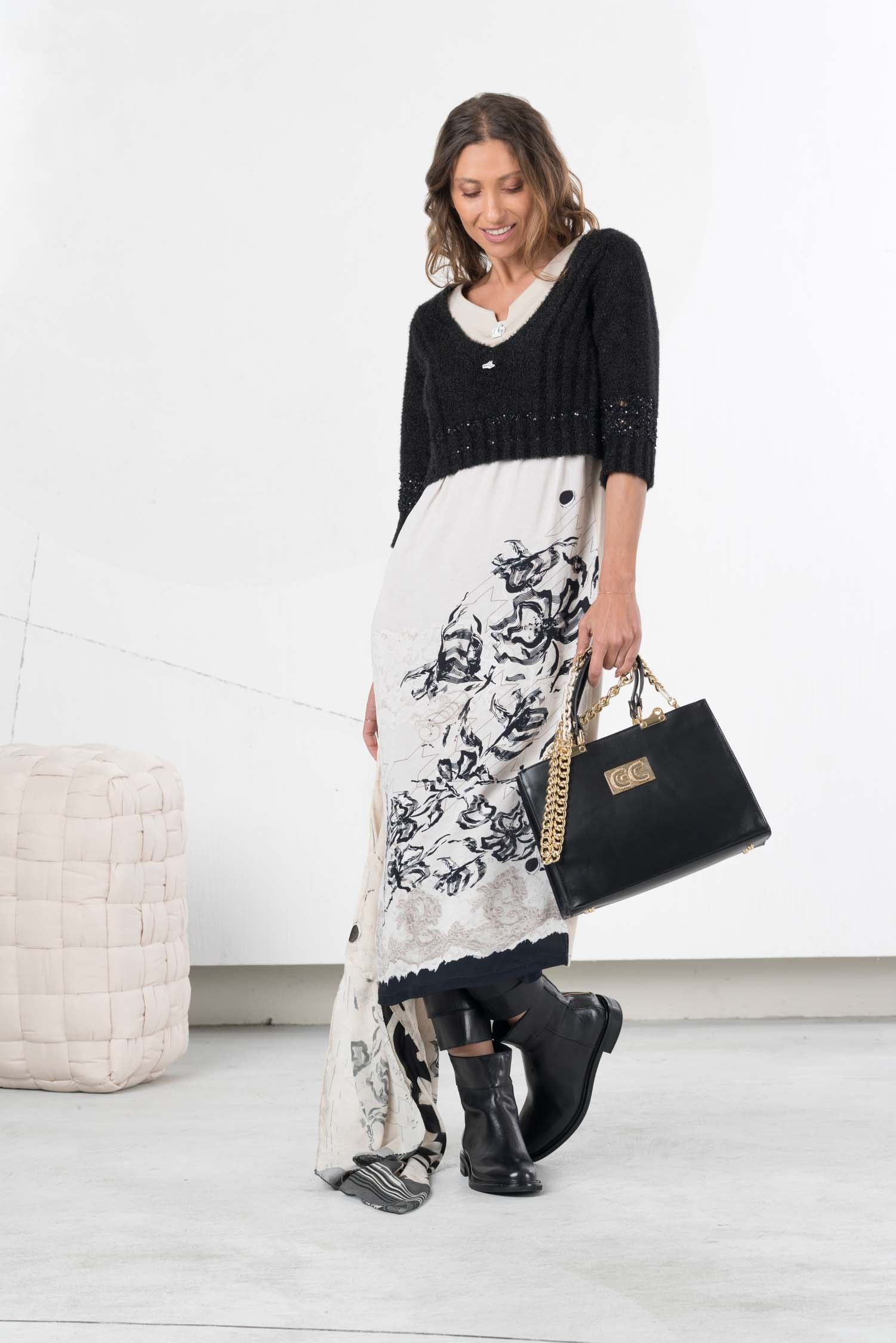 Dieses elegante weiße Kleid besticht durch seine schwarze Musterung, die einen stilvollen Kontrast schafft. Das lang geschnittene Kleid bietet eine schmeichelhafte Silhouette, während die Jacke zusätzlichen Komfort und Vielseitigkeit bietet – ideal für besondere Anlässe oder formelle Events.