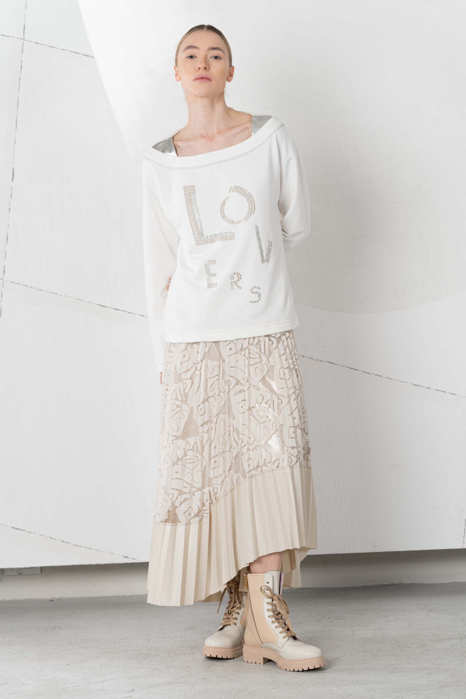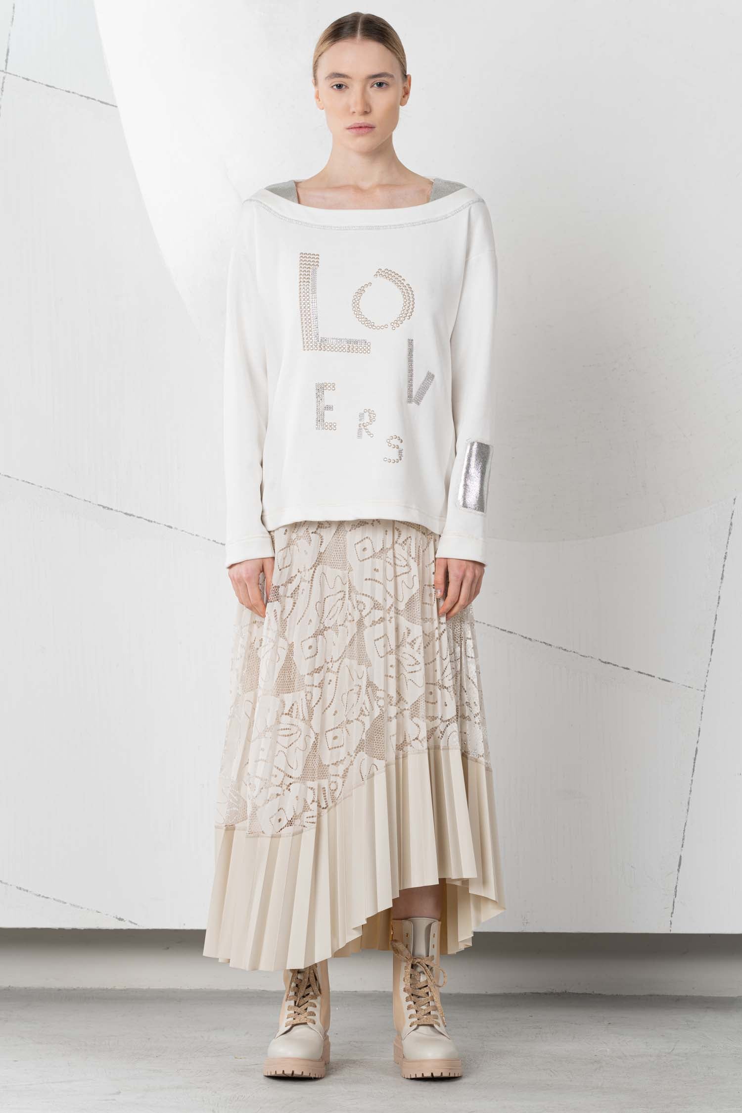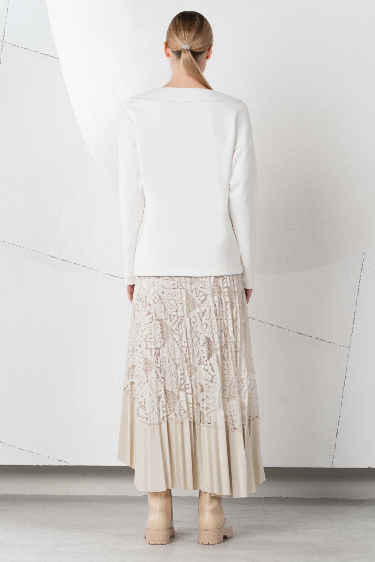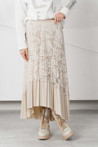 Dieser moderne Faltenrock in Beige besticht durch eine feine Spitzenverzierung, die dem Design eine elegante und zeitgemäße Note verleiht. Das hochwertige Material sorgt für einen angenehmen Tragekomfort und eine schmeichelhafte Silhouette. Die Kombination von klassischer Faltenstruktur und zarter Spitze macht diesen Rock zu einem vielseitigen Stück für anspruchsvolle Outfits.