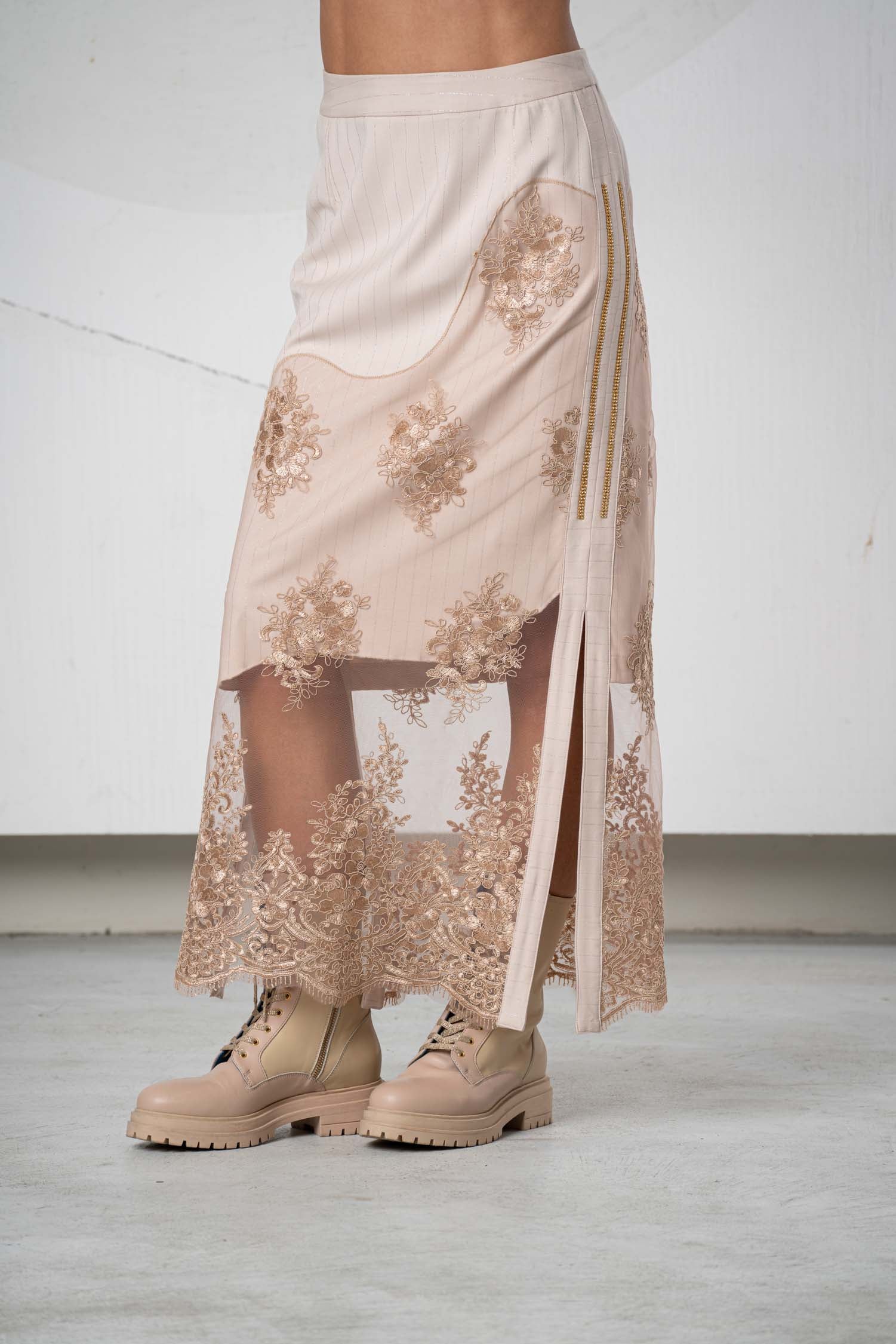 Dieser lange Rock besticht durch seinen stilvollen Beigeton in einem eleganten Nudefarbton und die exquisite Spitzenverzierung, die ihm eine extravagante Note verleiht. Das feine Material sorgt für einen fließenden Fall, der jede Silhouette schmeichelt und zu besonderen Anlässen sowie im Alltag ein elegantes Statement setzt. Ein Must-have für anspruchsvolle Individualisten, die dezente Raffinesse mit einem Hauch Extravaganz verbinden möchten.