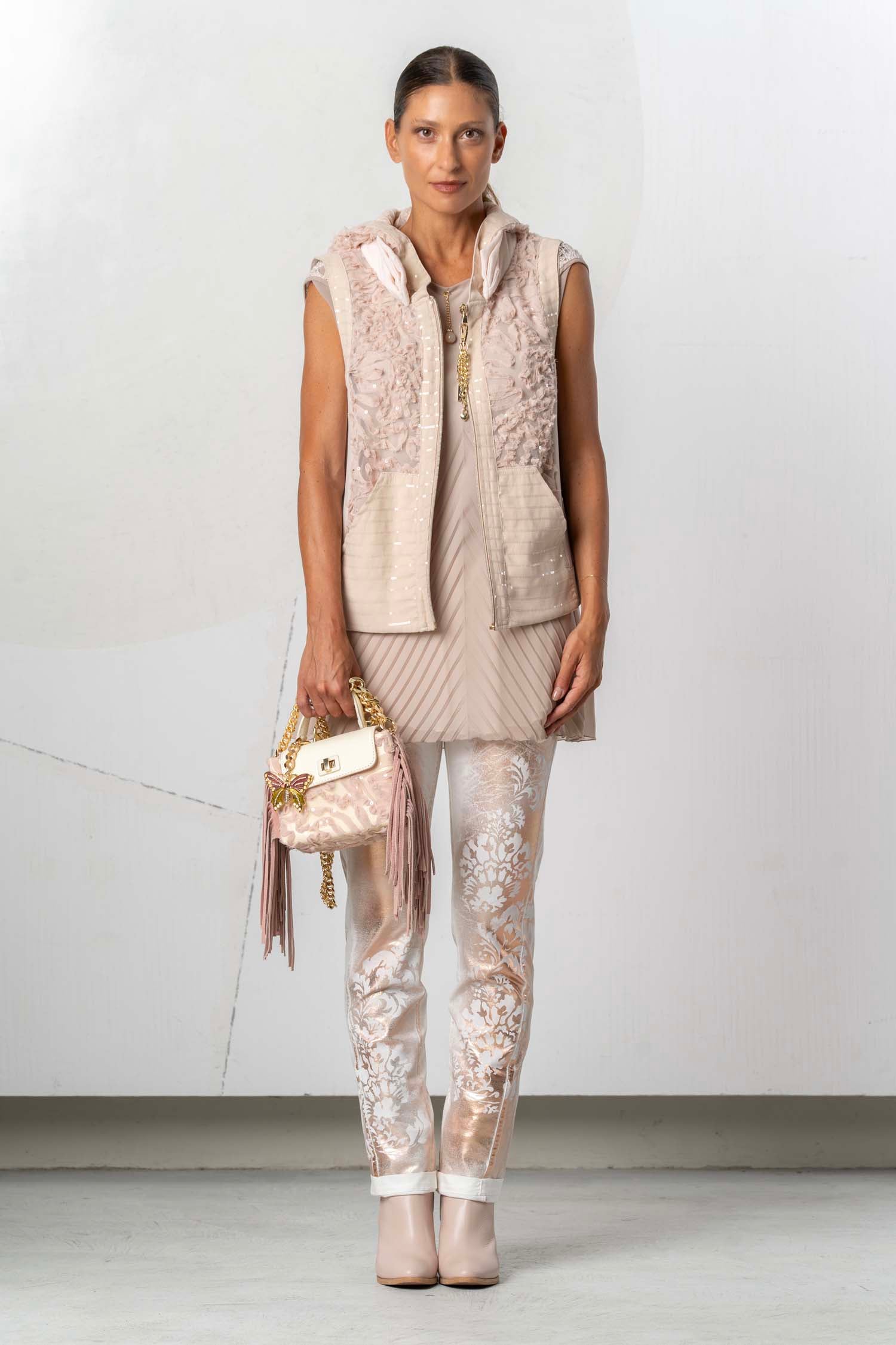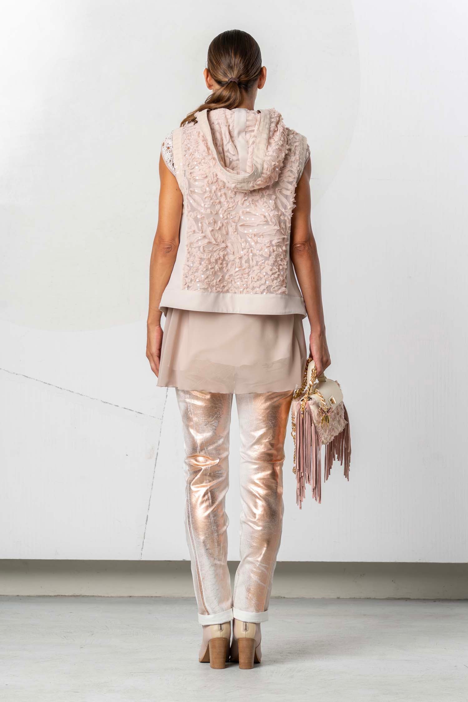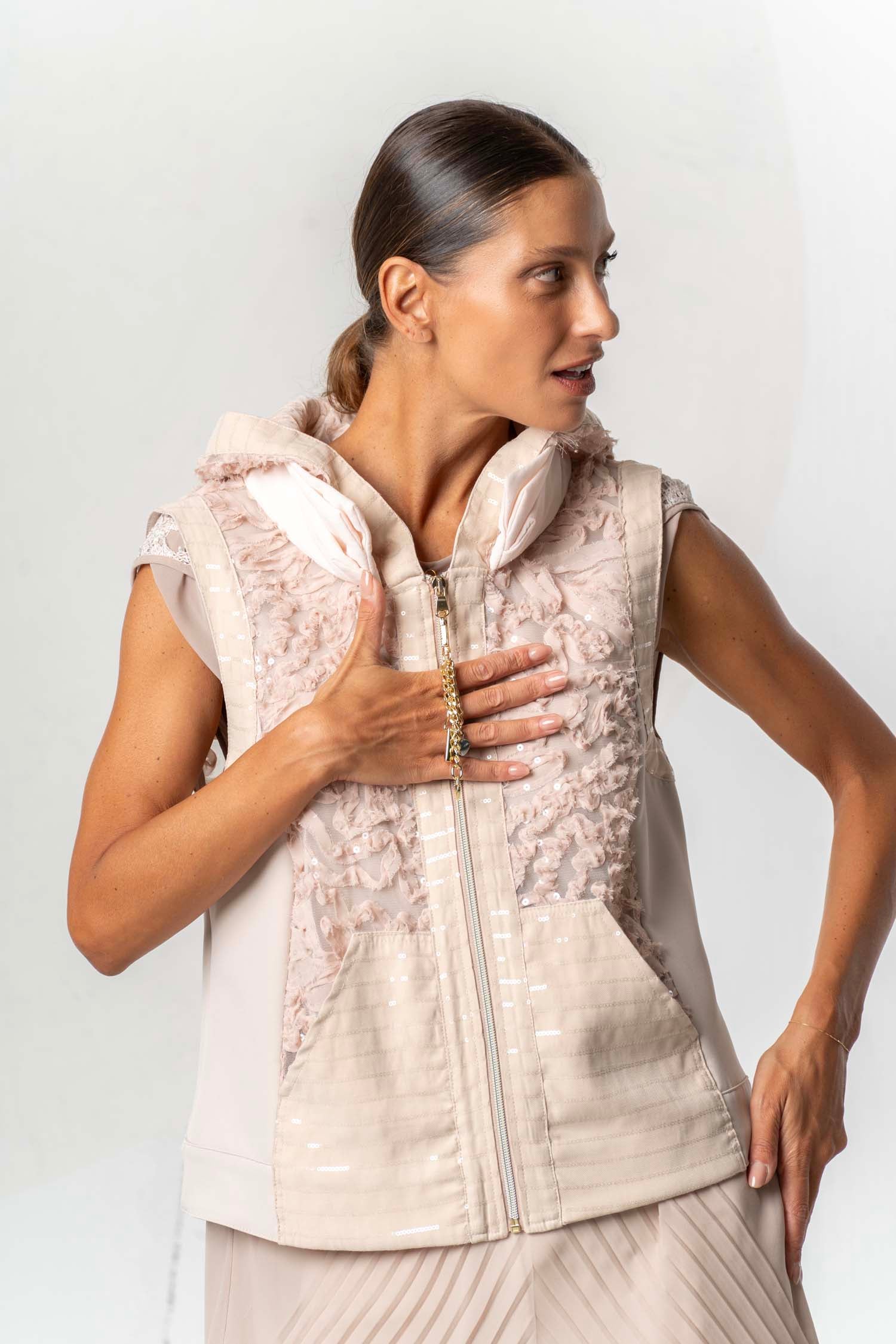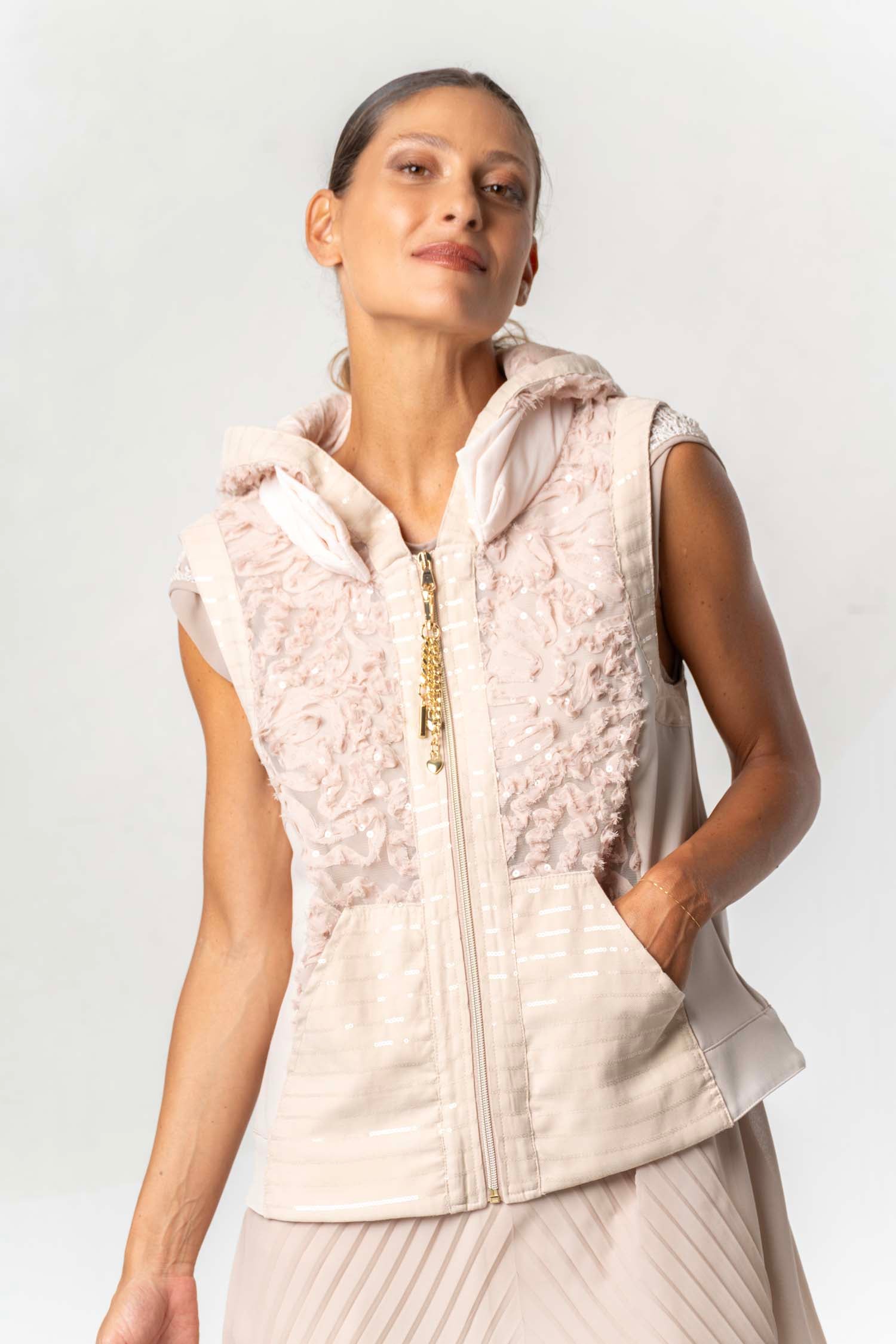 Diese stilvolle Weste mit Kapuze überzeugt durch ihre feminine Struktur und feine Glanzdetails. Der Materialmix verleiht ihr eine edle Leichtigkeit, während der Reißverschluss und die aufgesetzten Taschen für Komfort sorgen. Vielseitig kombinierbar – ideal als elegantes Highlight für moderne Layering-Looks.