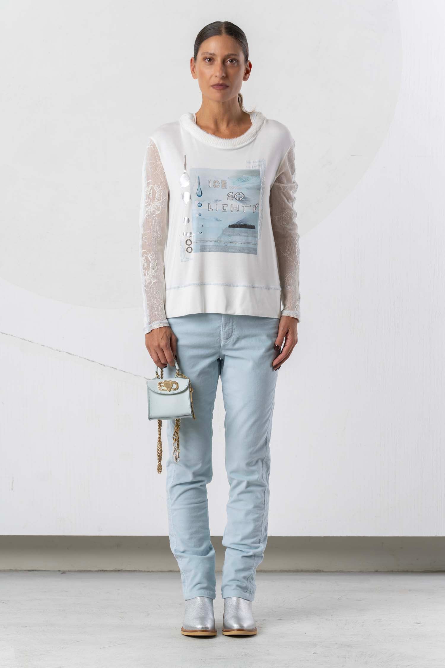 Dieses stylische Sweatshirt verbindet ein frisches Weiß mit zartem Hellblau und überzeugt durch seine transparente Spitzenärmel. Die Kapuze sorgt für einen lässigen Look, während die feinen Spitzendetails dem Oberteil eine elegante Note verleihen. Ideal für modebewusste Trägerinnen, die Komfort mit feminine Raffinesse kombinieren möchten.