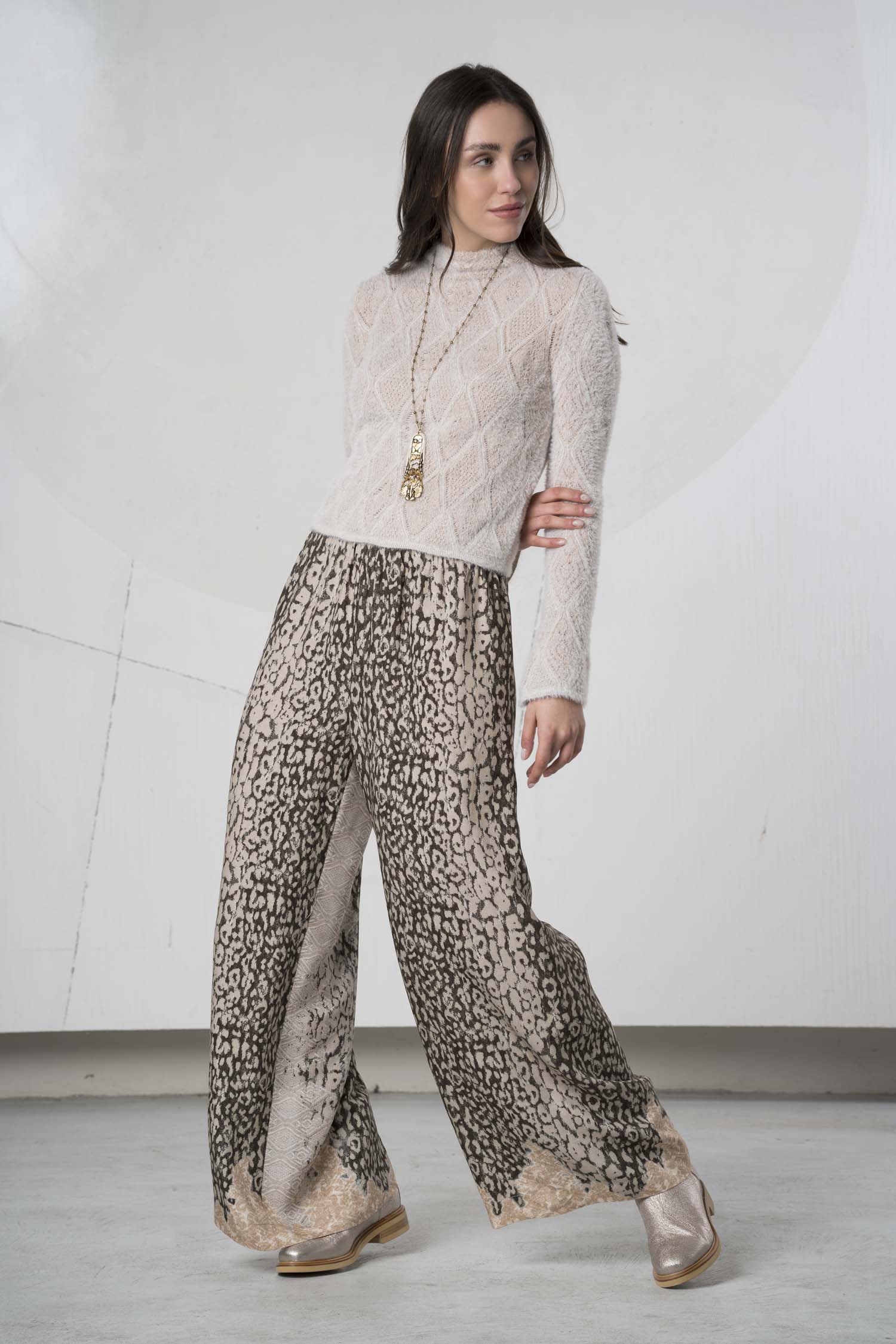 Diese stilvolle Freizeithose besticht durch ihren locker sitzenden Schnitt und das weite Bein, das für Bewegungsfreiheit und Komfort sorgt. Die angesagte Leopardenoptik verleiht jedem Look eine modische Note, während das angenehme Material hohen Tragekomfort garantiert. Ideal für entspannte Tage mit einem Hauch von Eleganz.