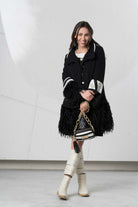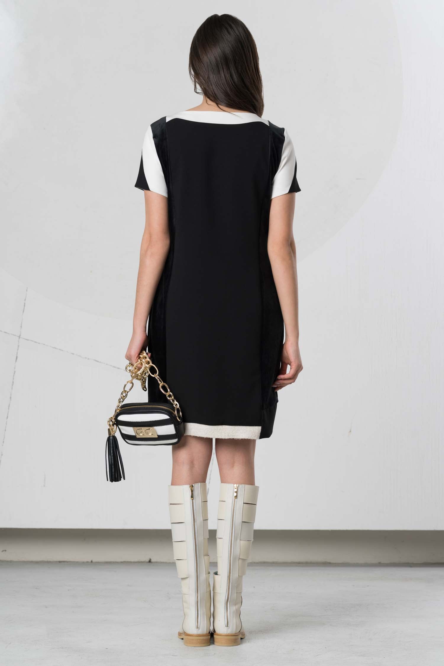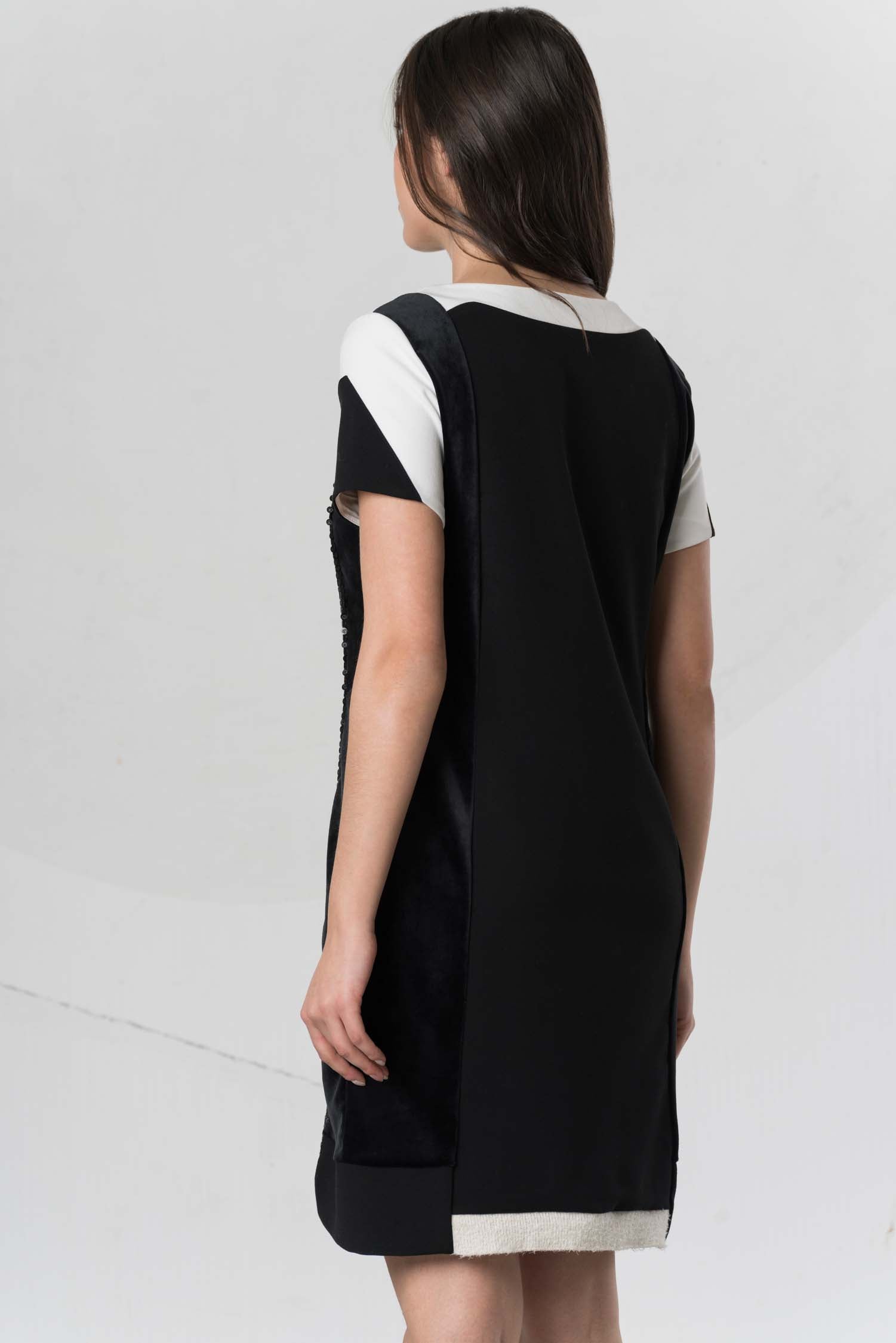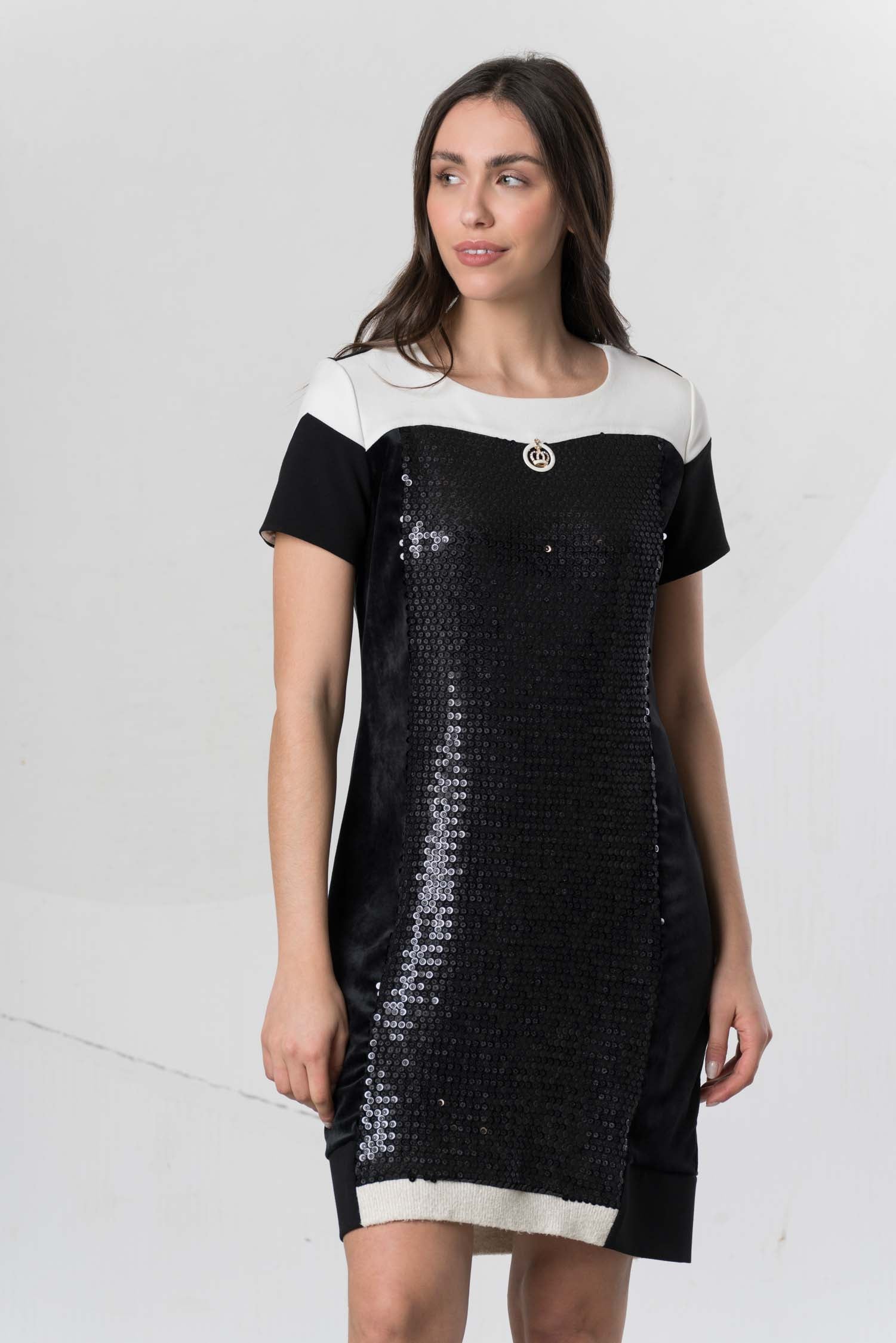 Dieses moderne knielange Kleid präsentiert sich in elegantem Schwarz mit weißen Applikationen, die für dezente Kontraste sorgen. Die kurzen Ärmel und die glitzernden Pailletten verleihen dem Design eine raffinierte Note, ideal für stilbewusste Auftritte mit einem zeitgemäßen Look.