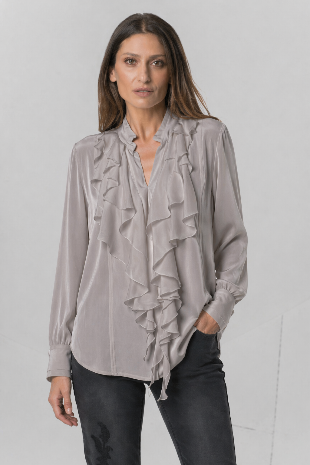 Diese moderne Bluse mit langen Ärmeln besticht durch feine Rüschenakzente, die ihrem klaren Design eine elegante Note verleihen. Sie verbindet zeitgemäßen Stil mit Komfort und eignet sich ideal für anspruchsvolle Business- oder Freizeitlooks. Die sorgfältige Verarbeitung sorgt für eine perfekte Passform und langlebige Qualität.