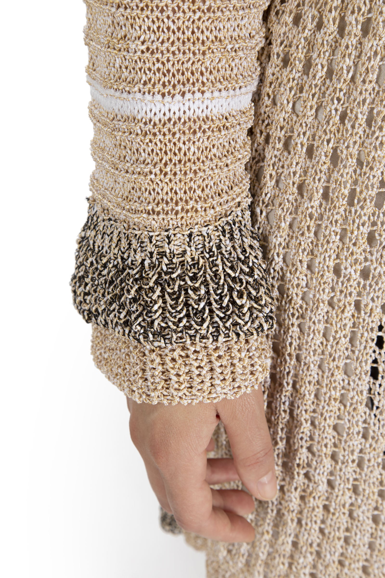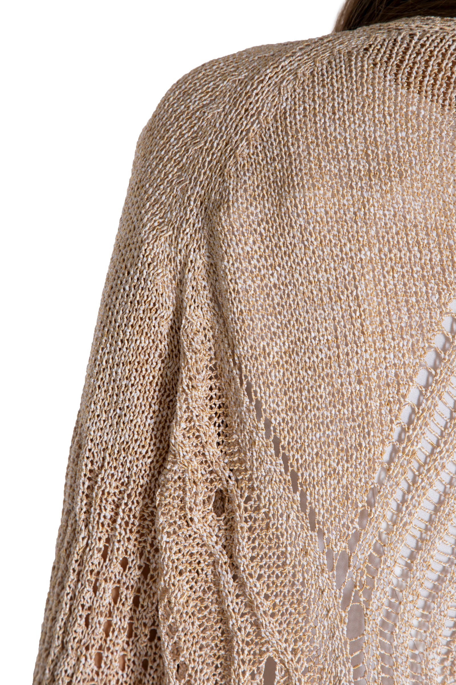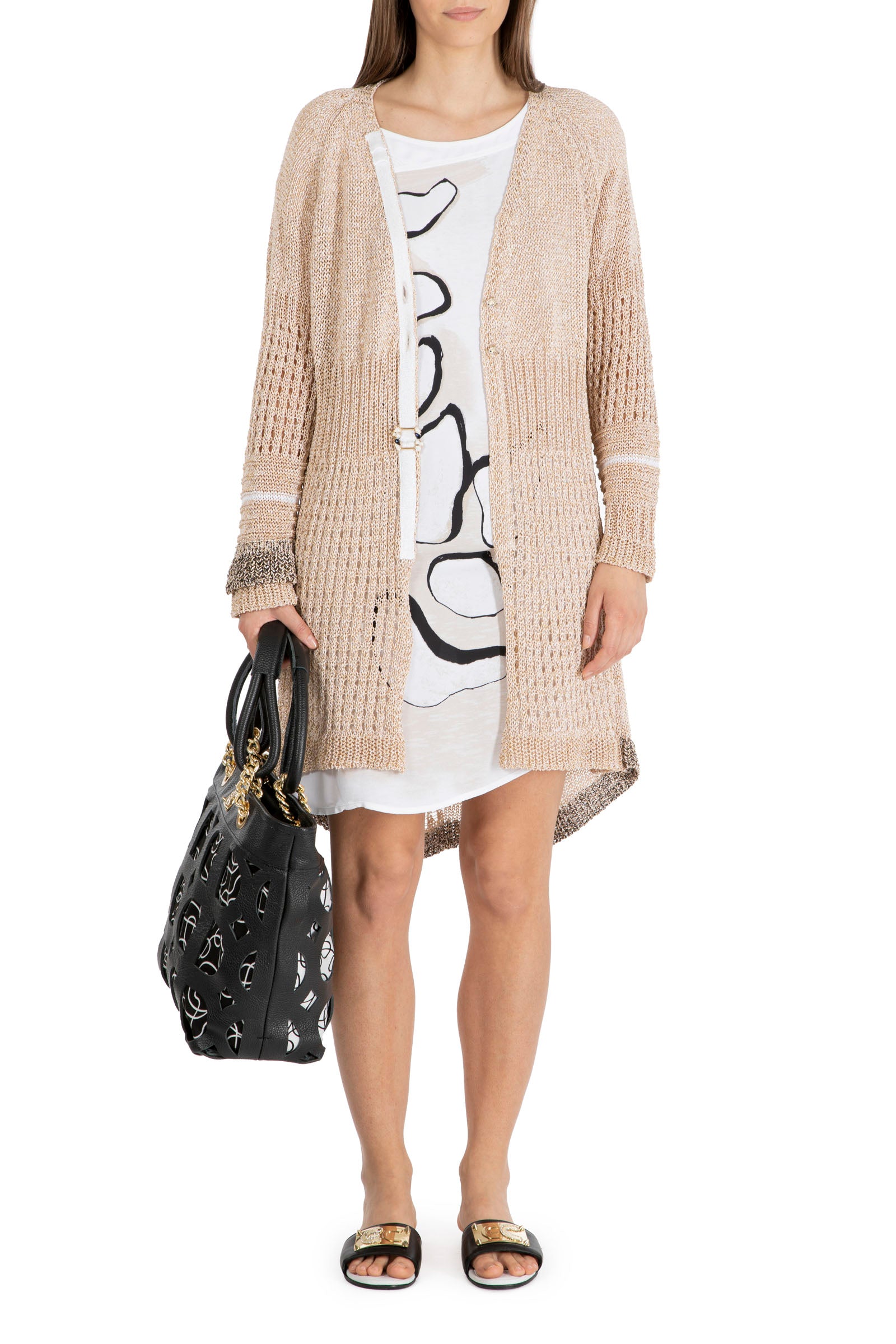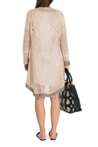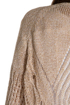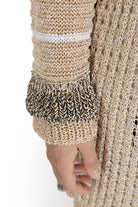 Diese knielange Strickjacke in Beige überzeugt mit ihrem markanten großen Strickmuster, das Struktur und Stil vereint. Der großzügige Schnitt sorgt für eine schmeichelhafte Passform und bietet zugleich angenehme Wärme an kühleren Tagen. Vielseitig kombinierbar, eignet sie sich perfekt für elegante wie auch lässige Looks.