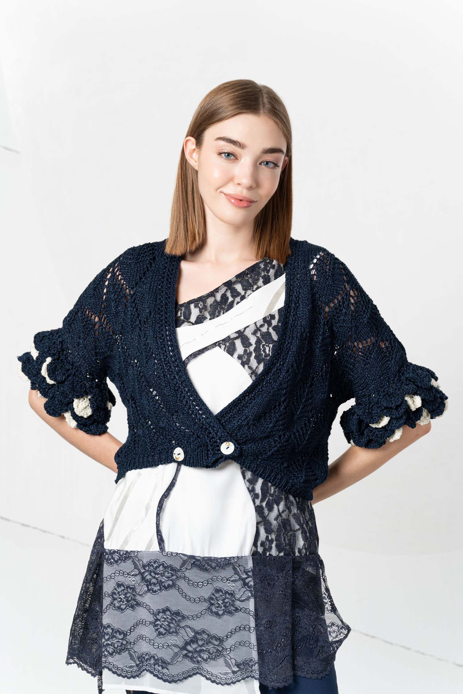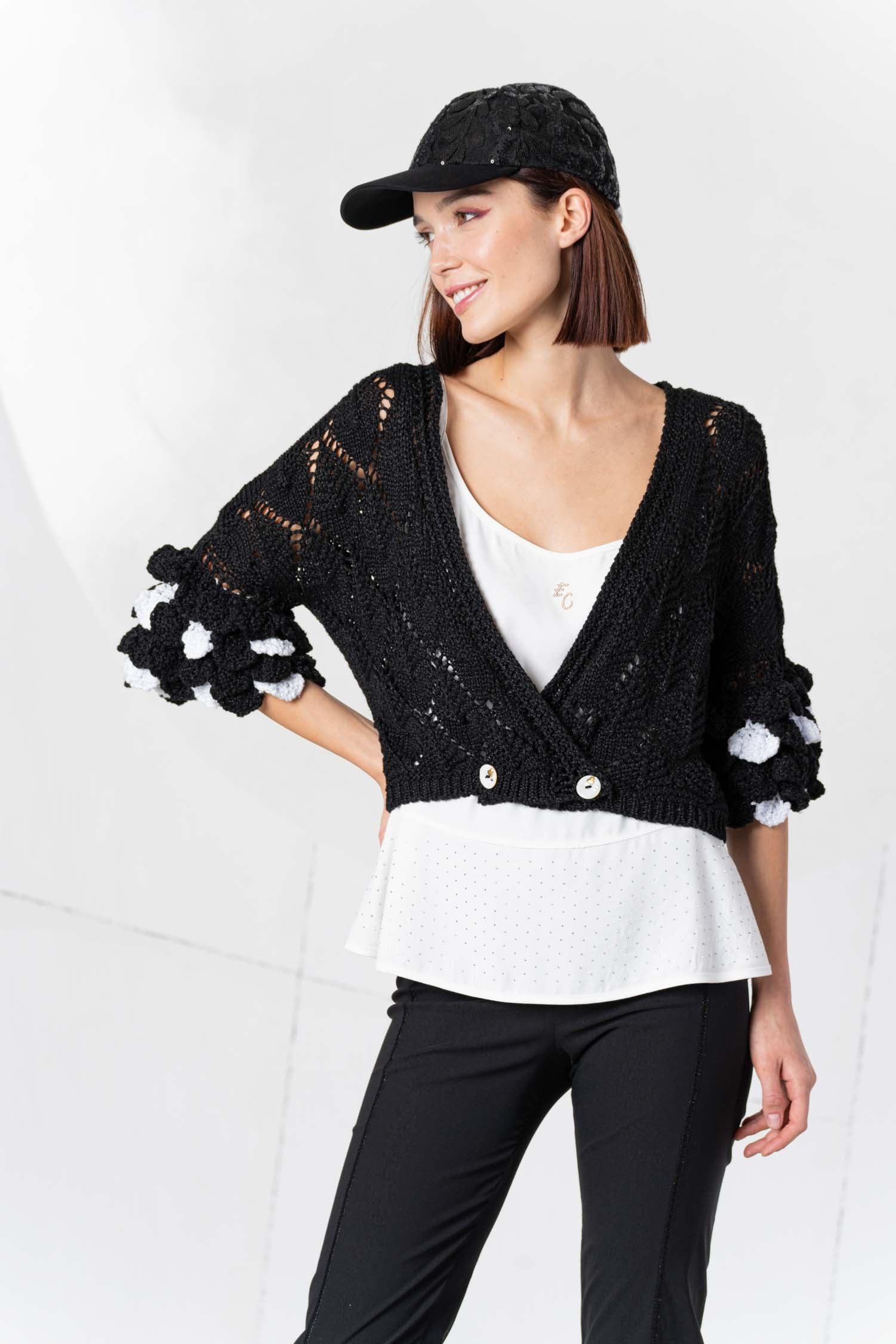 Verleihen Sie Ihrem Look mit der ELISA CAVALETTI kurzen Strickjacke in Schwarz und Dunkelblau eine elegante Note. Mit hochwertigem Strickmaterial schafft sie ein kuscheliges Tragegefühl und verleiht Ihrem Outfit einen Hauch von Luxus. Perfekt für kühle Frühlingsabende und sommerliche Tage am Meer.