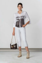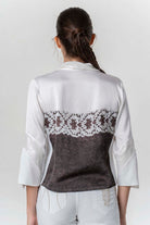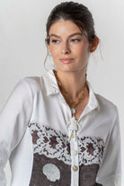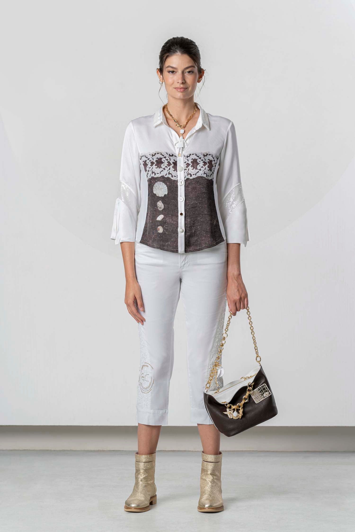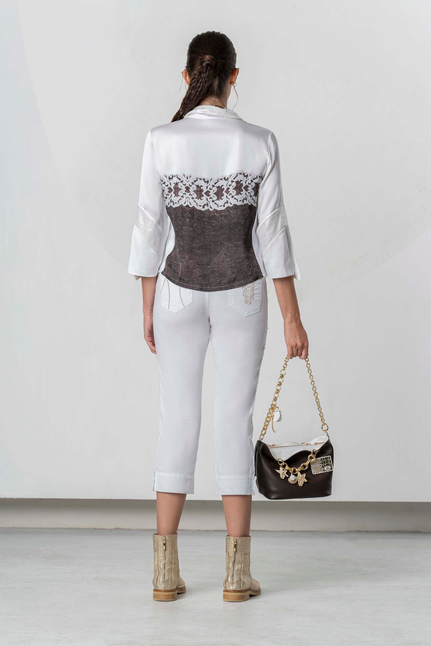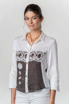 Elegante Bluse mit raffiniertem Materialmix und dekorativem Frontdetail. Der klassische Kragen und die 3/4-Ärmel sorgen für eine feminine, stilvolle Ausstrahlung – vielseitig kombinierbar für Alltag und besondere Anlässe.