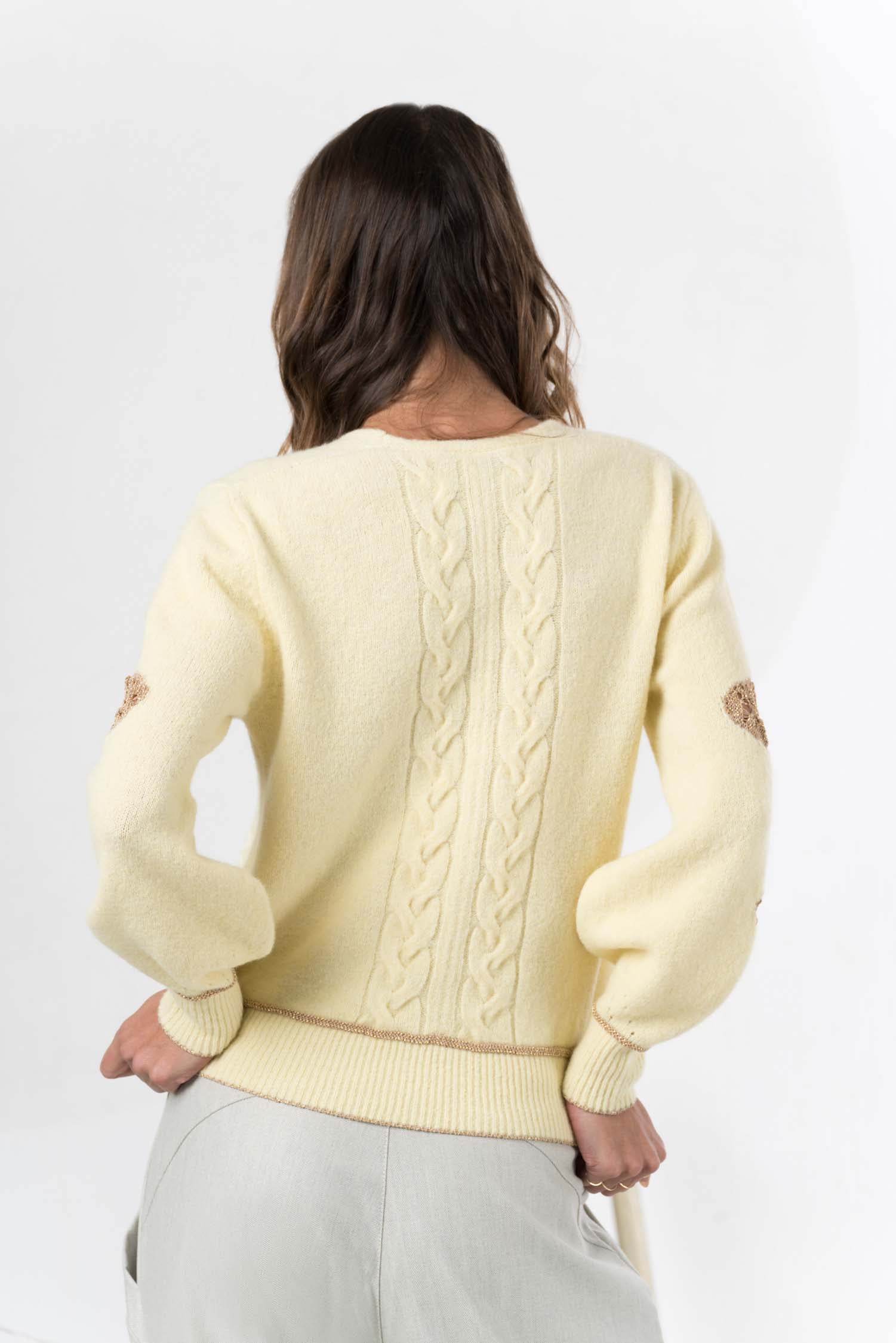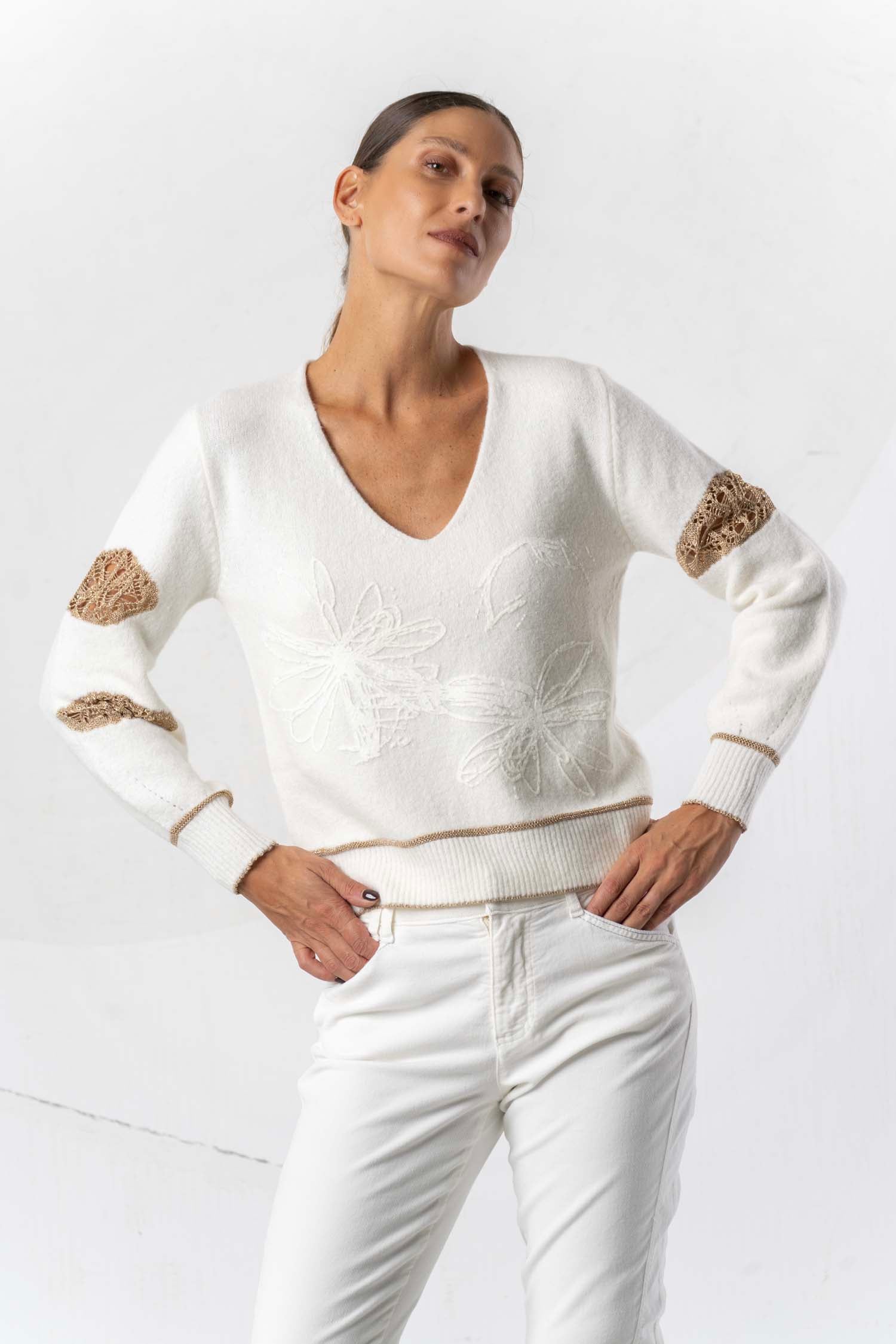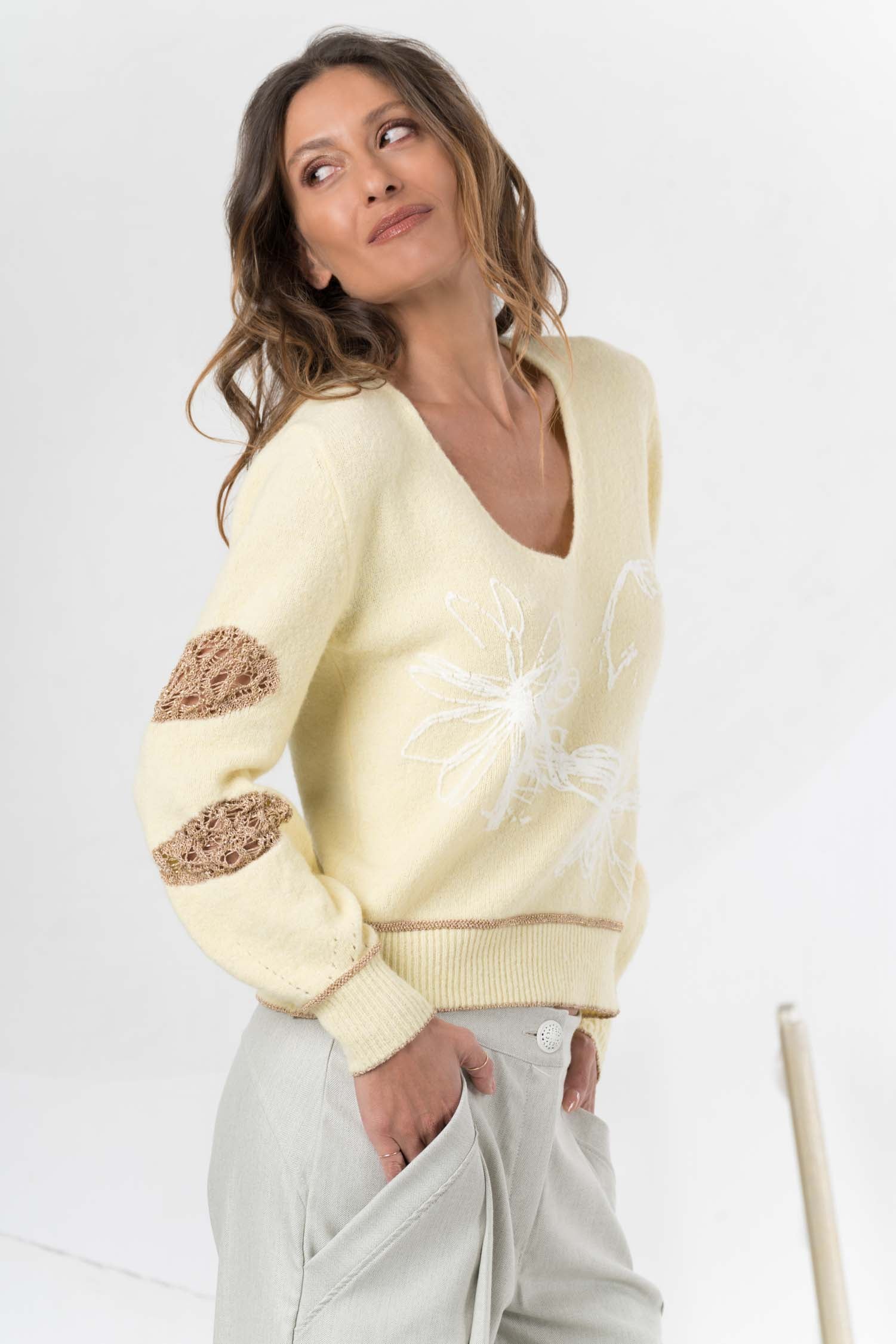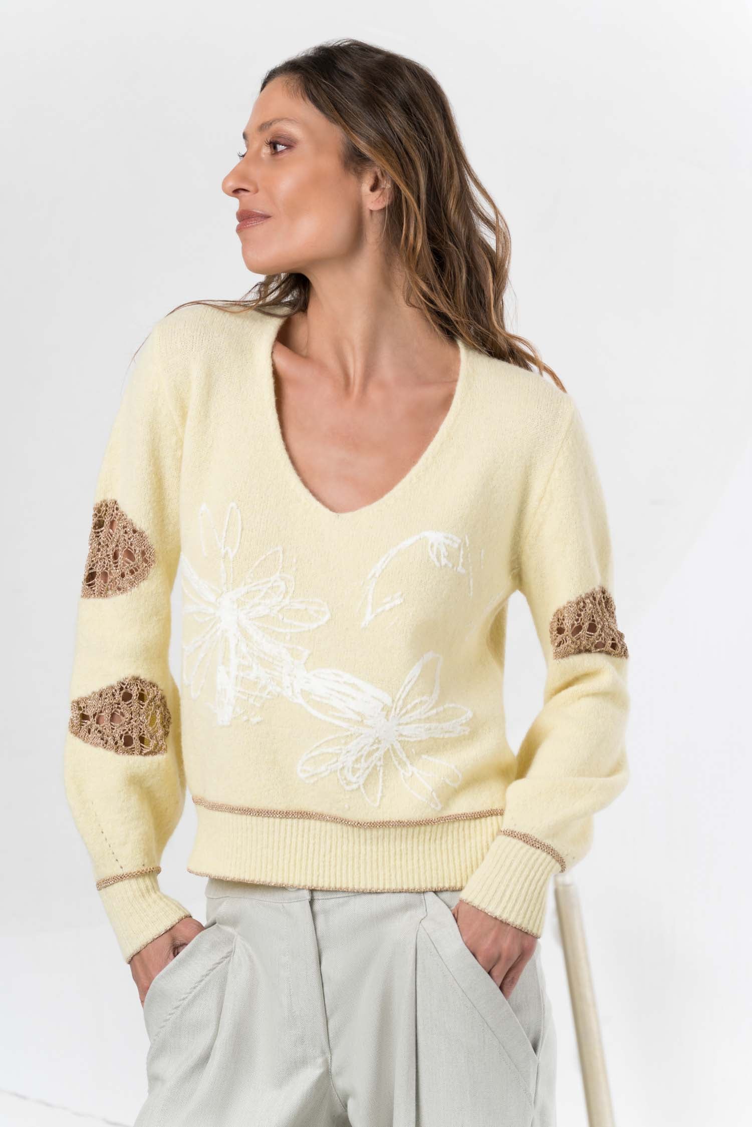 Dieser Strickpullover vereint kuschelige Weichheit mit einem warmen Weiß- und Gelbton und vielfältigen Mustern, die ihm eine lebendige und individuelle Note verleihen. Gefertigt aus hochwertiger Wolle, sorgt das Material für angenehme Wärme und Atmungsaktivität – ideal für kühle Tage mit Anspruch an Komfort und Stil.