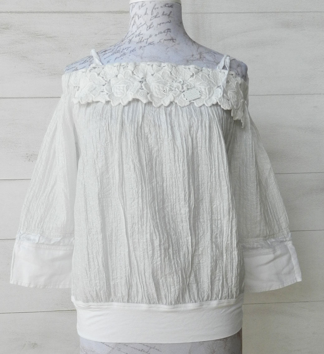 Erkunden Sie die verführerische Eleganz der ELISA CAVALETTI Bluse Bianco. Mit schulterfrei, Spitze und femininen Rüschen ist diese weiße Bluse perfekt für jeden Anlass. Betonen Sie Ihre Schönheit und holen Sie sich dieses unverzichtbare Stück in Ihren Kleiderschrank.