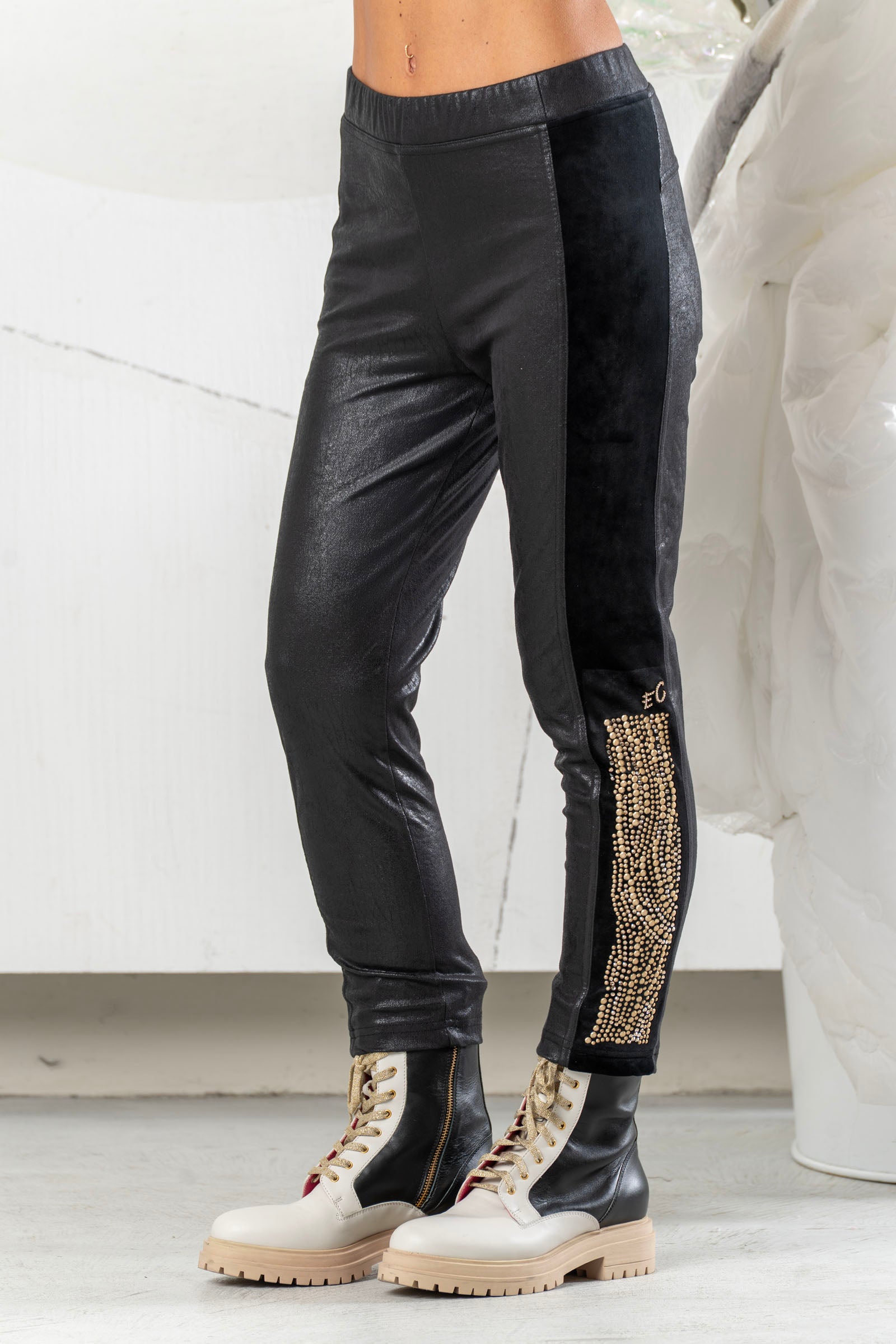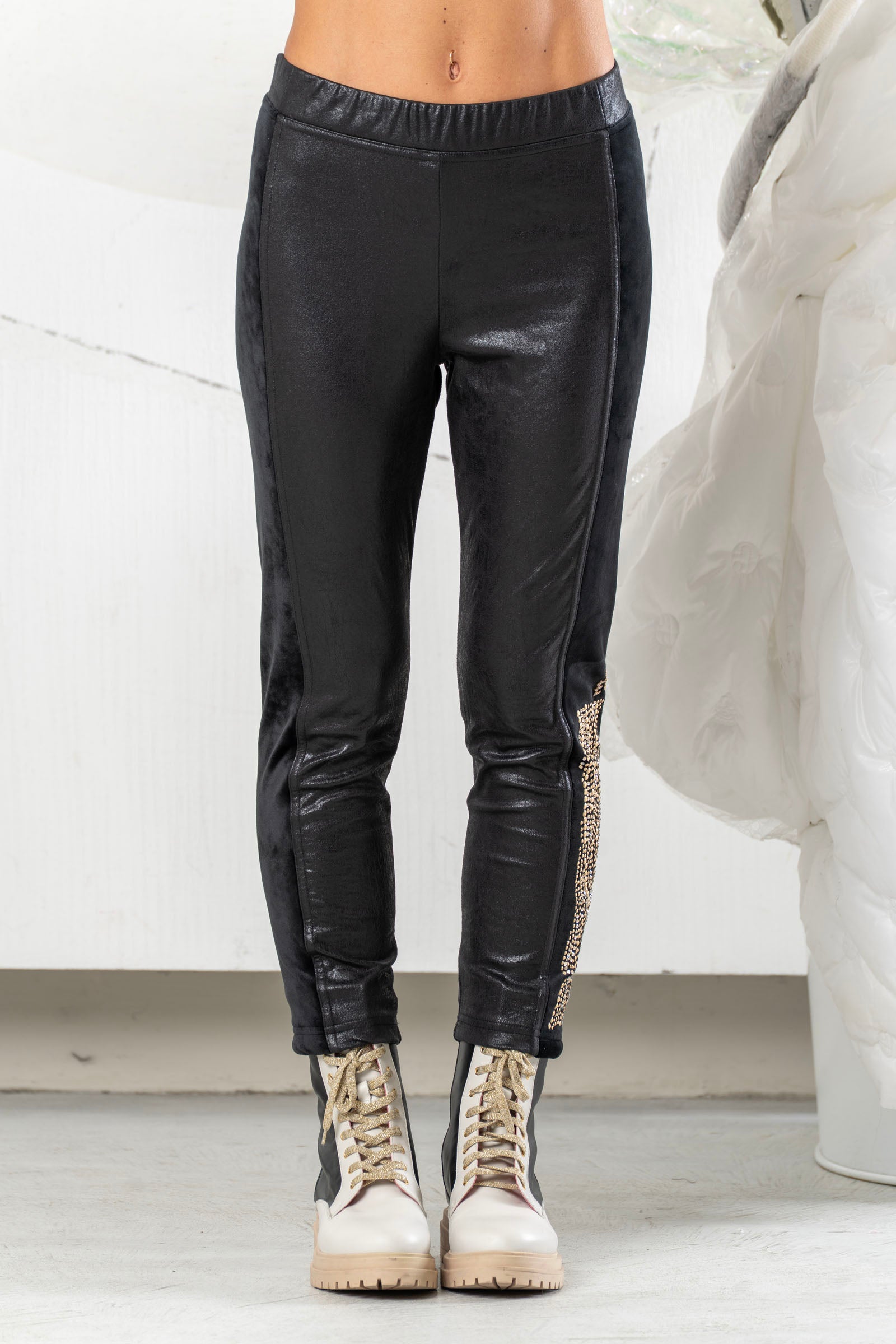Diese schmal geschnittene Hose überzeugt mit einer edlen Lederoptik und hohem Tragekomfort durch den elastischen Bund. Der seitliche Zierstreifen mit feinen Glanzdetails setzt einen modernen Akzent und streckt optisch das Bein. Ein stilvoller Allrounder für lässige wie auch elegante Looks.