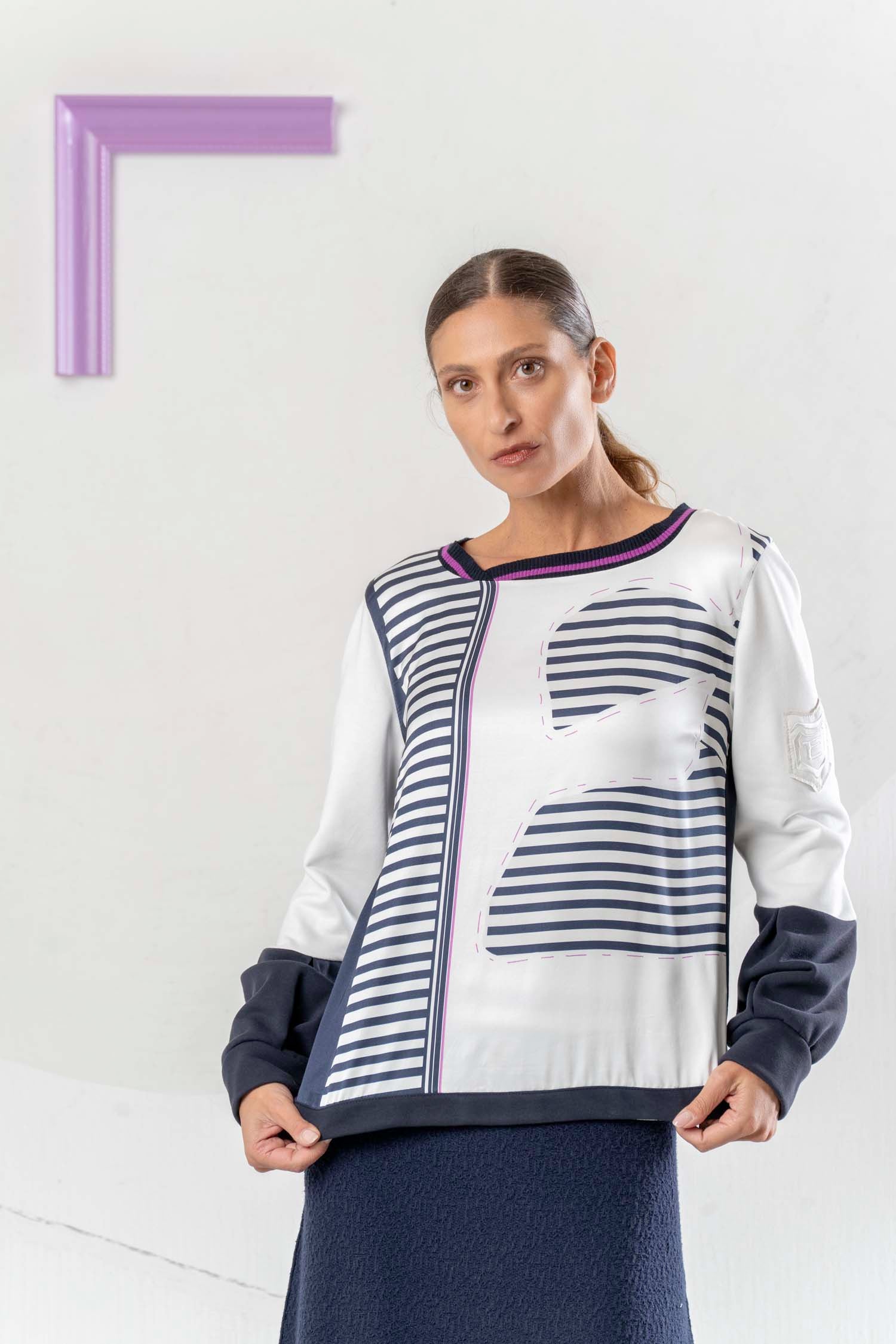 Ein unverzichtbares Essential für jeden Kleiderschrank - das ELISA CAVALETTI Sweatshirt St. Stripe! Das Shirt in den Farben blau und weiß ist mit trendigen Streifen verziert und verleiht jedem Outfit einen sportlich-eleganten Touch. Perfekt für den lässigen Alltags-Look oder für besondere Anlässe. Machen Sie eine Aussage mit diesem Must-Have-Teil!