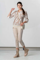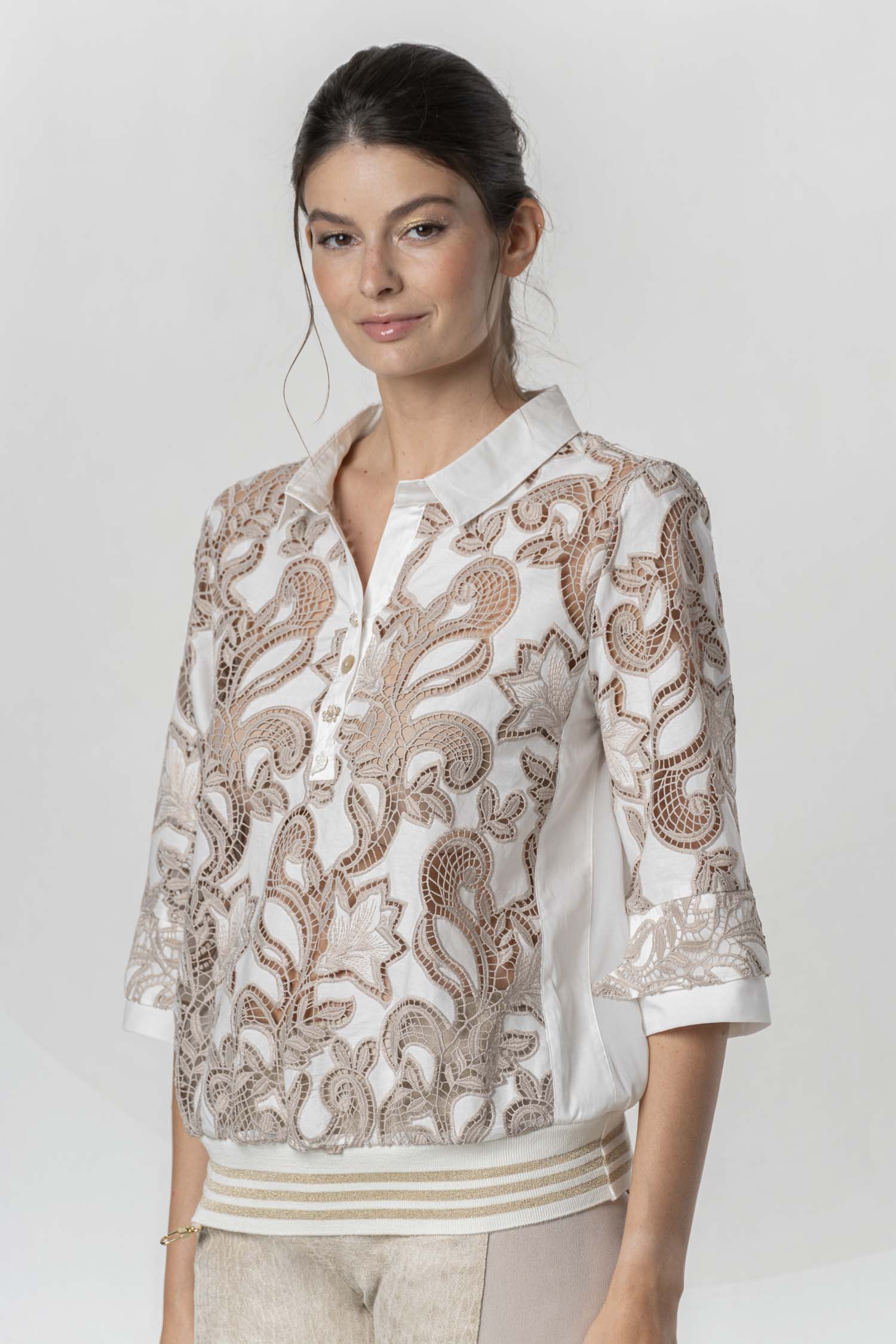 Diese elegante Bluse überzeugt durch ihre feine, florale Spitze und einen zeitlosen Schnitt. Der klassische Kragen und die ¾-Ärmel verleihen ihr eine stilvolle Note, während das leichte Material für hohen Tragekomfort sorgt. Perfekt für feminine Looks – sowohl im Alltag als auch zu besonderen Anlässen.