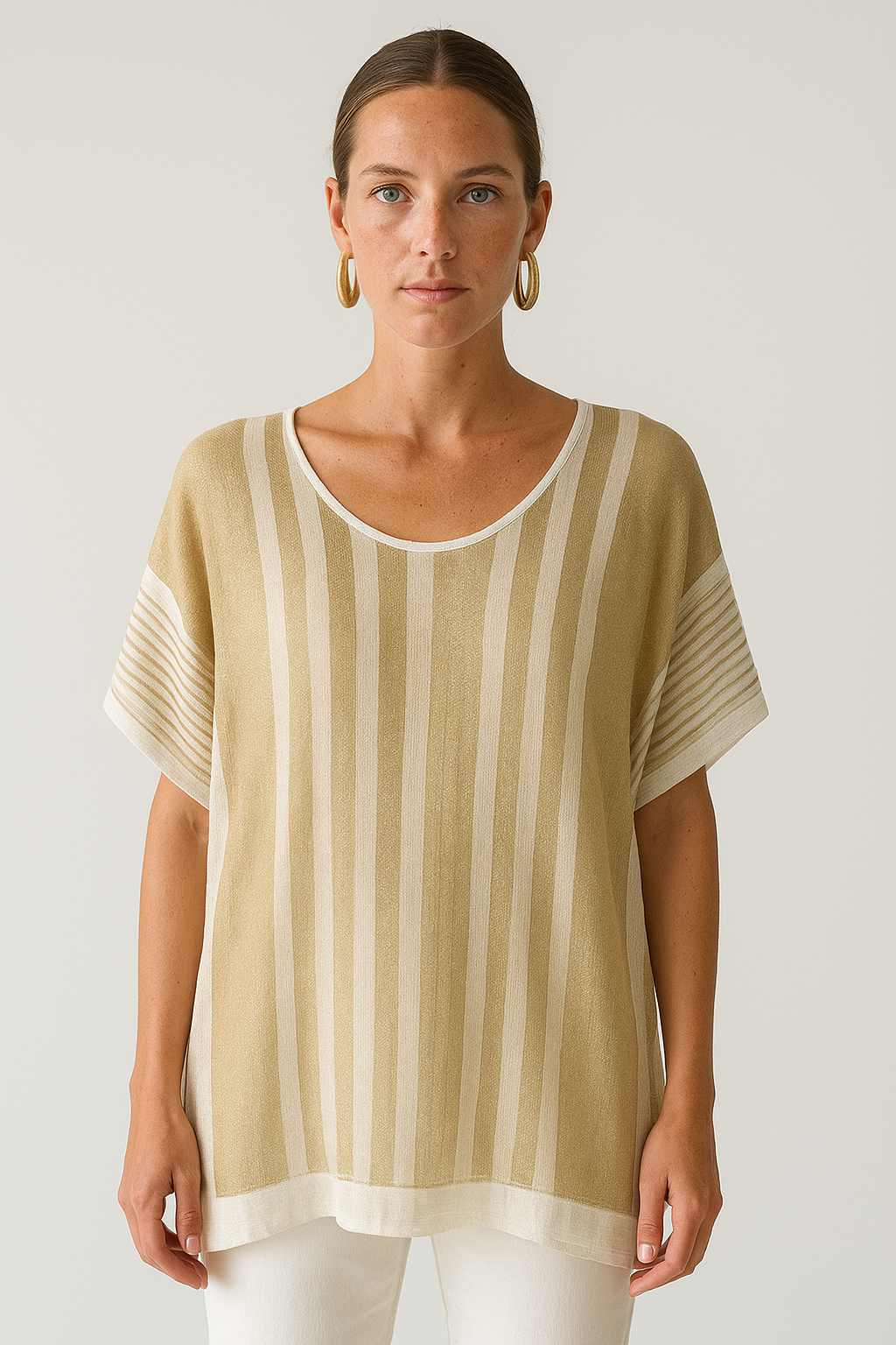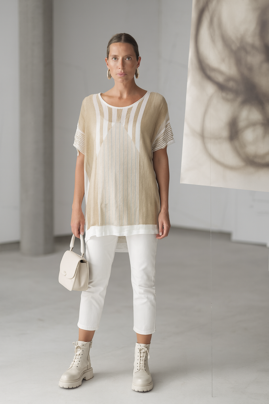Elegantes Strickshirt in warmem Beige mit charaktervollen Streifen auf den 3/4 Ärmeln. Das Risacca Purezza besticht durch seine zeitlose Farbgebung und das raffinierte Ärmeldesign – perfekt für mühelose Eleganz im Alltag. Die hochwertige Strickqualität sorgt für angenehmen Tragekomfort und Langlebigkeit. Ein vielseitiges Lieblingsstück, das sich mühelos zu Ihrer bestehenden Garderobe kombinieren lässt und jeden Look aufwertet.