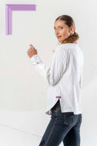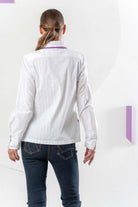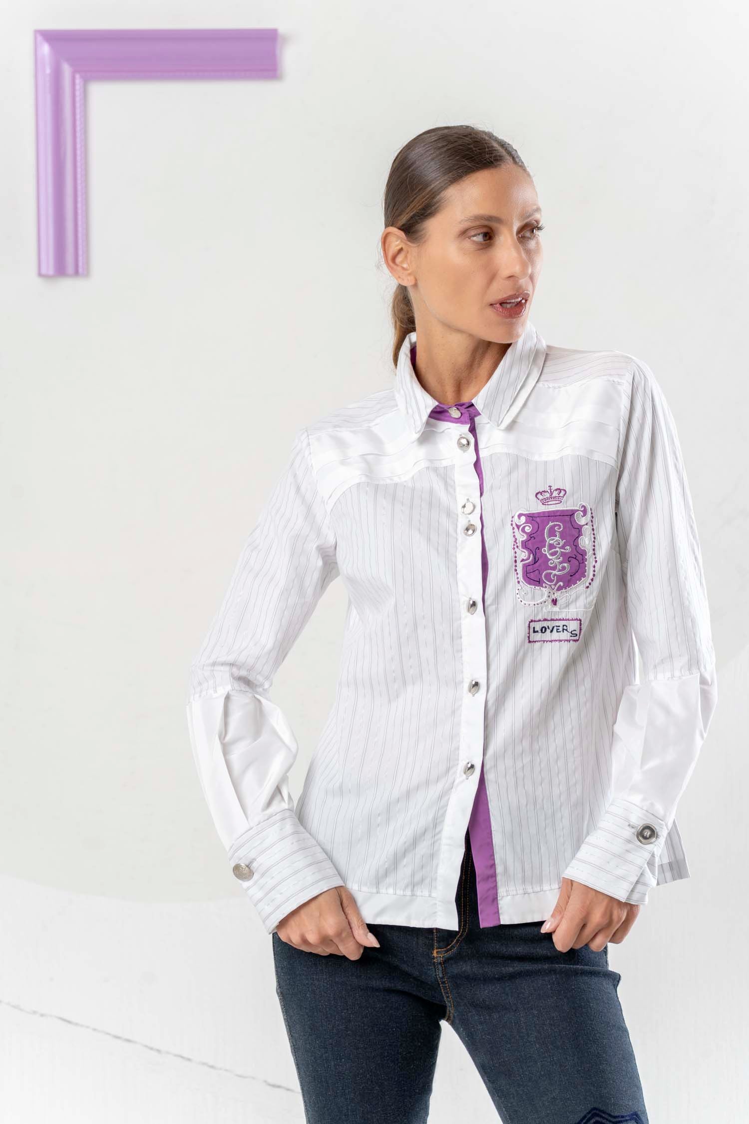 Entdecken Sie die Weiblichkeit mit der ELISA CAVALETTI Bluse "Incontro Femminile"! Die gestreifte Bluse in Weiß besticht durch lila Applikationen, die für einen femininen Touch sorgen. Egal ob im Büro oder in der Freizeit, diese Bluse ist der perfekte Begleiter für jede selbstbewusste Frau. Lassen Sie sich von ihrer Eleganz verzaubern und fühlen Sie sich einfach umwerfend.