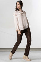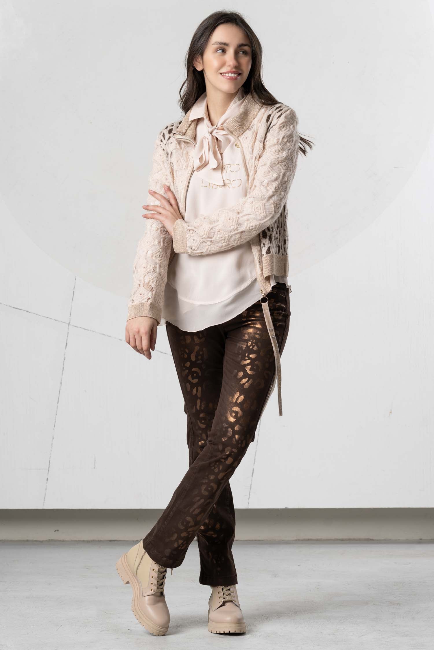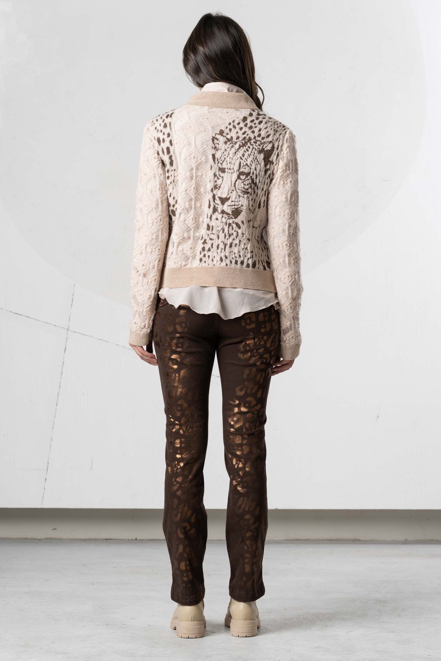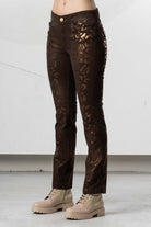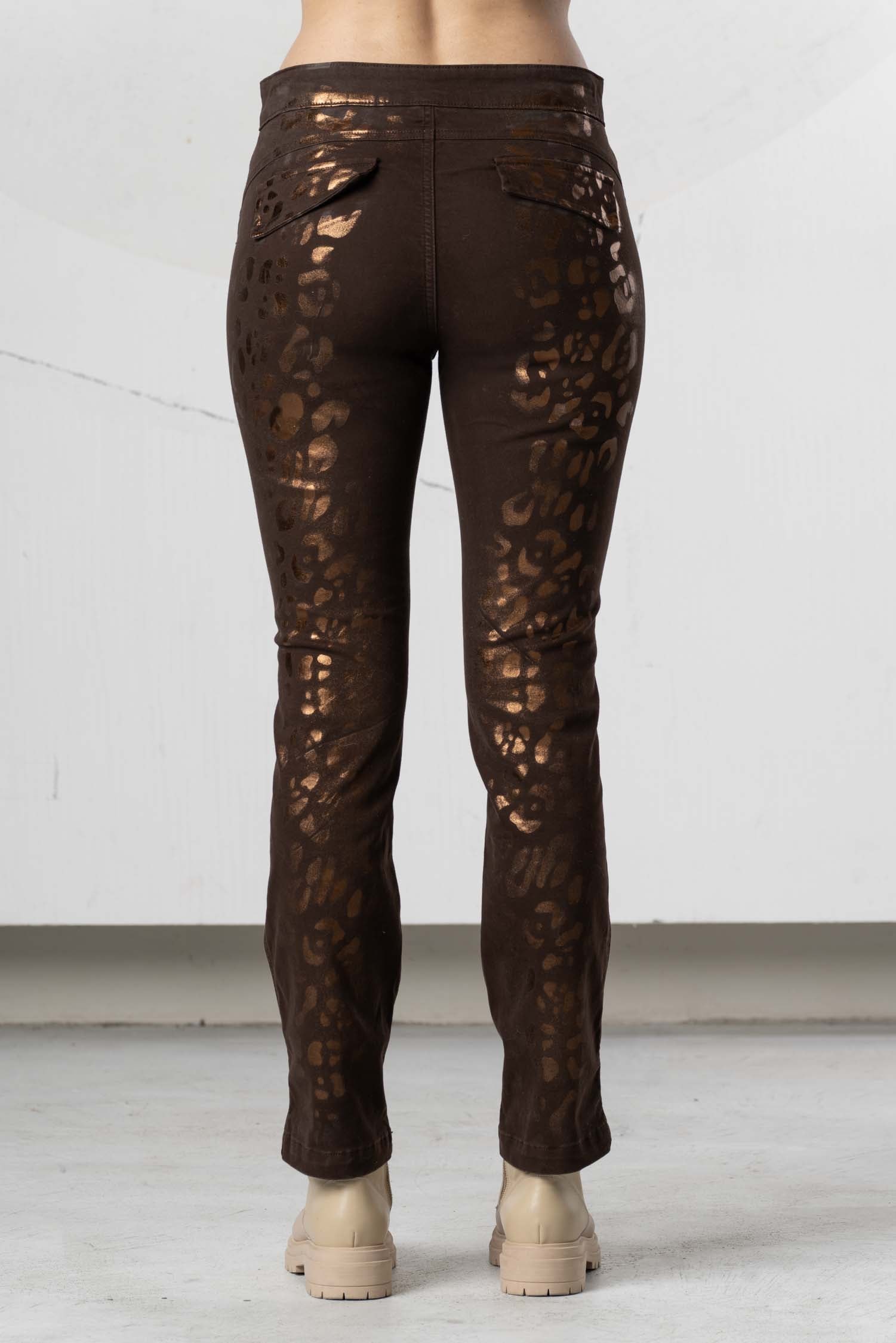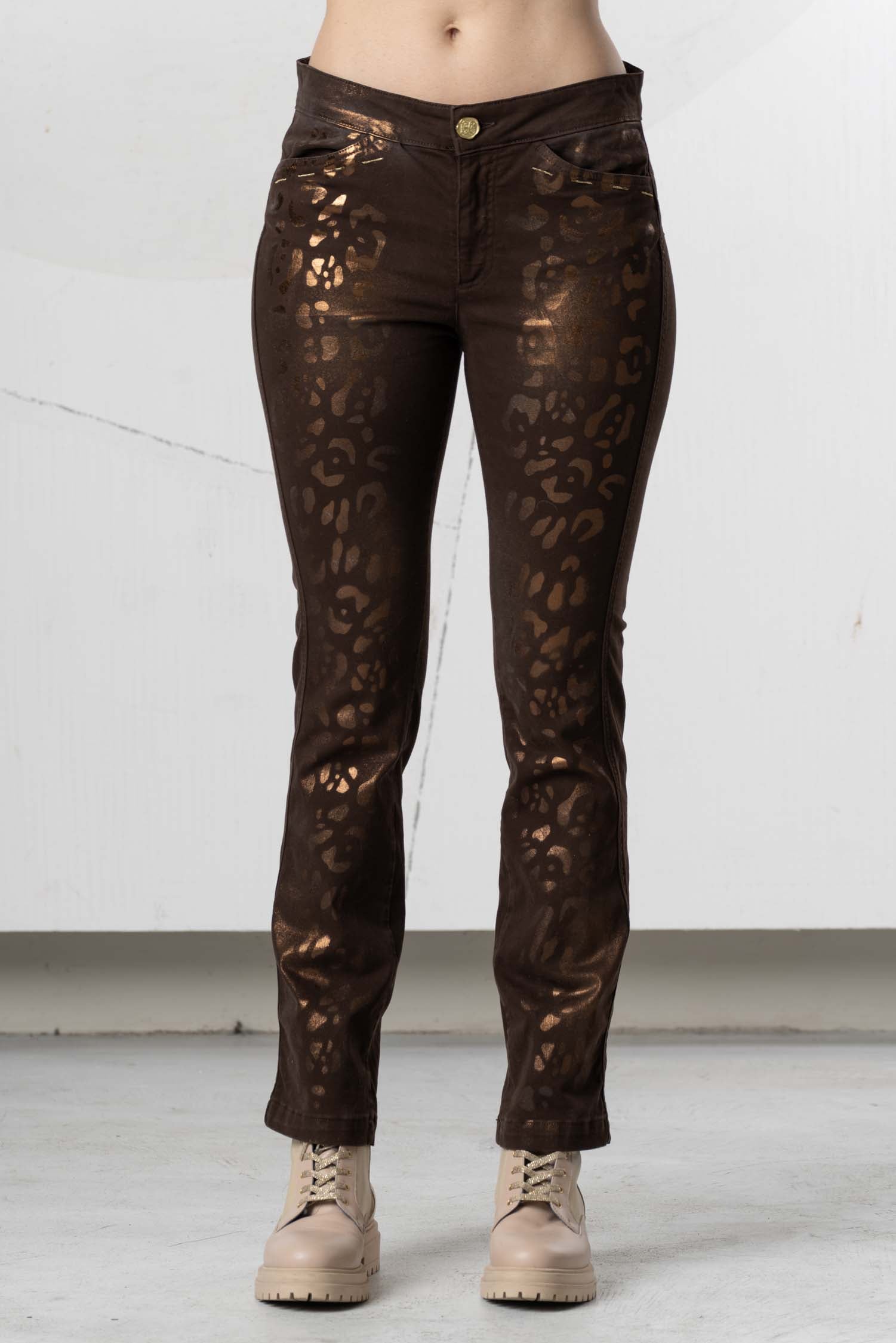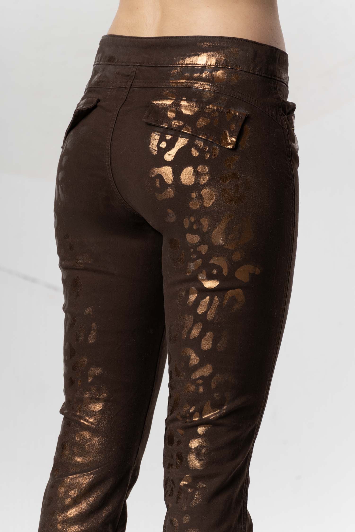 Diese stilvolle Hose präsentiert sich in einem auffälligen Leopardenmuster mit einem eleganten kupferfarbenen Ton. Der mittlere Bund sorgt für eine ausgeglichene Passform, die Komfort und eine moderne Silhouette vereint. Ideal für selbstbewusste Looks mit einem Hauch von Wildheit und Raffinesse.