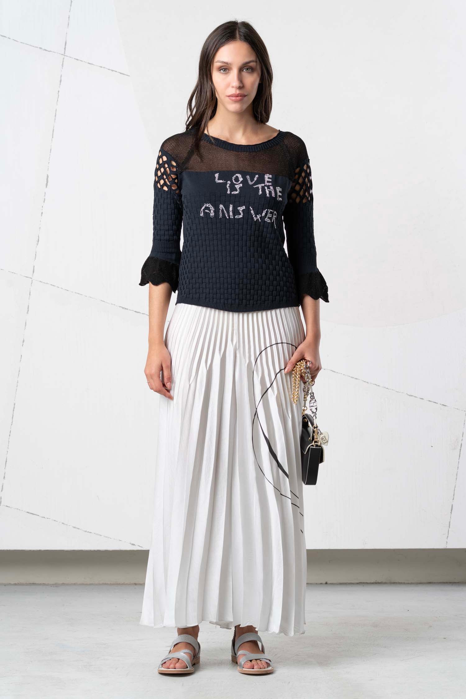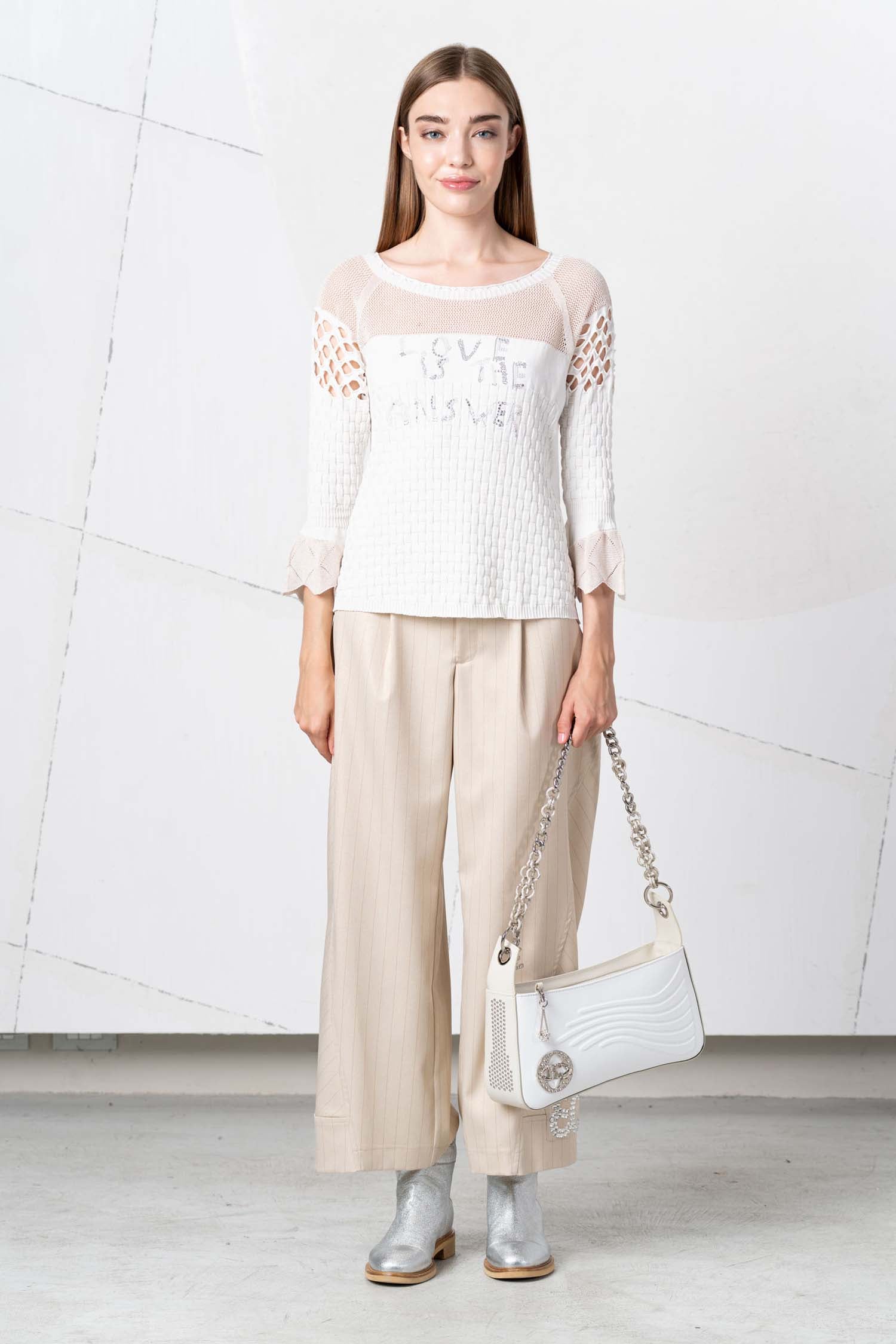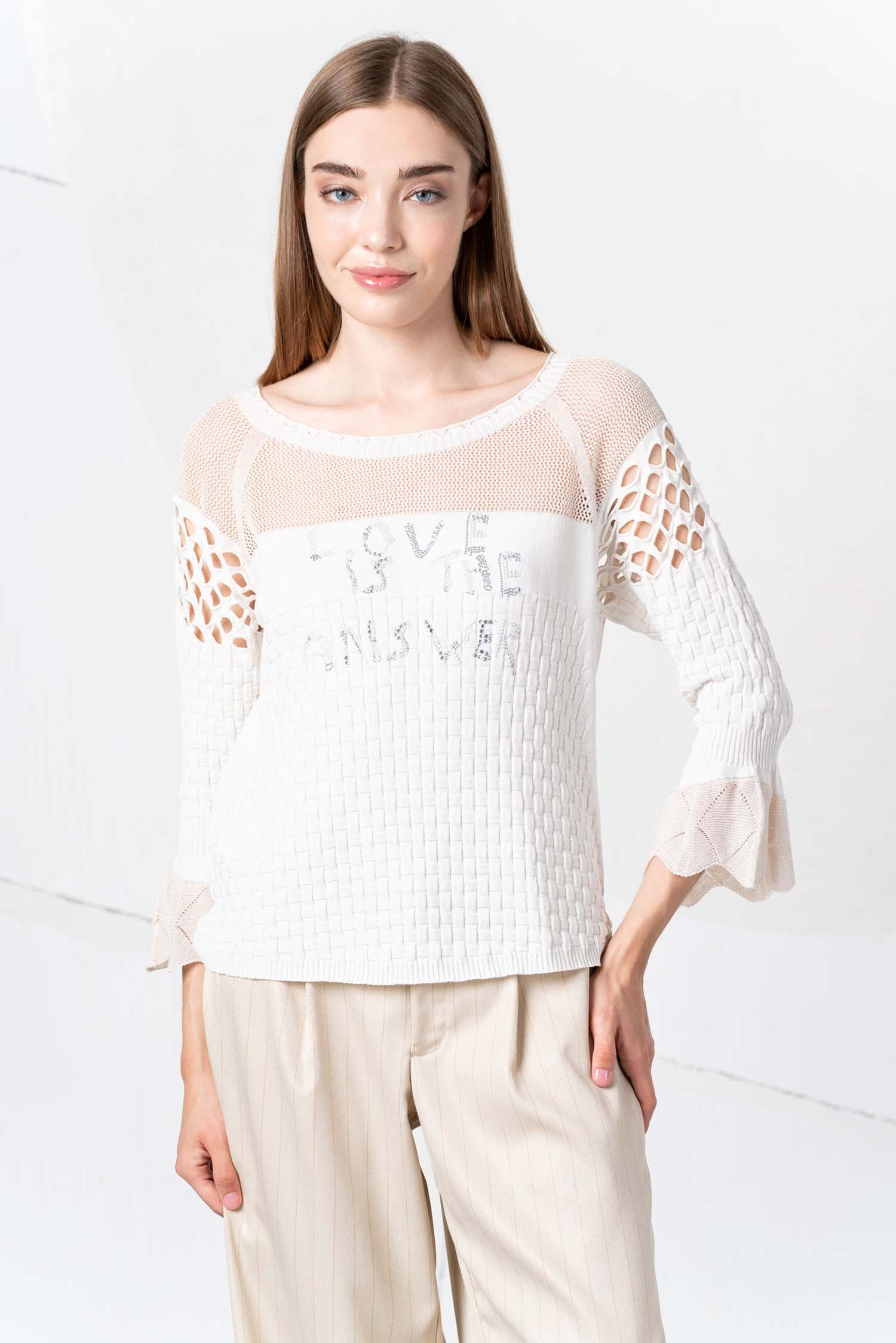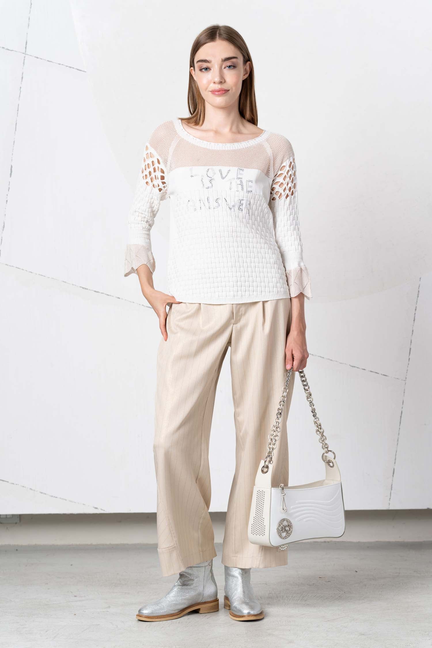 Trage den ELISA CAVALETTI Strickpullover Incontro in Weiß mit seinen stylischen Lochmustern und der silbernen Aufschrift und sei bereit für Aufmerksamkeit und Bewunderung. Ein perfektes Zusammenspiel aus Design und Qualität für einen unvergesslichen Look!