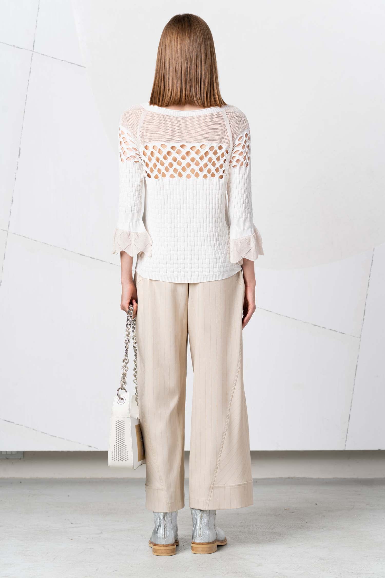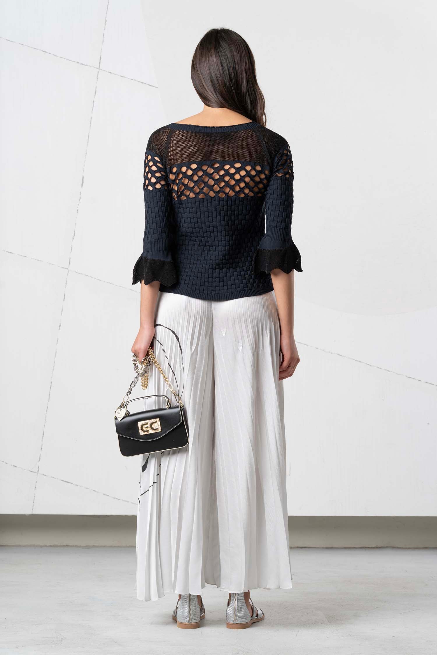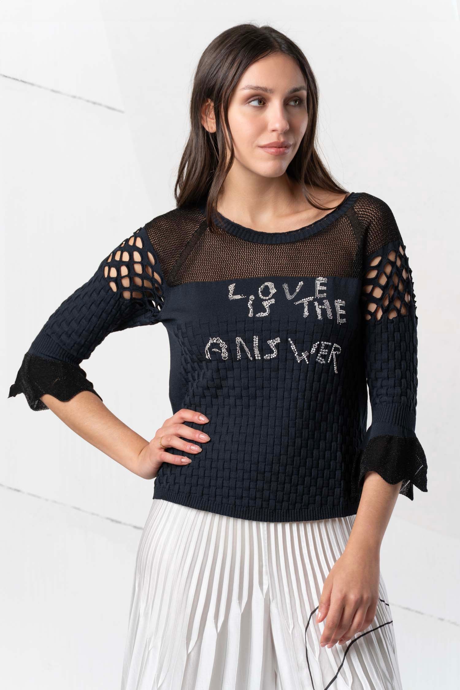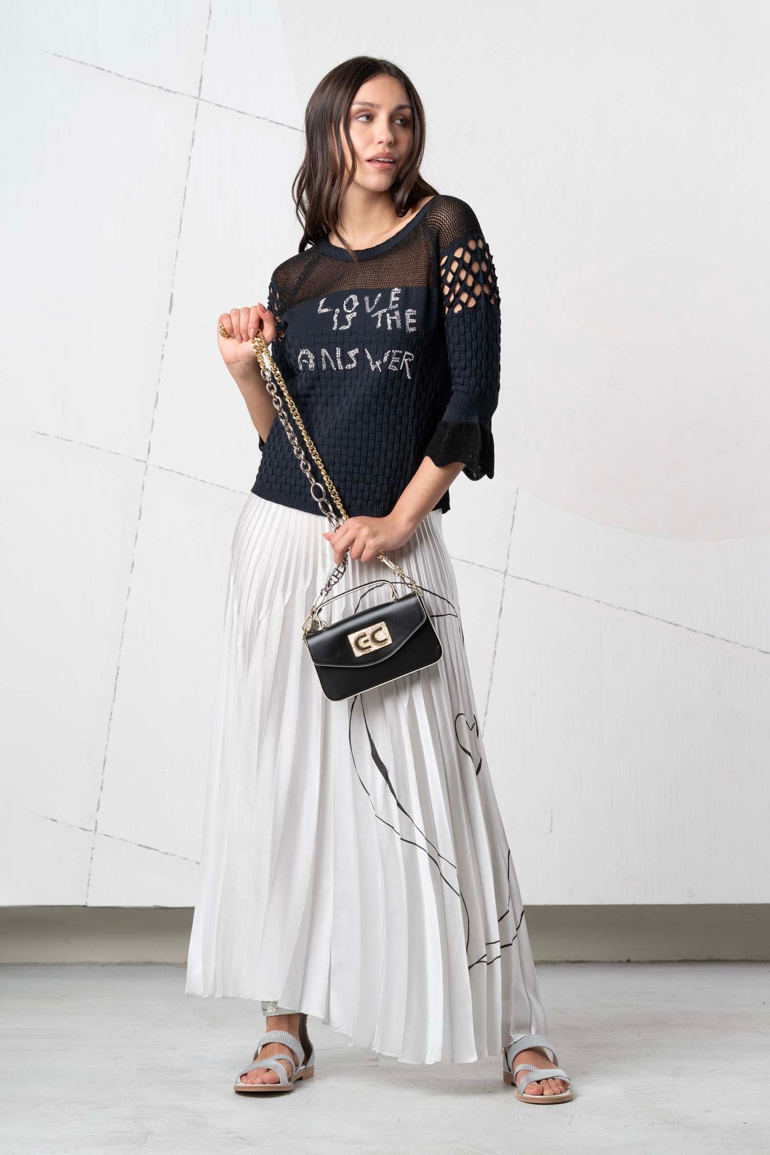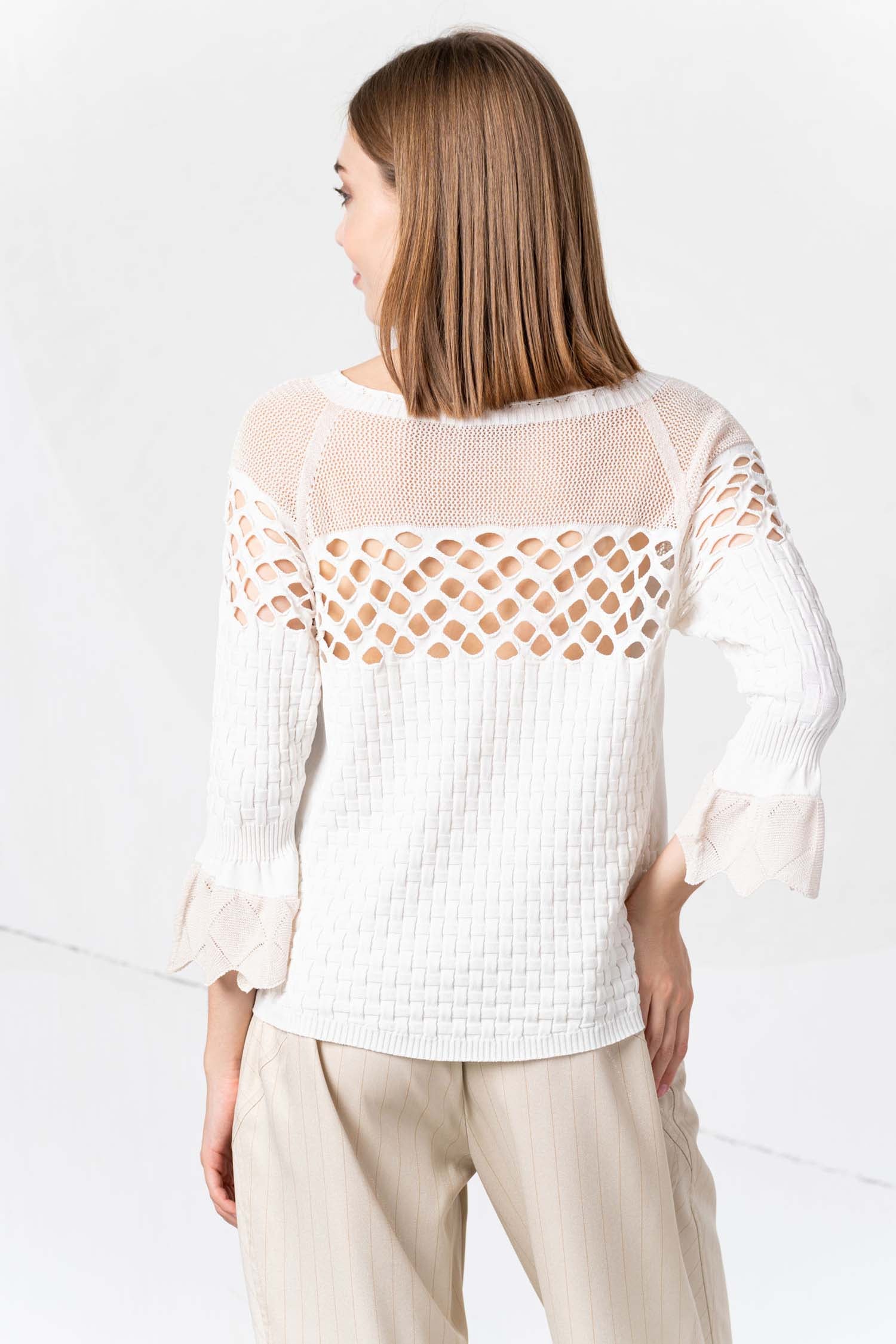 Trage den ELISA CAVALETTI Strickpullover Incontro in Weiß mit seinen stylischen Lochmustern und der silbernen Aufschrift und sei bereit für Aufmerksamkeit und Bewunderung. Ein perfektes Zusammenspiel aus Design und Qualität für einen unvergesslichen Look!