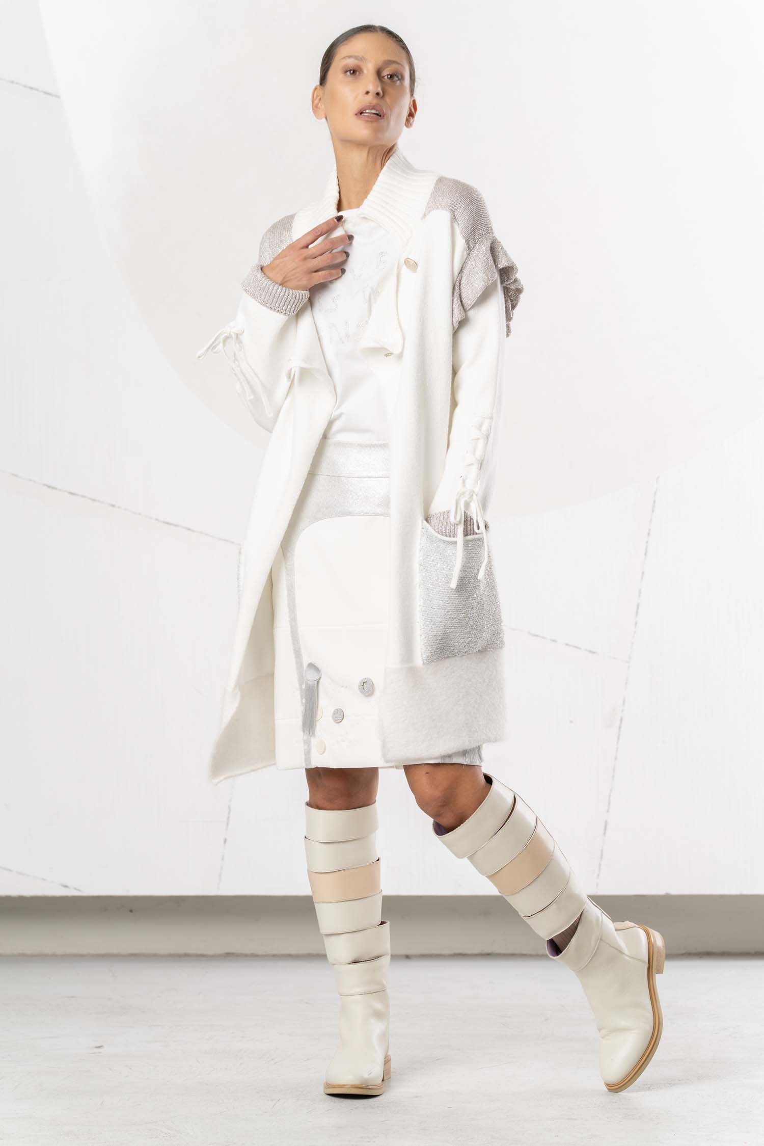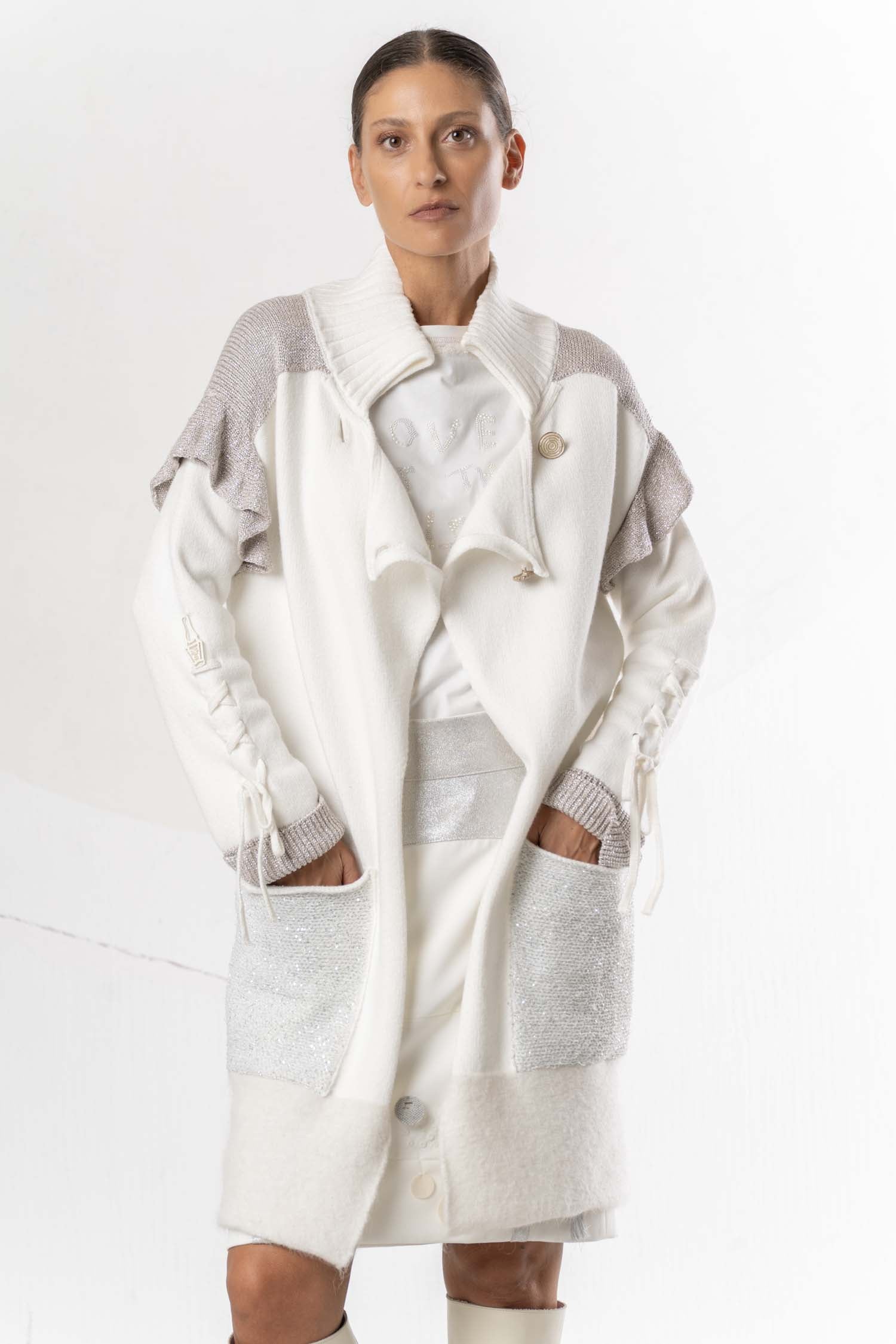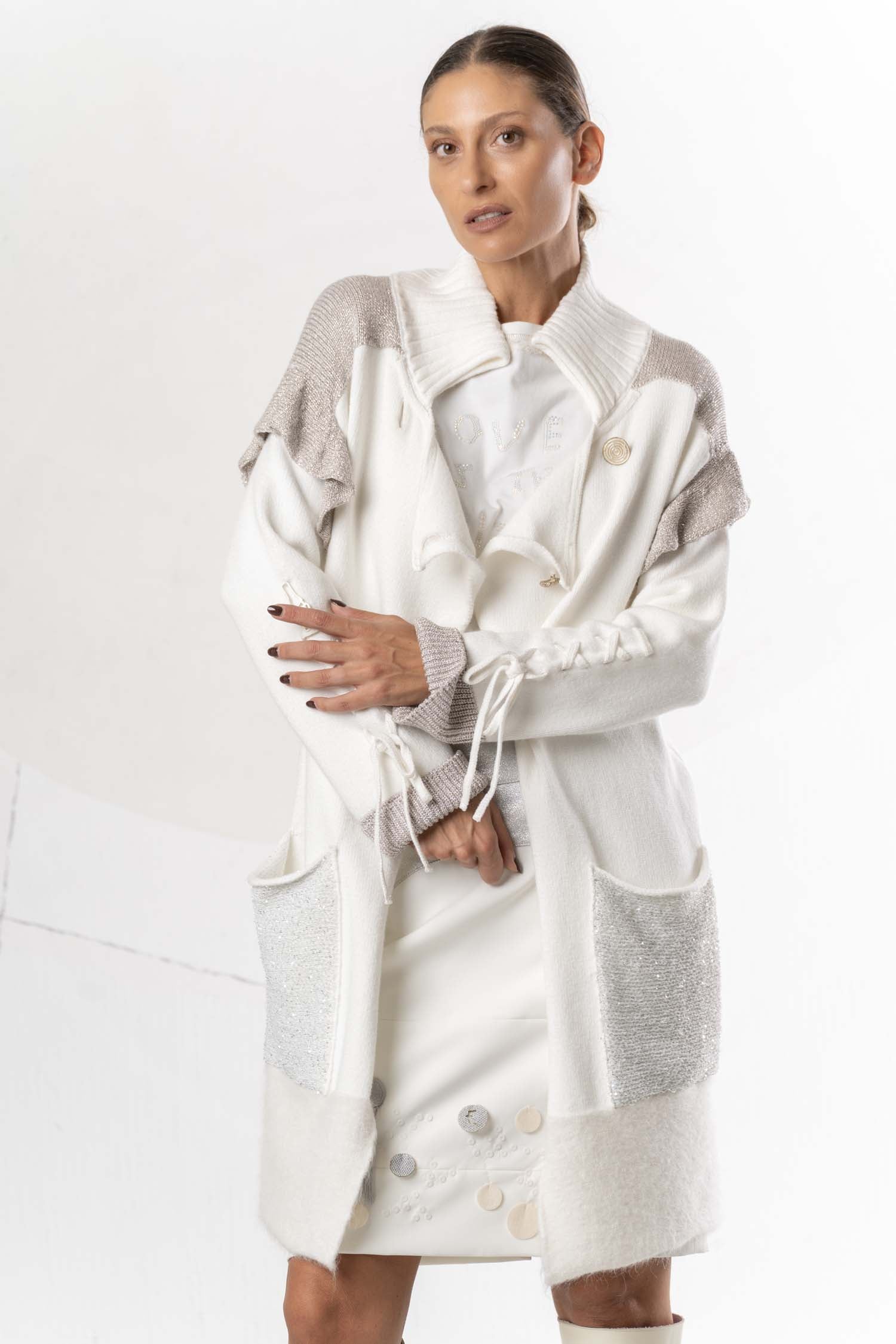Eleganter Strickmantel in klassischem Weiß und Grau mit raffinierten Applikationen aus hochwertiger Wolle. Das durchdachte Design kombiniert zeitlose Eleganz mit modernen Details – die subtilen Glitzereffekte verleihen dem Mantel einen dezenten Glanz für besondere Anlässe. Die hochwertige Wollverarbeitung garantiert Langlebigkeit und angenehmen Tragekomfort. Ein vielseitiges Lieblingsstück, das mühelos von Alltag zu Abend übergeleitet und zu verschiedenen Outfits passt.