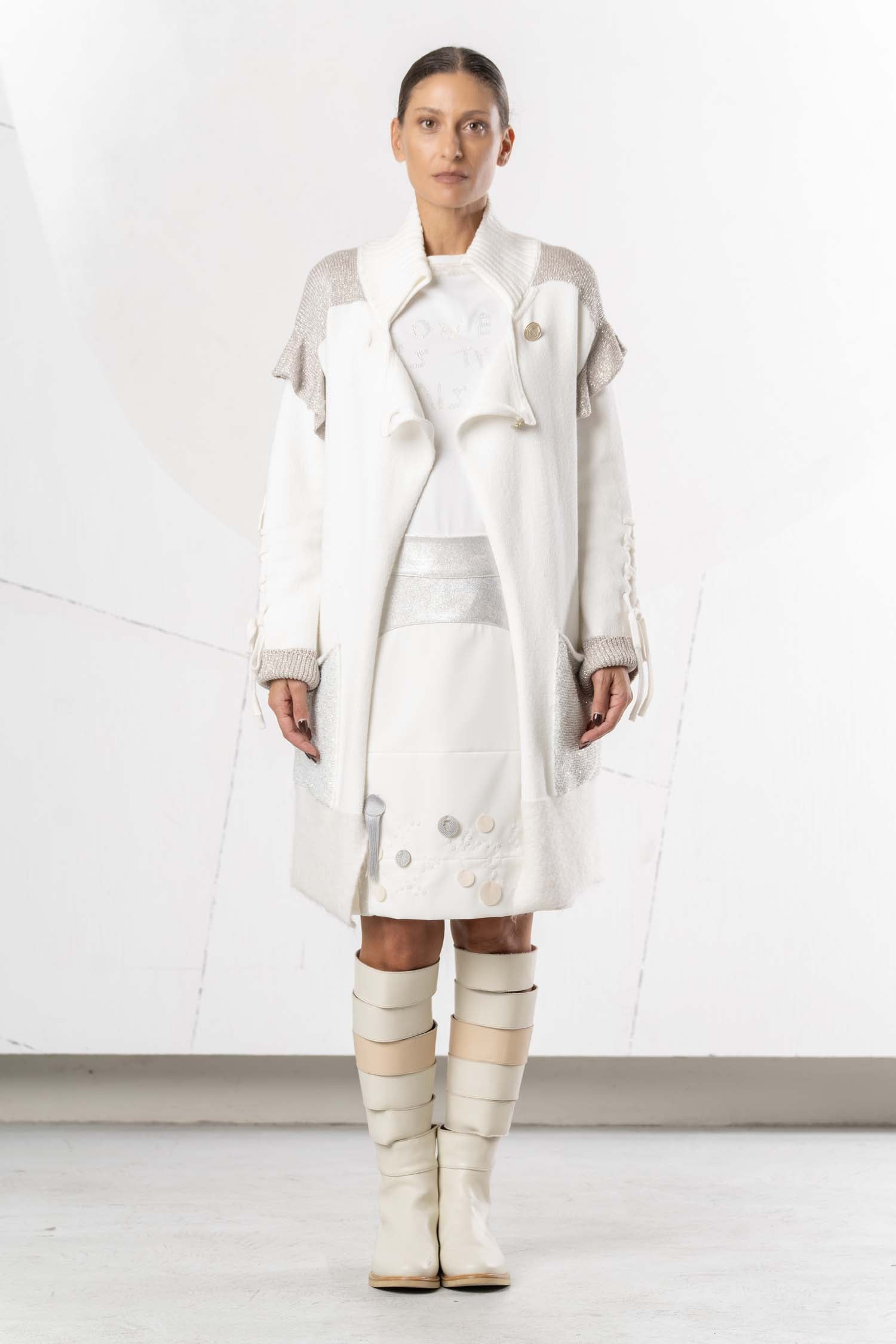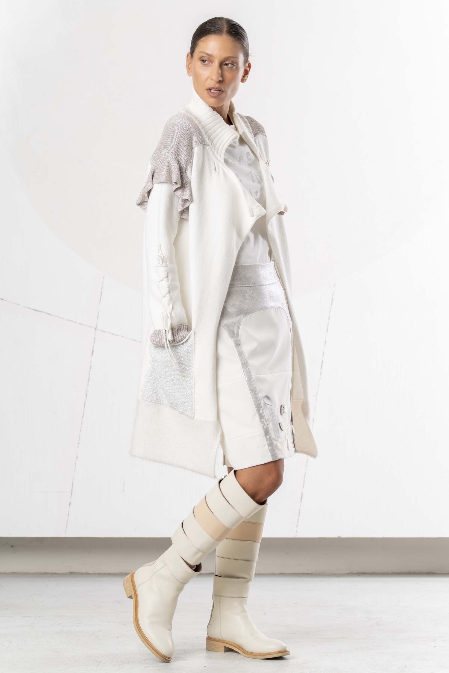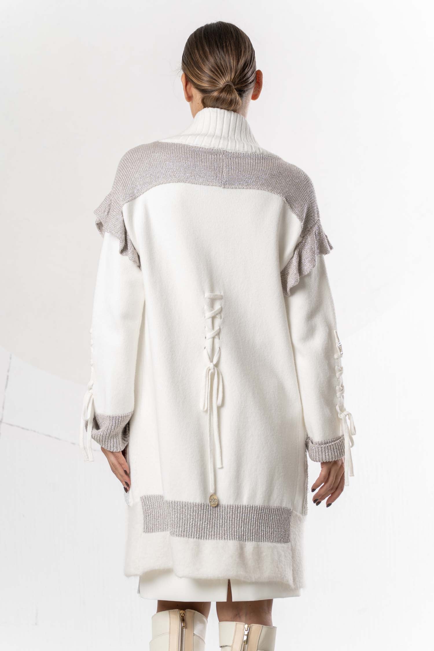Eleganter Strickmantel in klassischem Weiß und Grau mit raffinierten Applikationen aus hochwertiger Wolle. Das durchdachte Design kombiniert zeitlose Eleganz mit modernen Details – die subtilen Glitzereffekte verleihen dem Mantel einen dezenten Glanz für besondere Anlässe. Die hochwertige Wollverarbeitung garantiert Langlebigkeit und angenehmen Tragekomfort. Ein vielseitiges Lieblingsstück, das mühelos von Alltag zu Abend übergeleitet und zu verschiedenen Outfits passt.