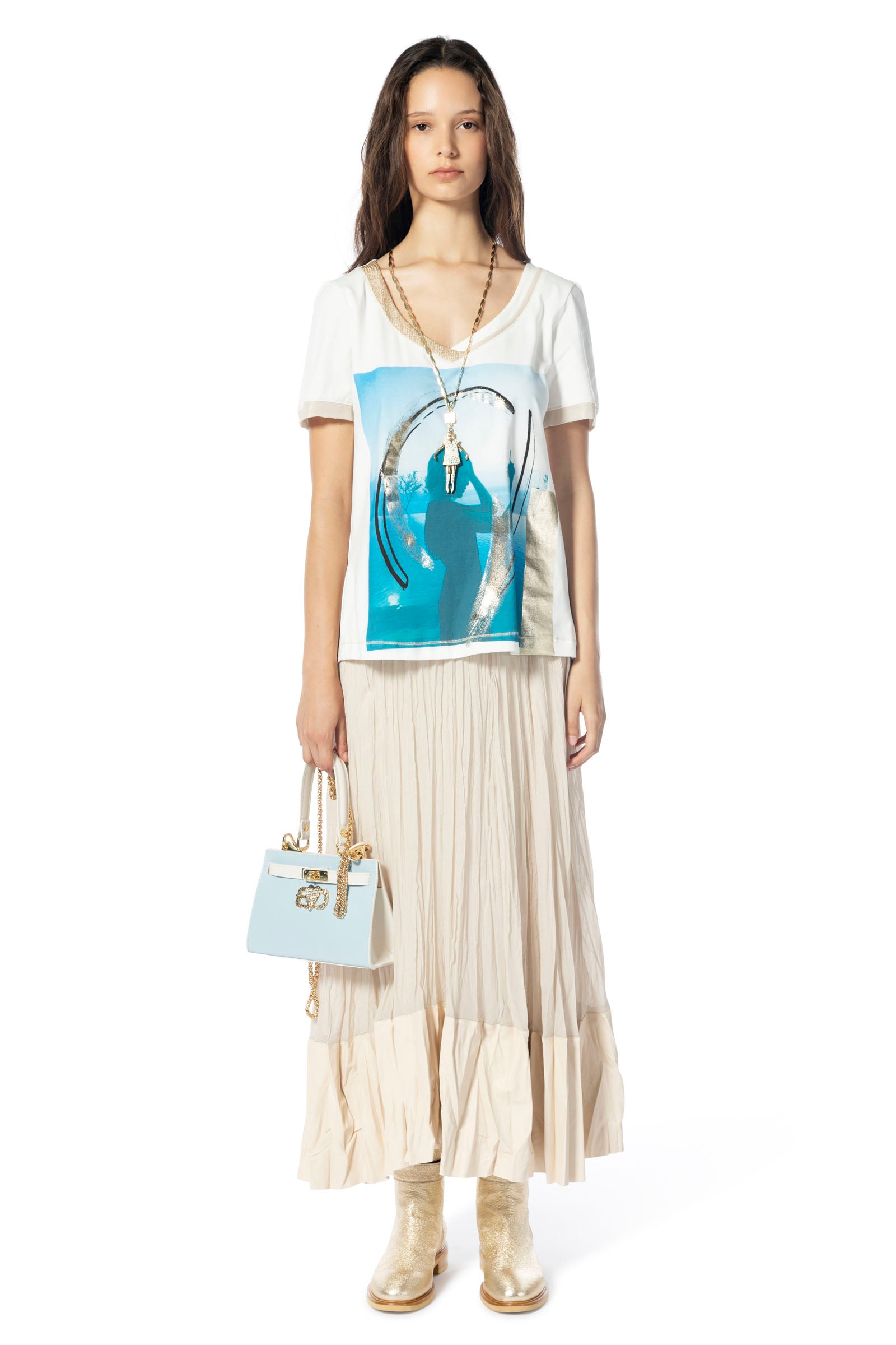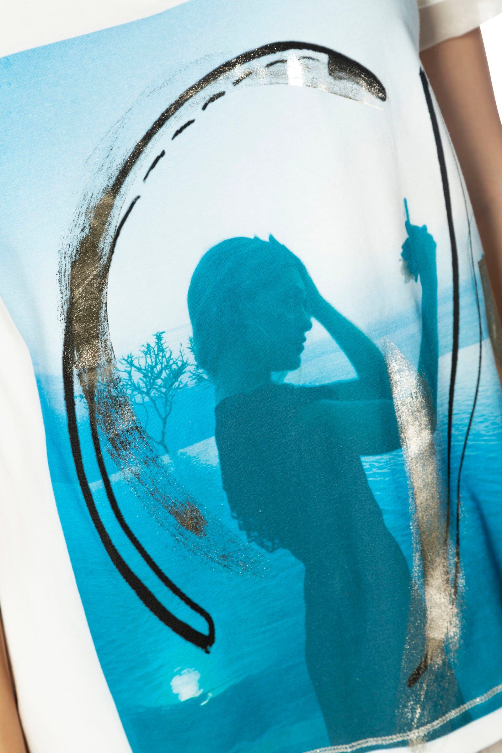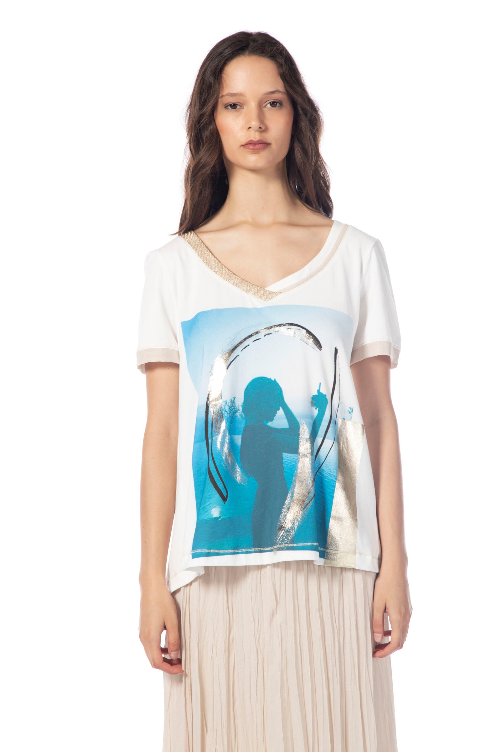 Das ELISA CAVALETTI T-Shirt St. Falso Unito ist ein weißes T-Shirt mit einem V-Ausschnitt, das durch einen schönen Aufdruck veredelt wurde. Perfekt für den Sommer und ideal kombinierbar zu verschiedenen Outfits. Zeigen Sie mit diesem T-Shirt Ihren individuellen Stil und setzen Sie ein Statement!