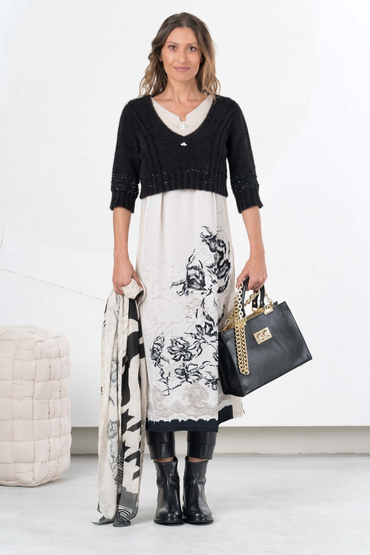 Dieses elegante weiße Kleid besticht durch seine schwarze Musterung, die einen stilvollen Kontrast schafft. Die dazugehörige schwarze kurze Jacke ergänzt das Ensemble perfekt und sorgt für ein harmonisches Gesamtbild. Das lang geschnittene Kleid bietet eine schmeichelhafte Silhouette, während die Jacke zusätzlichen Komfort und Vielseitigkeit bietet – ideal für besondere Anlässe oder formelle Events.