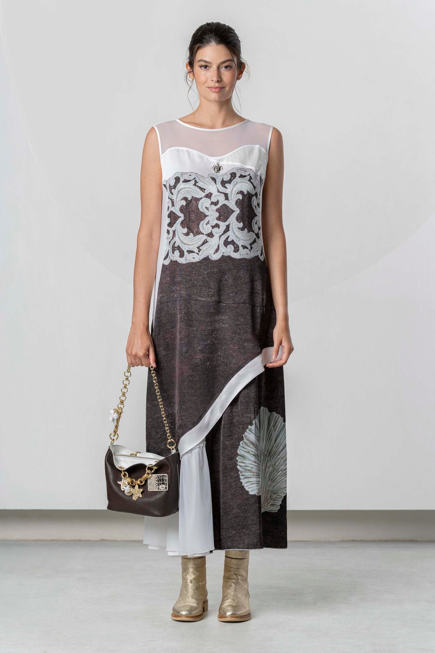 Dieses elegante Kleid verbindet schlichte Raffinesse mit einem kreativen Muschel-Druck. Die Kombination aus zartem weißen Stoff und dem harmonisch platzierten, grafischen Design macht das Kleid zu einem einzigartigen Hingucker. Der Schnitt verleiht dem Modell eine fließende Silhouette und sorgt für einen besonders femininen Look. Perfekt für den Sommer, bietet es sich sowohl für entspannte Tage als auch festliche Anlässe an. Kombiniert mit Boots oder eleganten Schuhen ist dieses Kleid die ideale Wahl für stilbewusste Frauen.