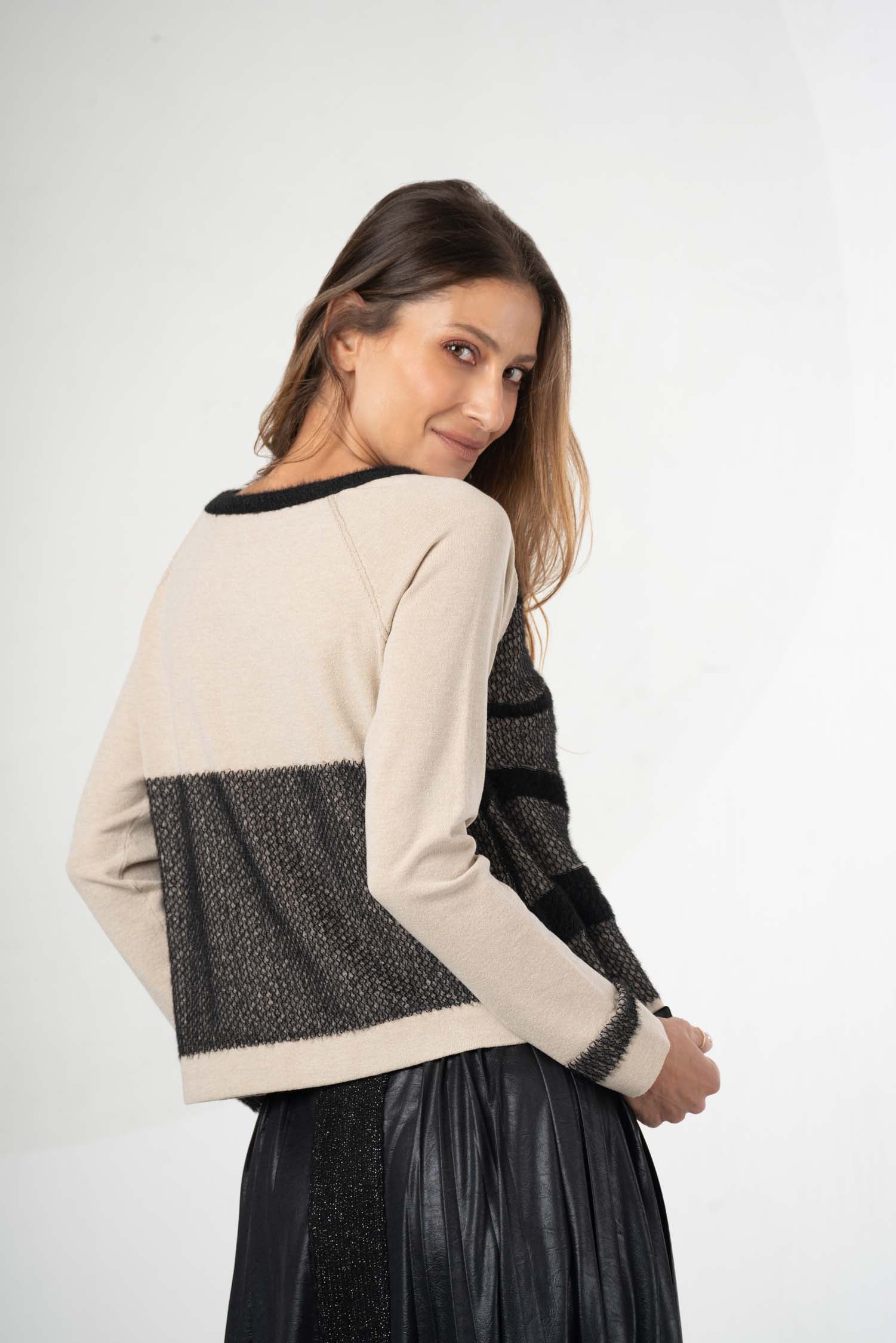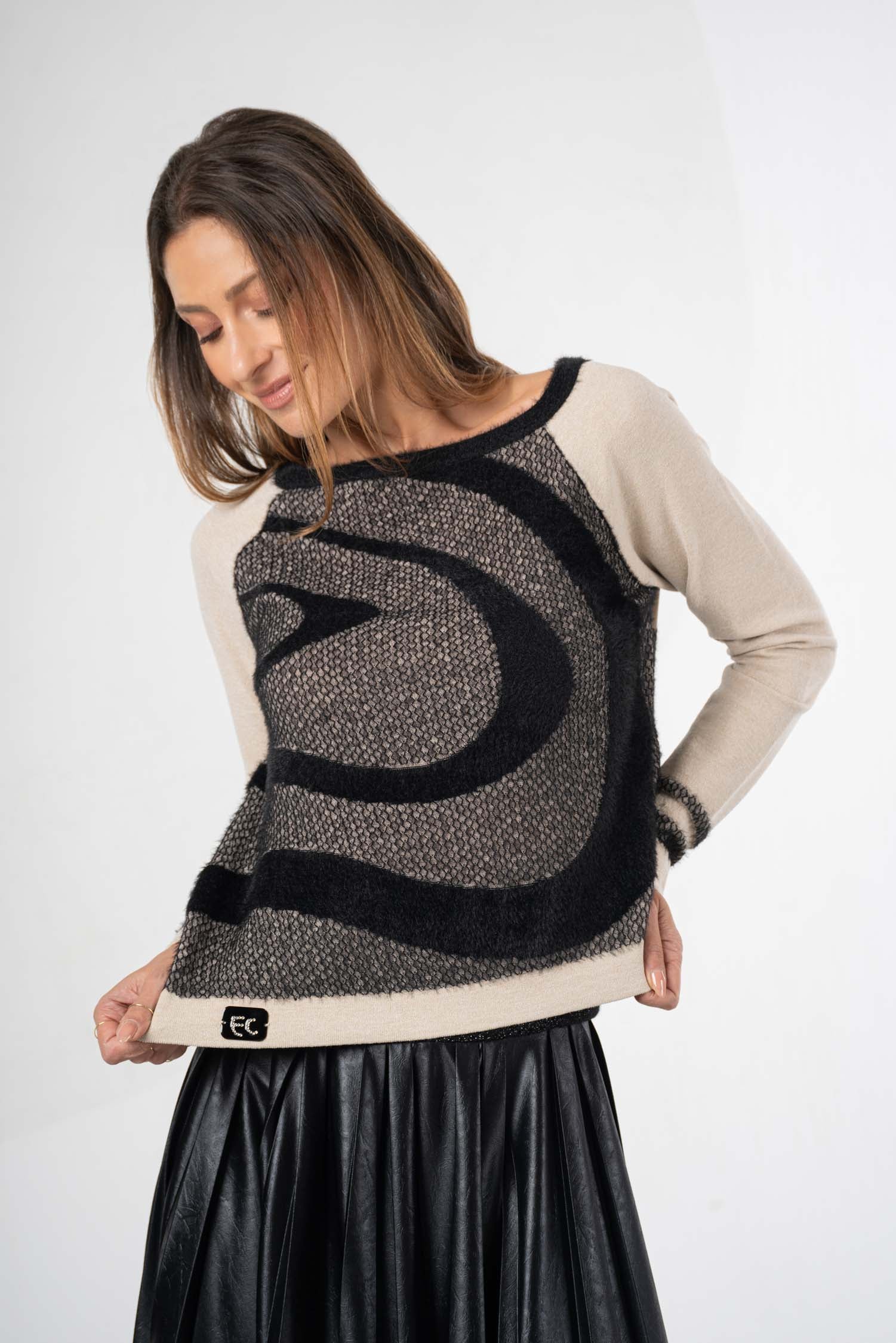 Dieser Strickpullover vereint Komfort und Stil mit einem kuschelweichen Material in zeitlosem Beige und Schwarz. Der dezente Aufdruck setzt elegante Akzente, sodass sich das Modell vielseitig kombinieren lässt. Ideal für kühle Tage bietet der Pullover angenehme Wärme und eine hochwertige Verarbeitung.