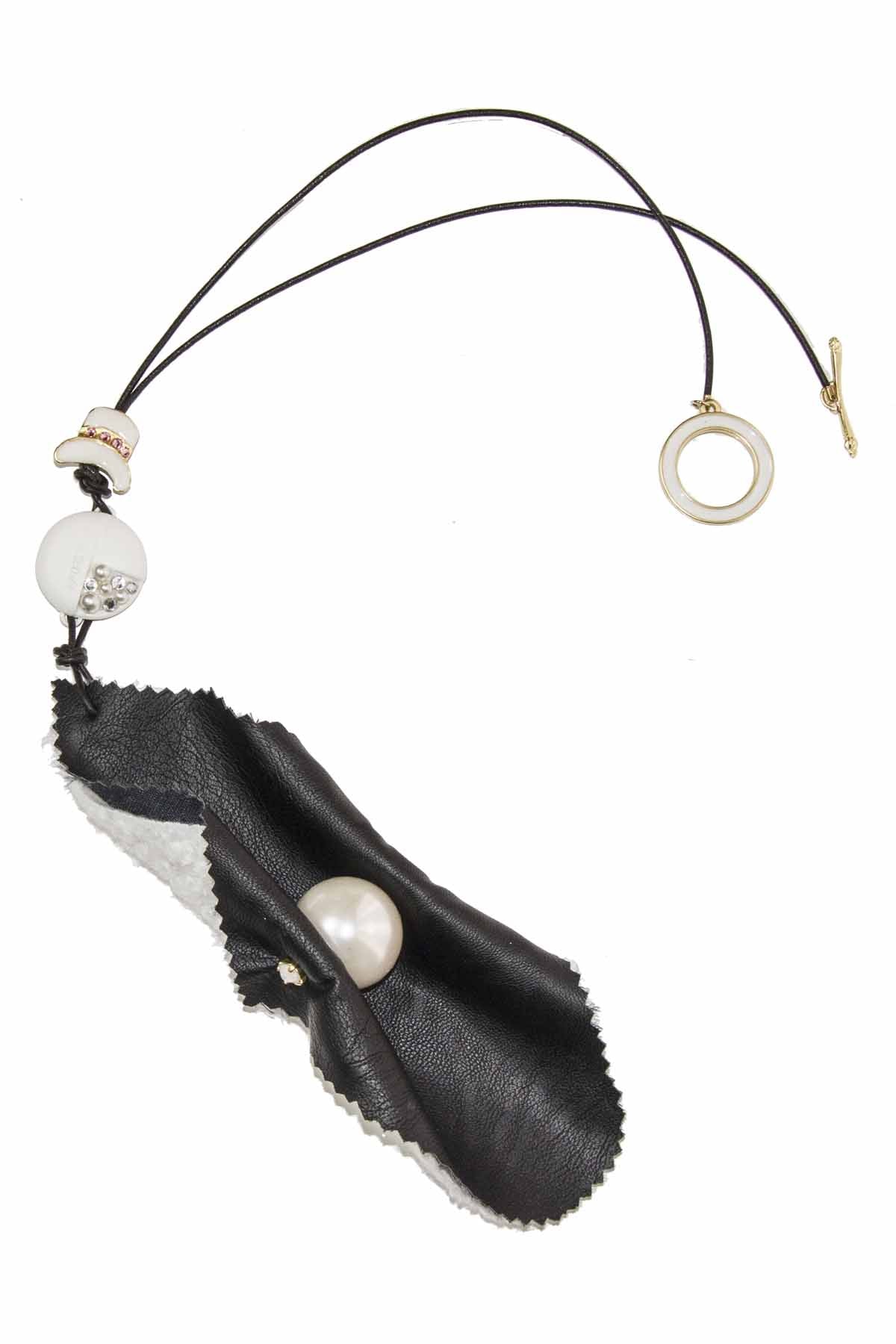 Diese besondere Kette überzeugt durch ihr modernes, avantgardistisches Design. Eine feine schwarze Kordel trifft auf kunstvoll arrangierte Elemente aus Perlen und einem weich fallenden Lederdetail. Der Kontrast aus zarten, edlen Akzenten und markanter Materialität macht die Kette zu einem ausdrucksstarken Statement-Piece – ideal, um schlichte Outfits stilvoll zu ergänzen.