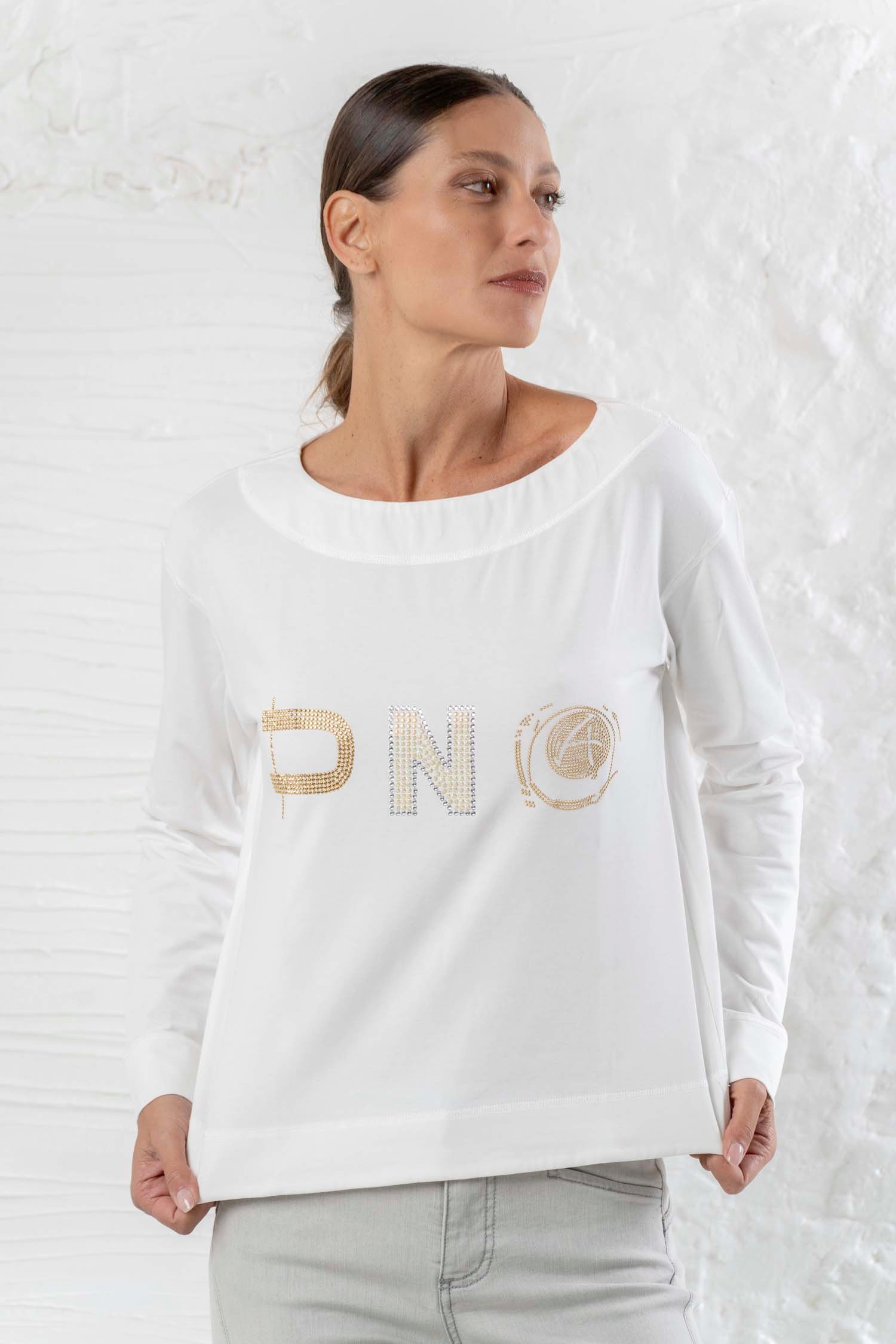 Erleben Sie luxuriösen Stil mit dem DANIELA DALLAVALLE Sweatshirt Schwarz+Weiß. Die Kombination aus Perlen und Strasssteinen verleiht diesem stylischen Sweatshirt einen eleganten Touch. Perfekt für jeden Anlass, um sich zu verwöhnen und stilvoll zu fühlen. Holen Sie sich jetzt Ihren neuen Lieblings-Look!