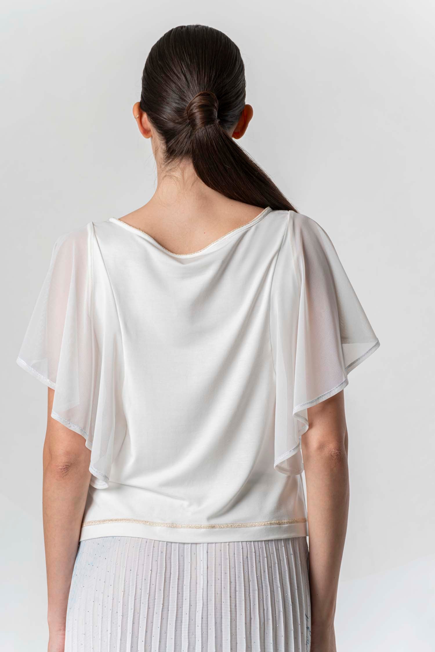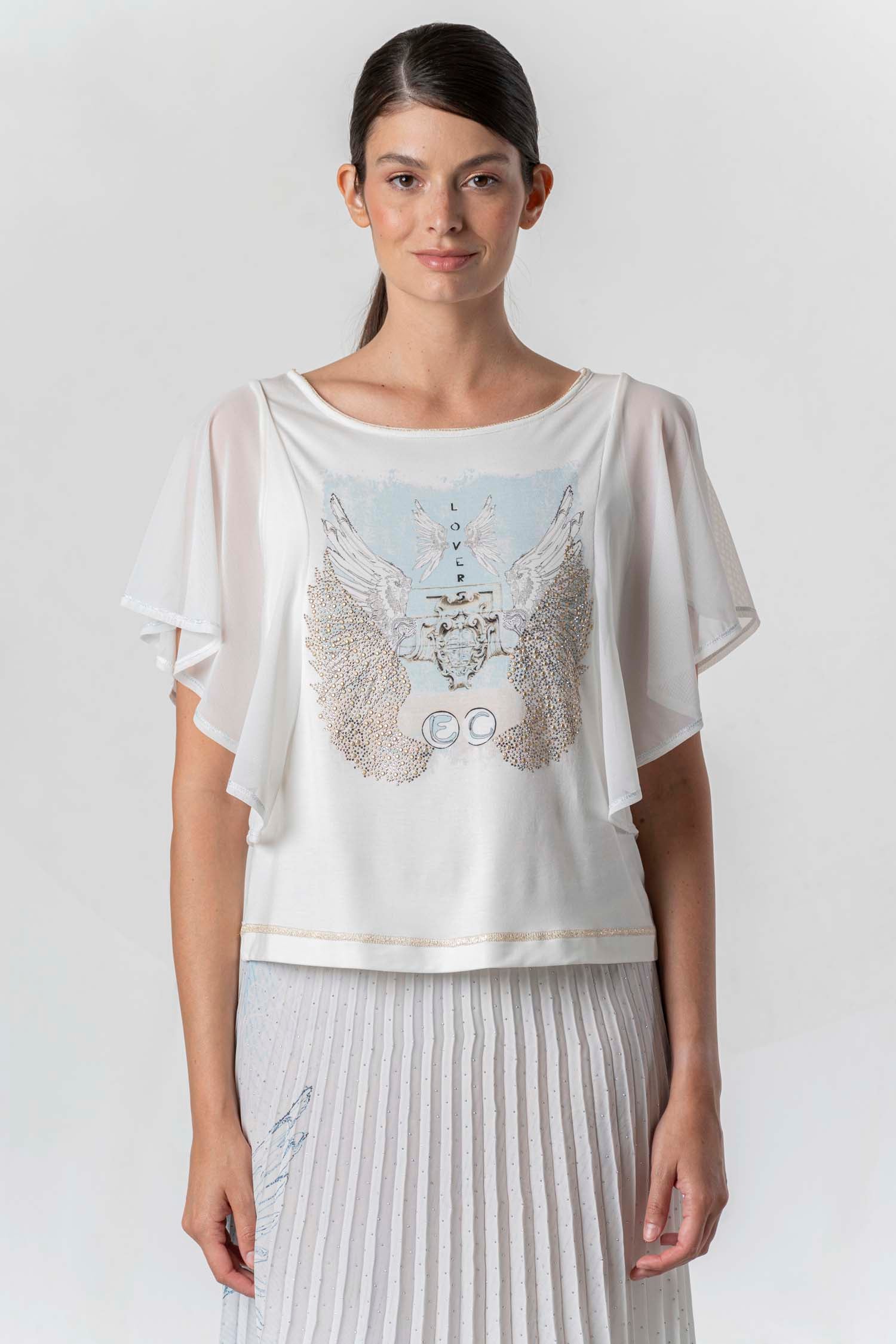 Dieses feminine T-Shirt überzeugt mit einem dekorativen Frontprint und funkelnden Glanzdetails. Die leicht transparenten, fließenden Ärmel verleihen dem Design eine elegante Leichtigkeit, während der lockere Schnitt für hohen Tragekomfort sorgt. Ideal für stilvolle Looks – von casual bis chic.