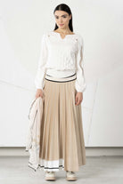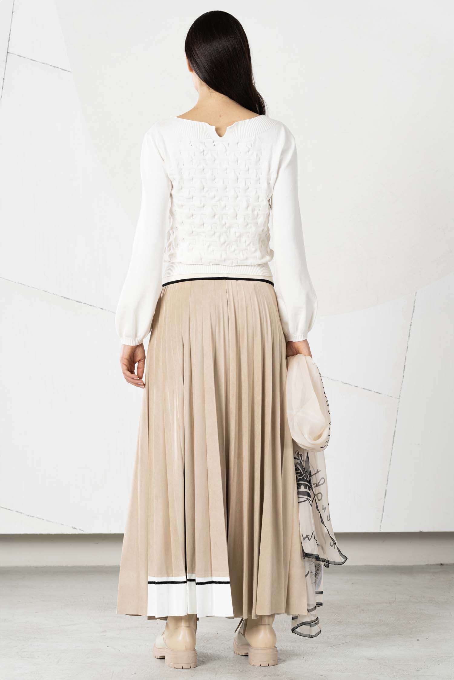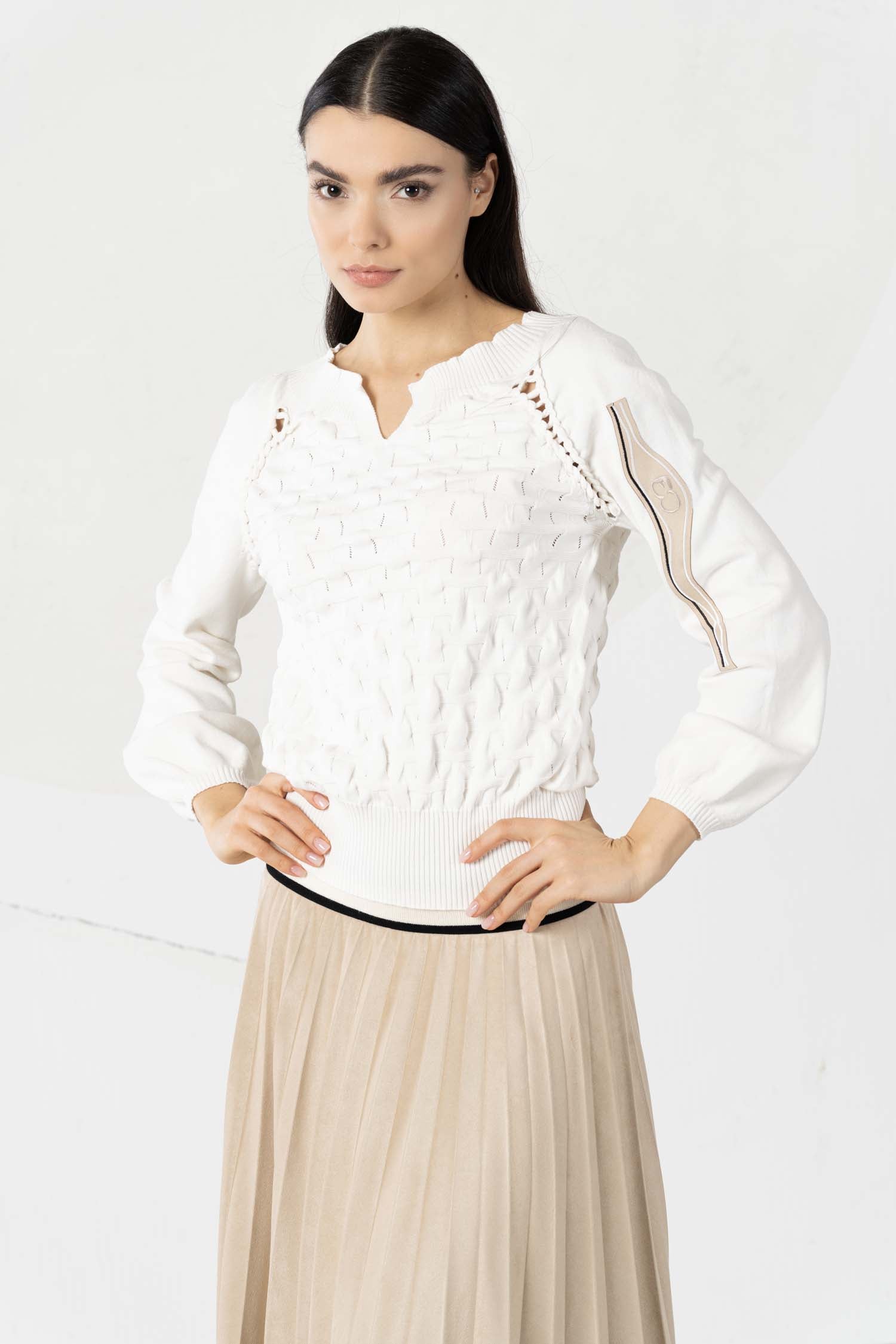 This stylish white knit sweater features a special knitting technique that creates a sophisticated texture. The beautifully designed neckline elegantly accentuates the silhouette, making this versatile, high-quality piece for discerning looks.