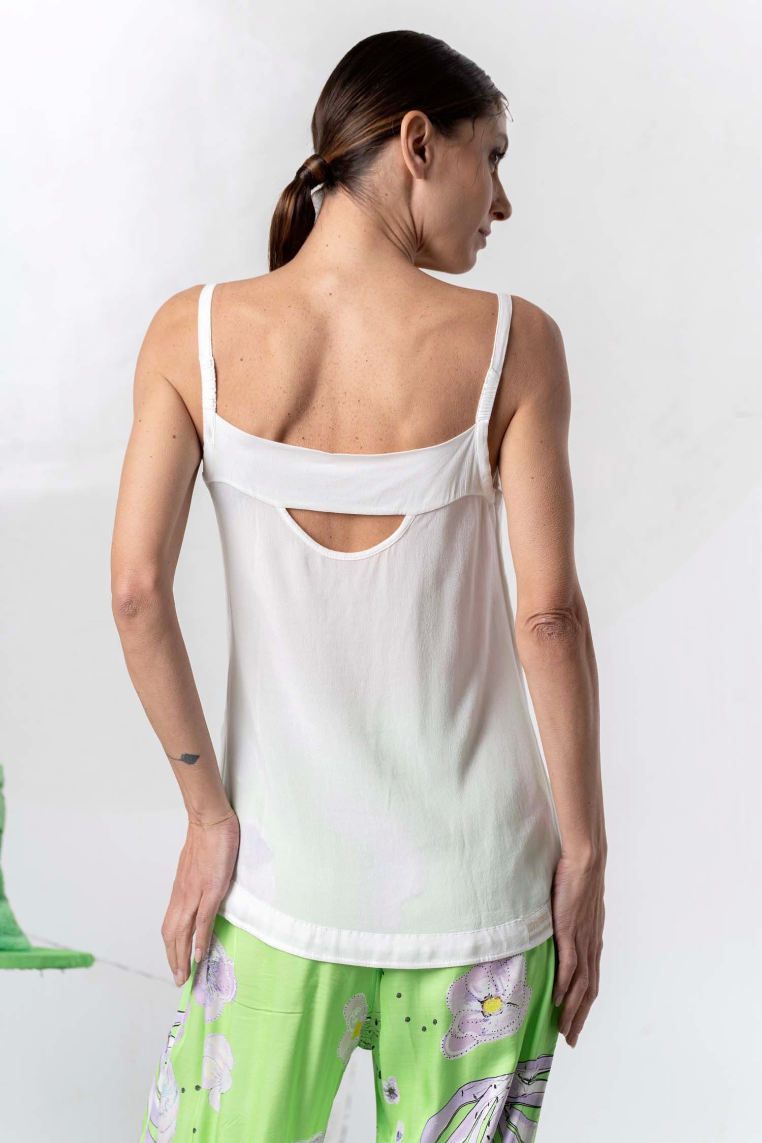 This elegant white camisole captivates with its subtle golden shimmer and feminine V-neck. The delicate, thin straps create a soft, airy look, while a small charm at the décolletage adds a sophisticated touch. Ideal for stylish outfits that impress with subtle details.