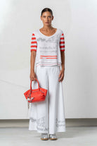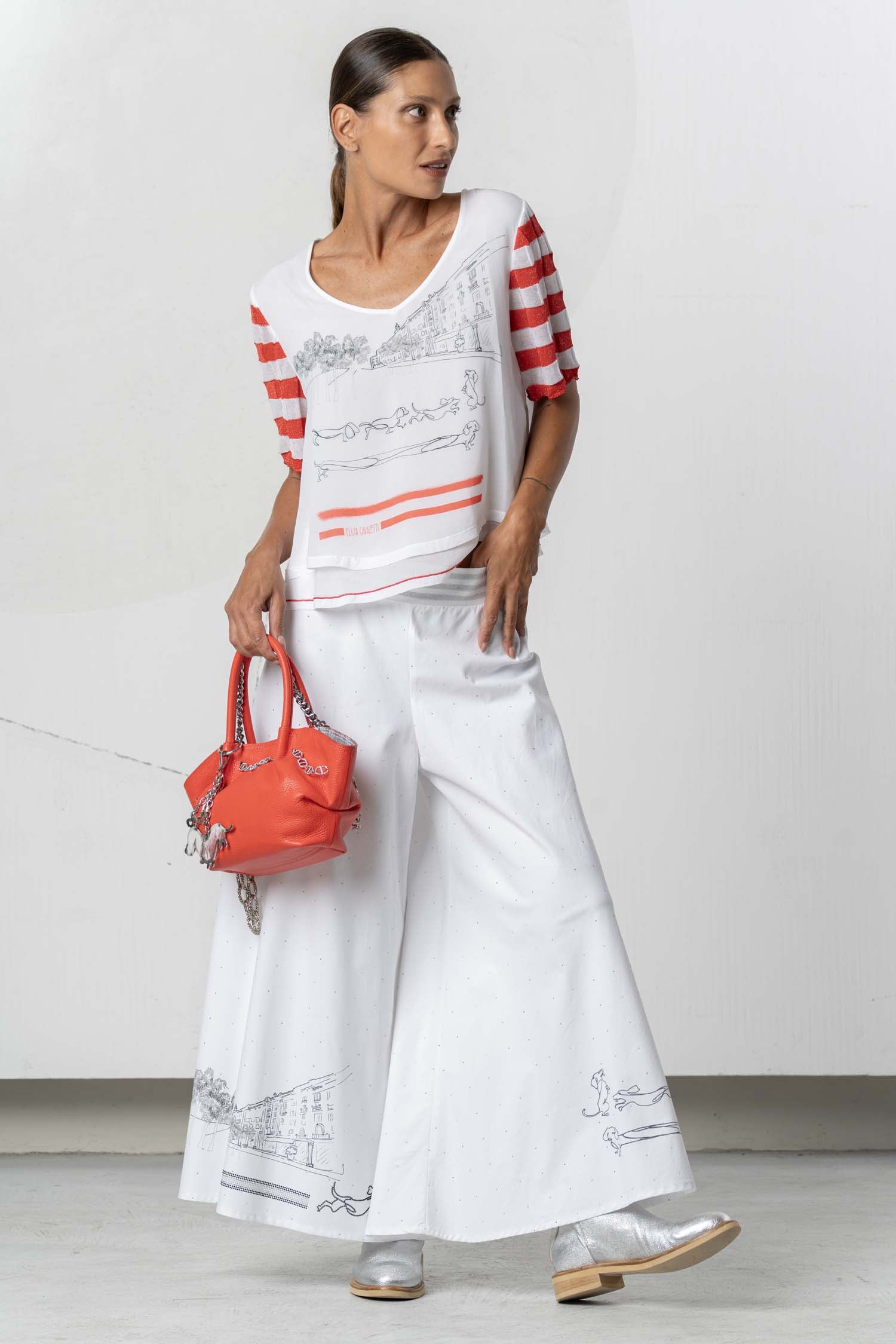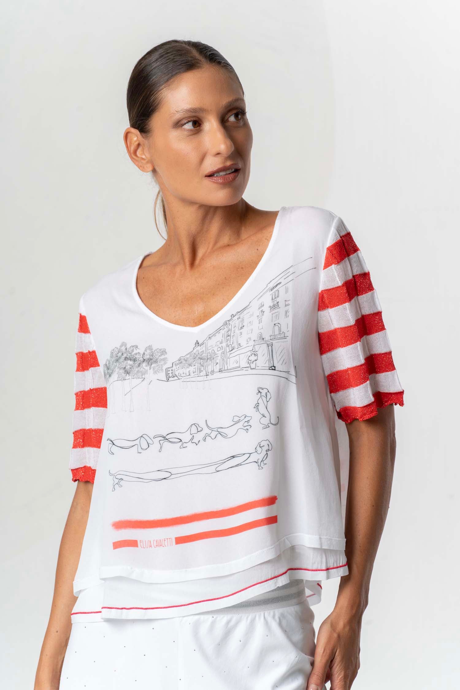 Leichtes, locker geschnittenes Shirt mit verspieltem Dackel-Print und grafischem City-Motiv. Die auffälligen Streifenärmel setzen modische Akzente und verleihen dem Look eine frische, sommerliche Note.