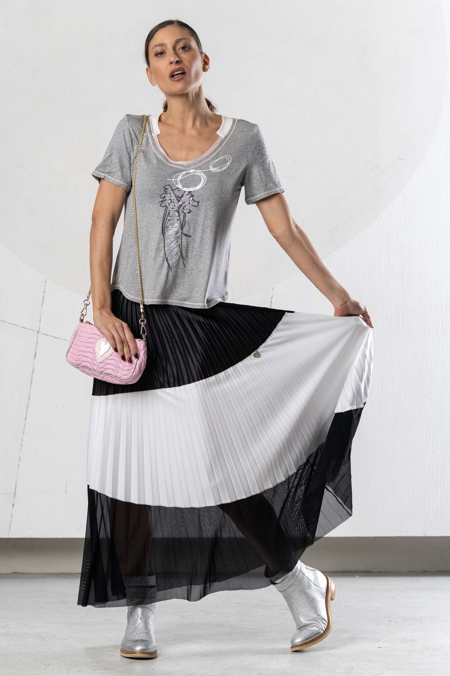 Dieses feminine Shirt überzeugt mit einem stilvollen, künstlerischen Frontprint, der dem Look eine besondere Note verleiht. Dezente Glanzdetails setzen elegante Akzente und unterstreichen die hochwertige Optik. Der weiche, angenehm fallende Stoff sorgt für hohen Tragekomfort, während der schmeichelnde V-Ausschnitt das Dekolleté schön betont. Kurze Ärmel und die moderne Passform machen das Shirt zu einem vielseitigen Begleiter – perfekt für lässige Alltagslooks oder stilvolle Kombinationen am Abend.