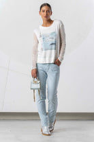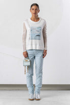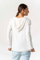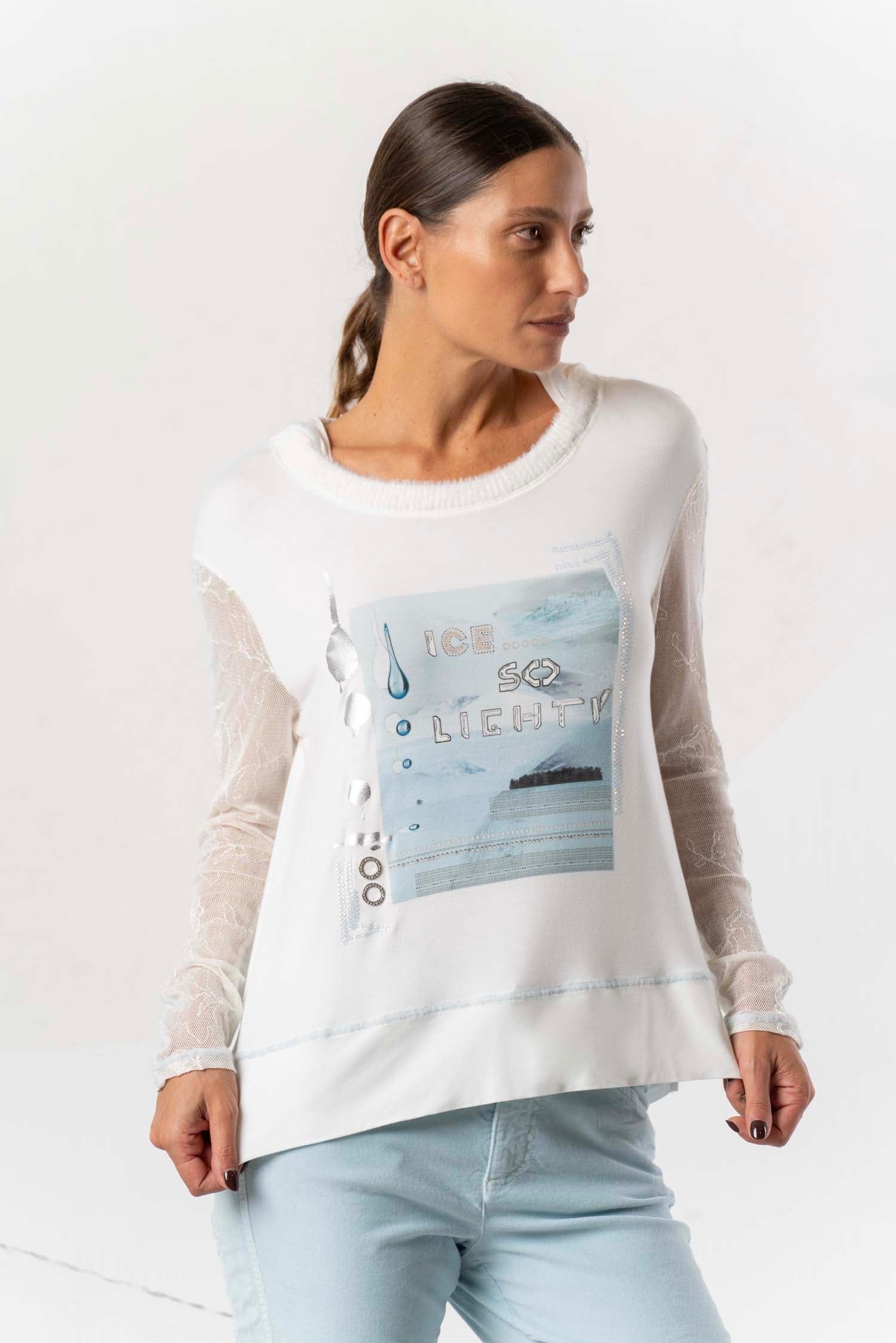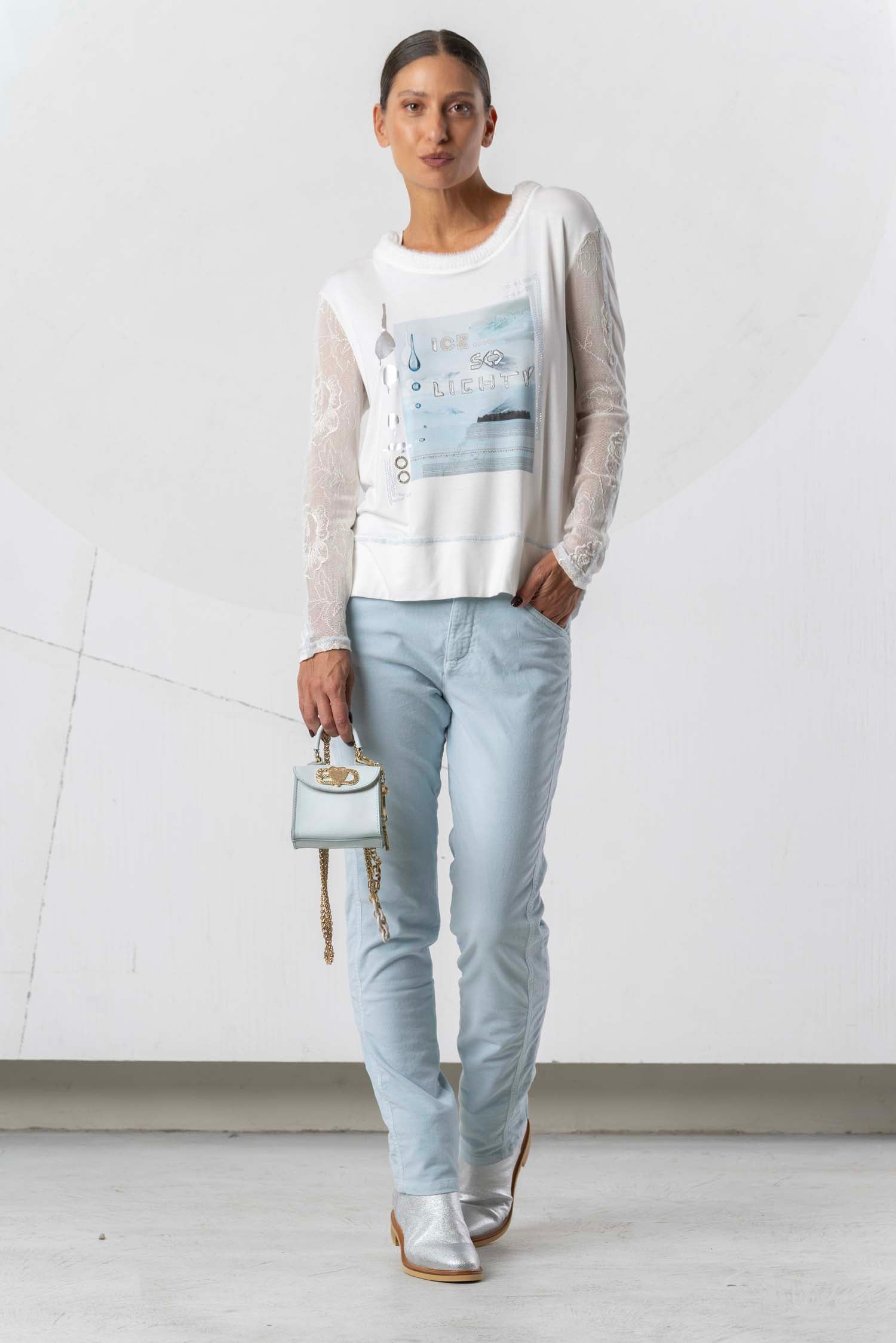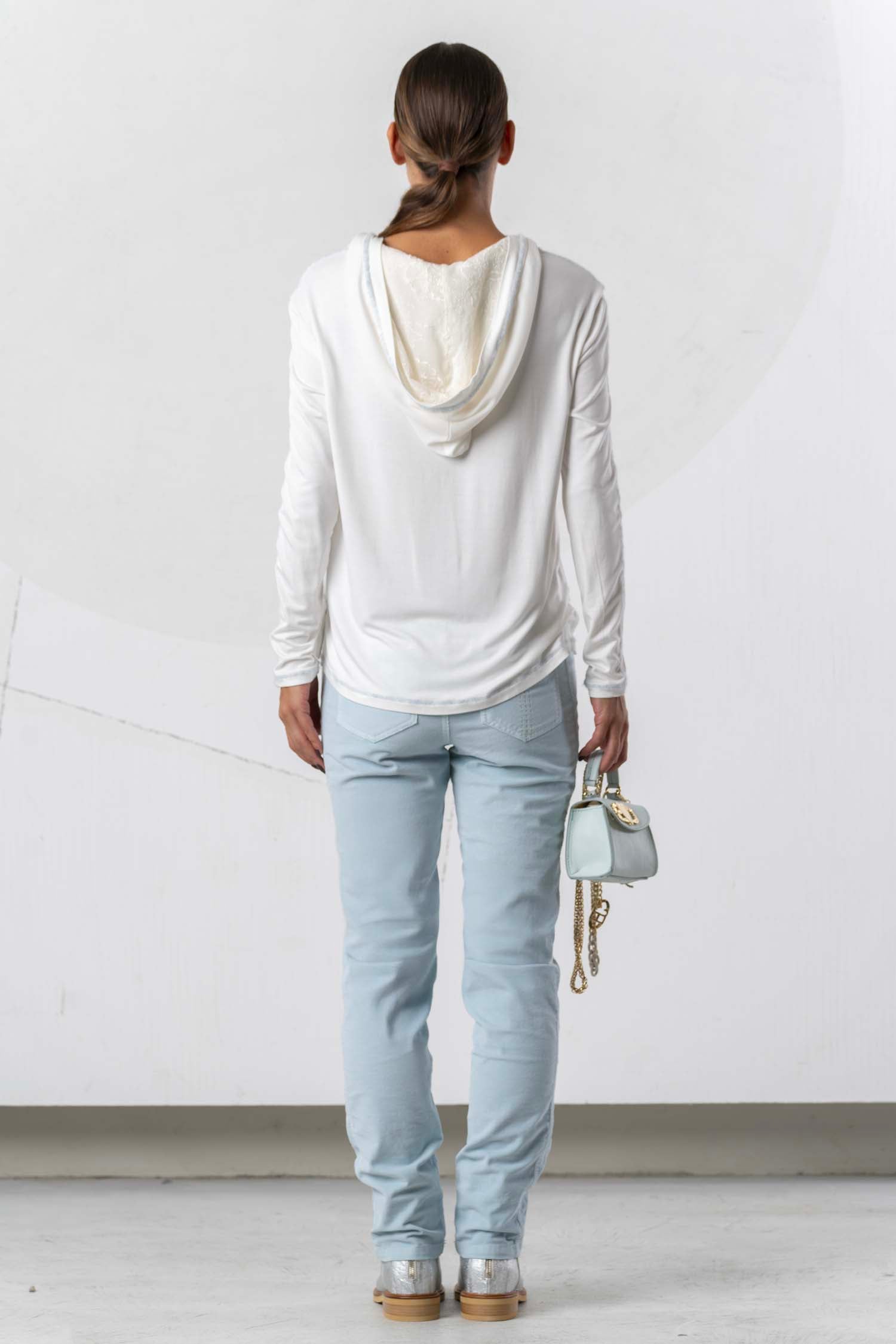 This stylish sweatshirt combines crisp white with delicate light blue and features sheer lace sleeves. The hood adds a casual touch, while the fine lace details lend the top an elegant flair. Ideal for fashion-conscious women who want to combine comfort with feminine sophistication.