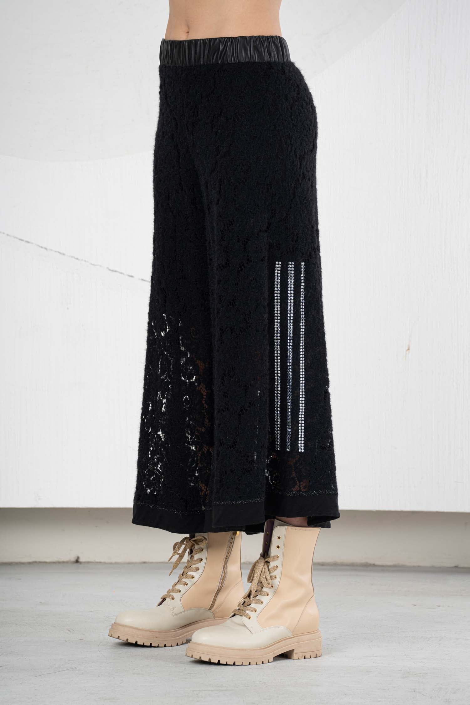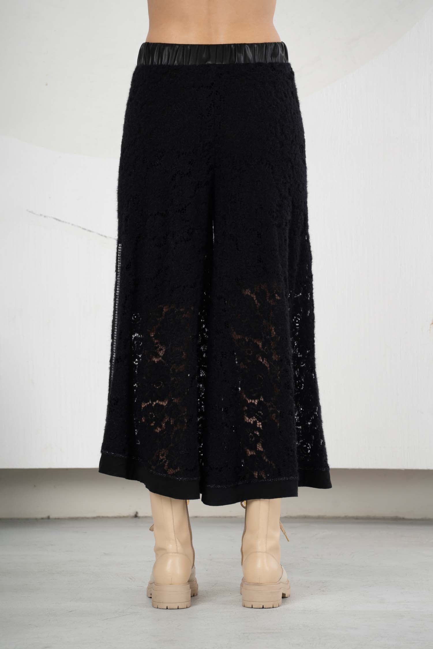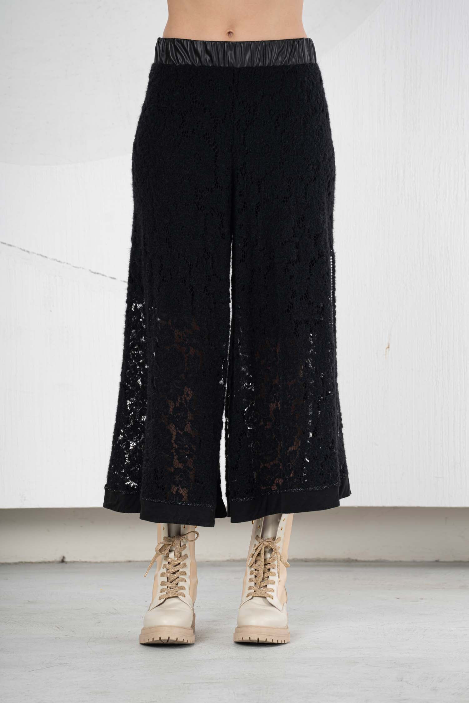 These ankle-length trousers impress with their wide leg, creating a stylish and modern silhouette. The black design with delicate lace trim adds an elegant touch and offers versatile styling options. Ideal for a sophisticated look with an elegant aesthetic.