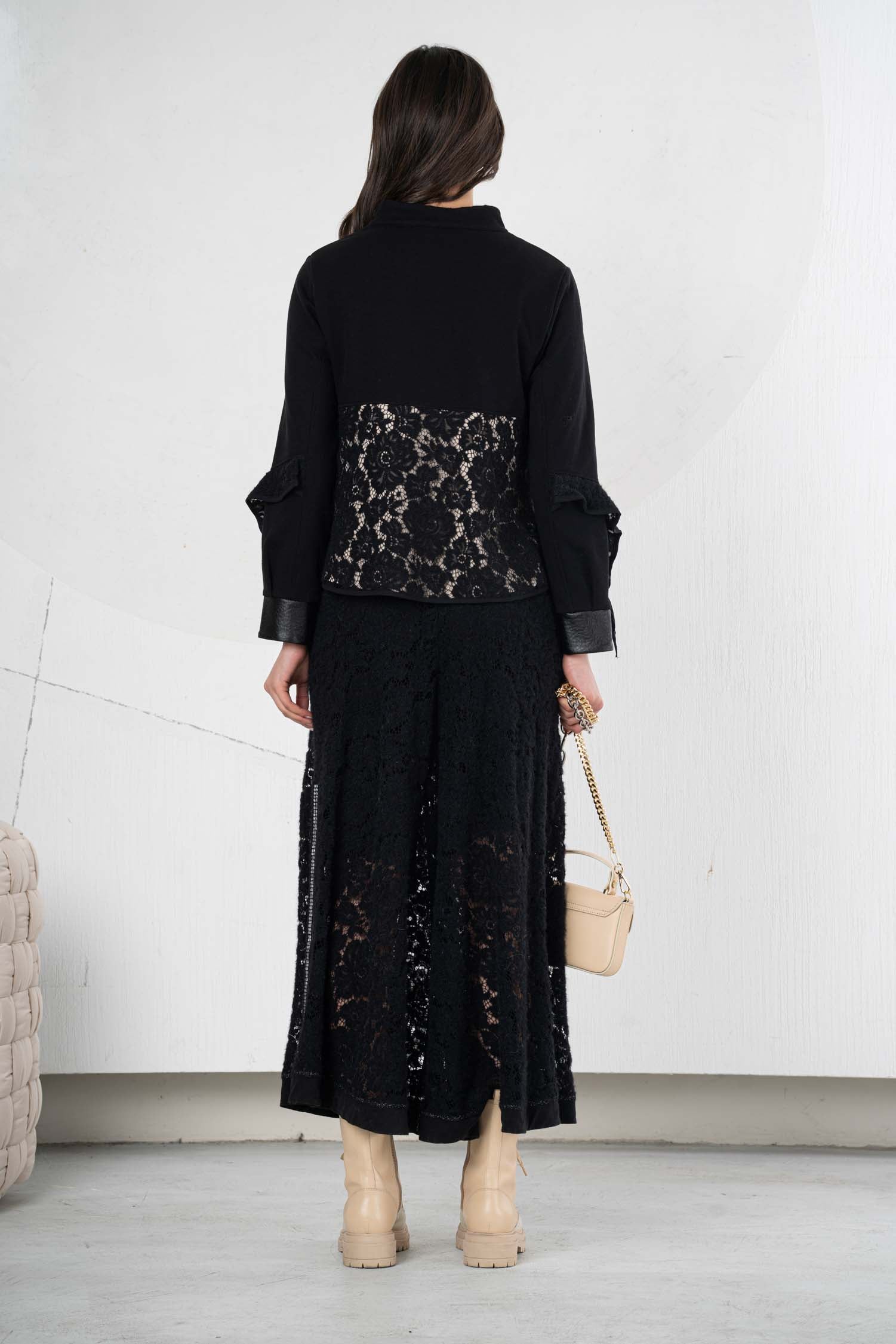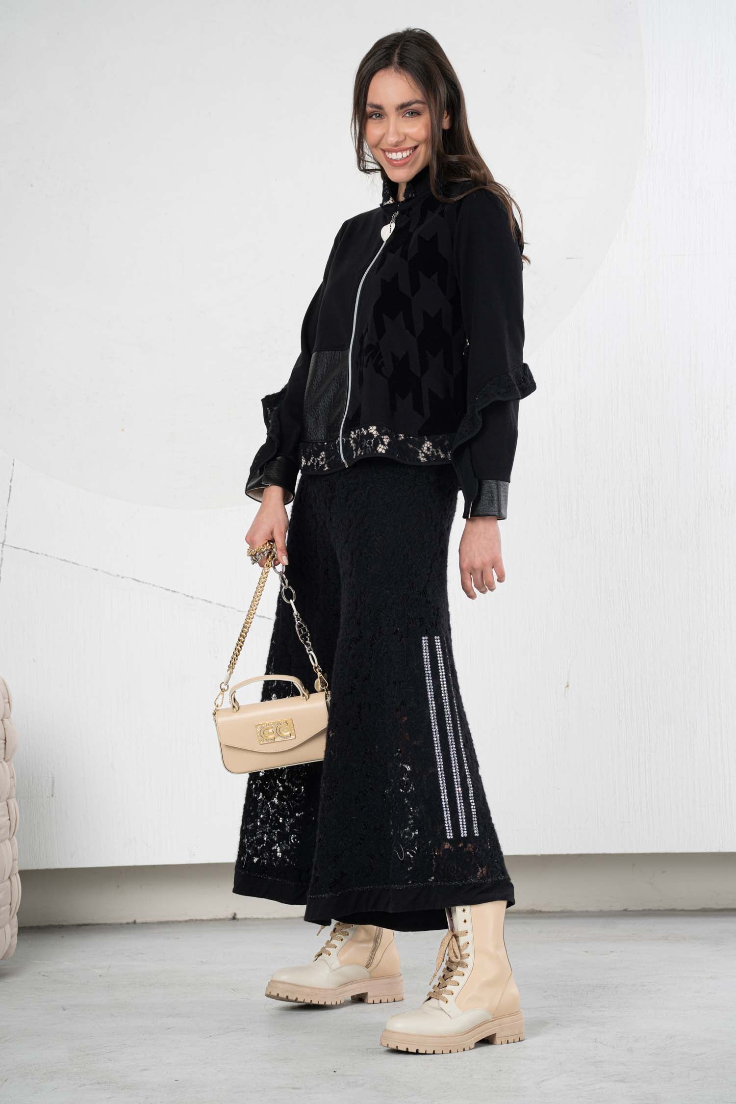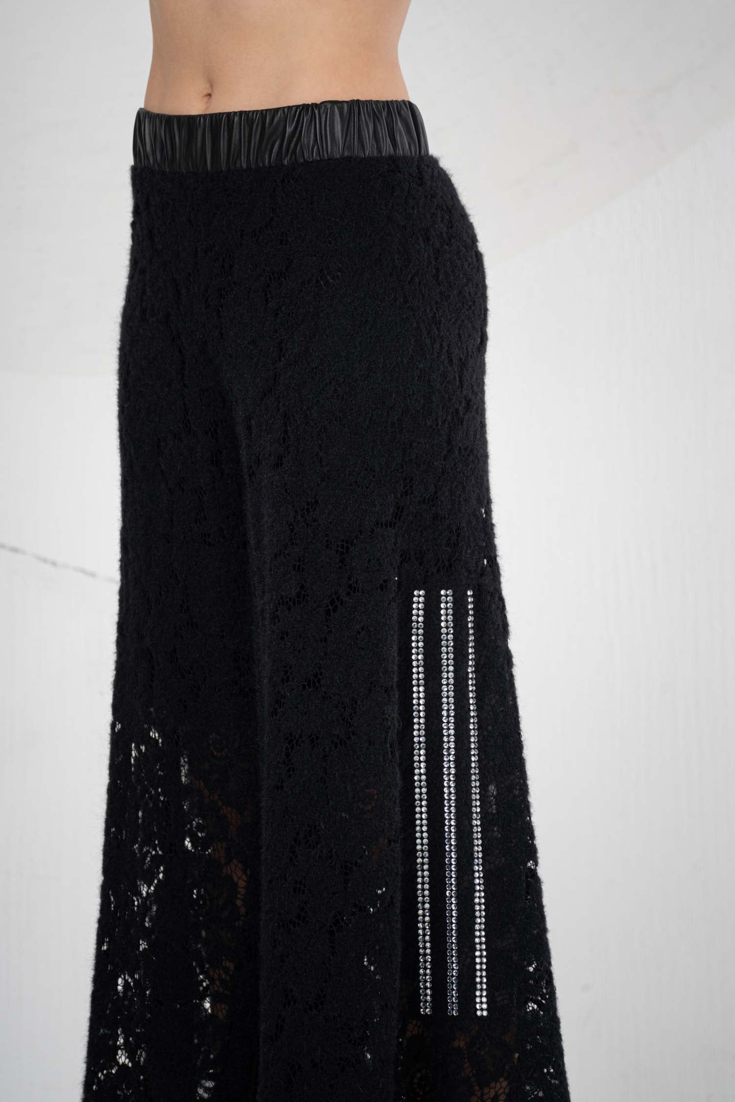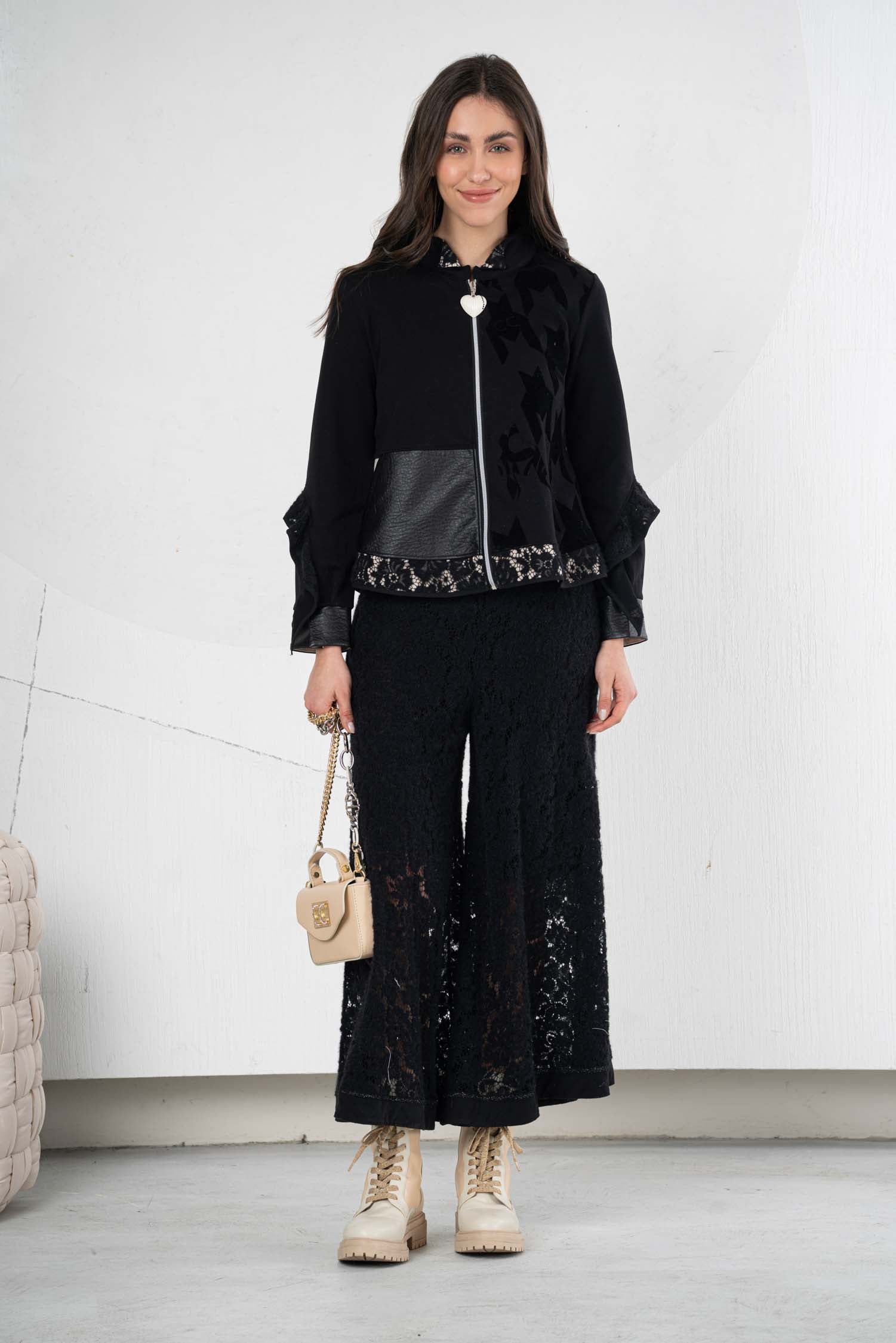 These ankle-length trousers impress with their wide leg, creating a stylish and modern silhouette. The black design with delicate lace trim adds an elegant touch and offers versatile styling options. Ideal for a sophisticated look with an elegant aesthetic.