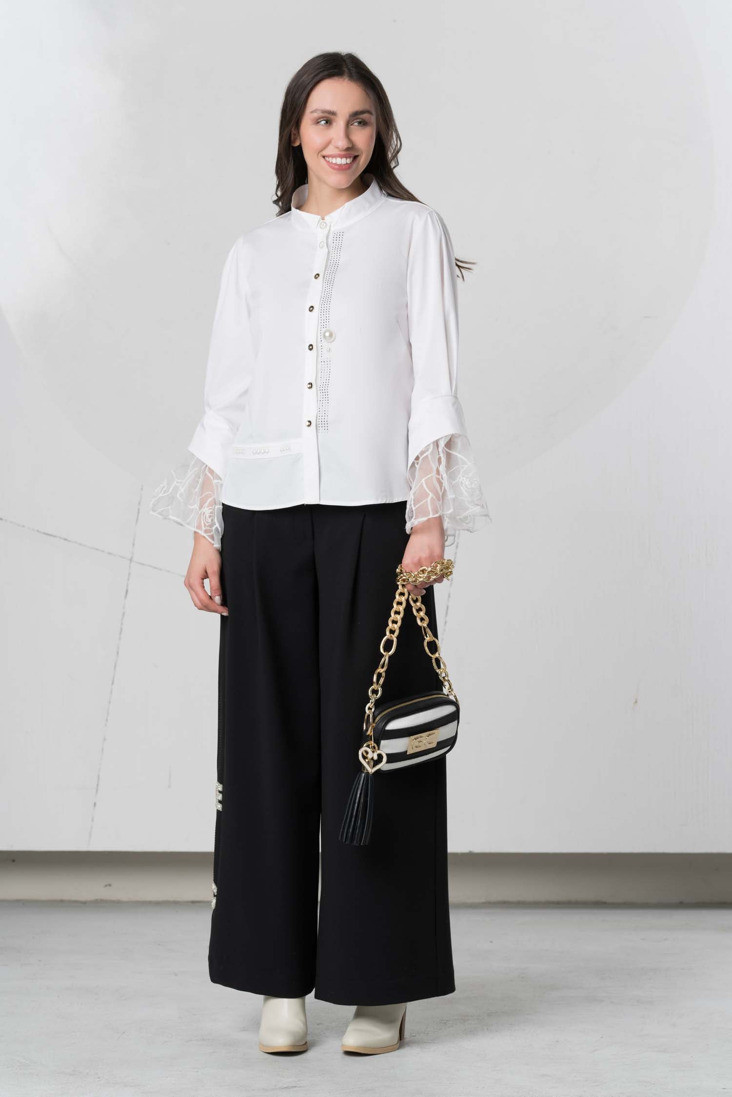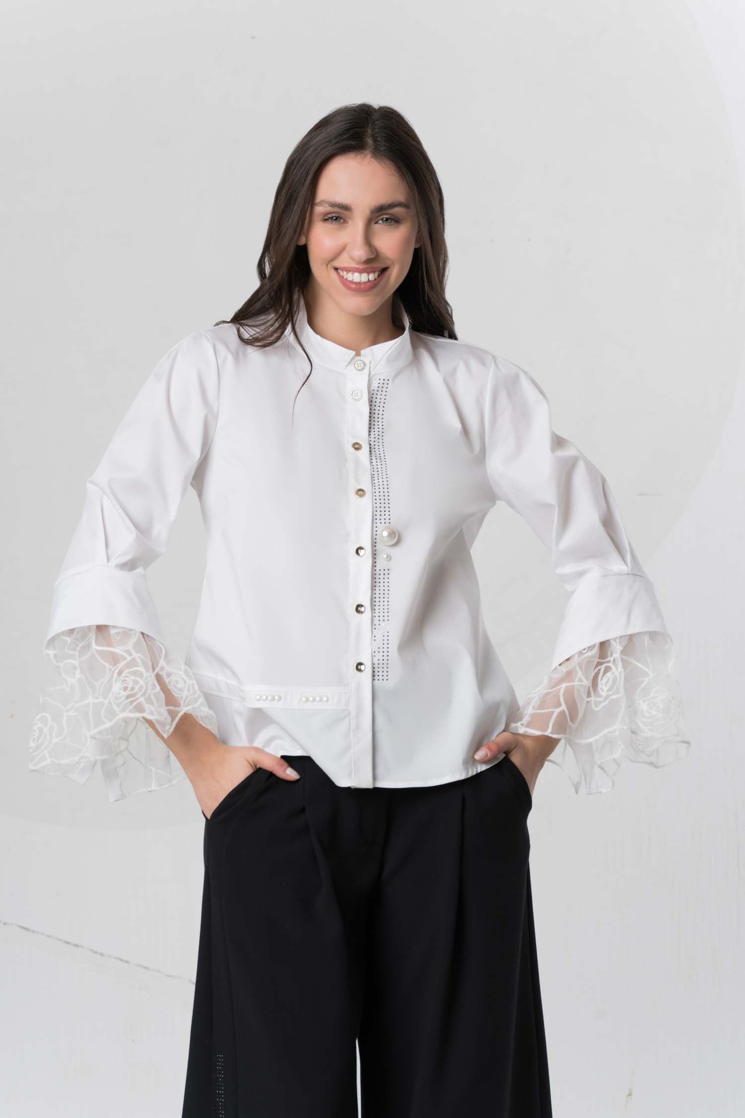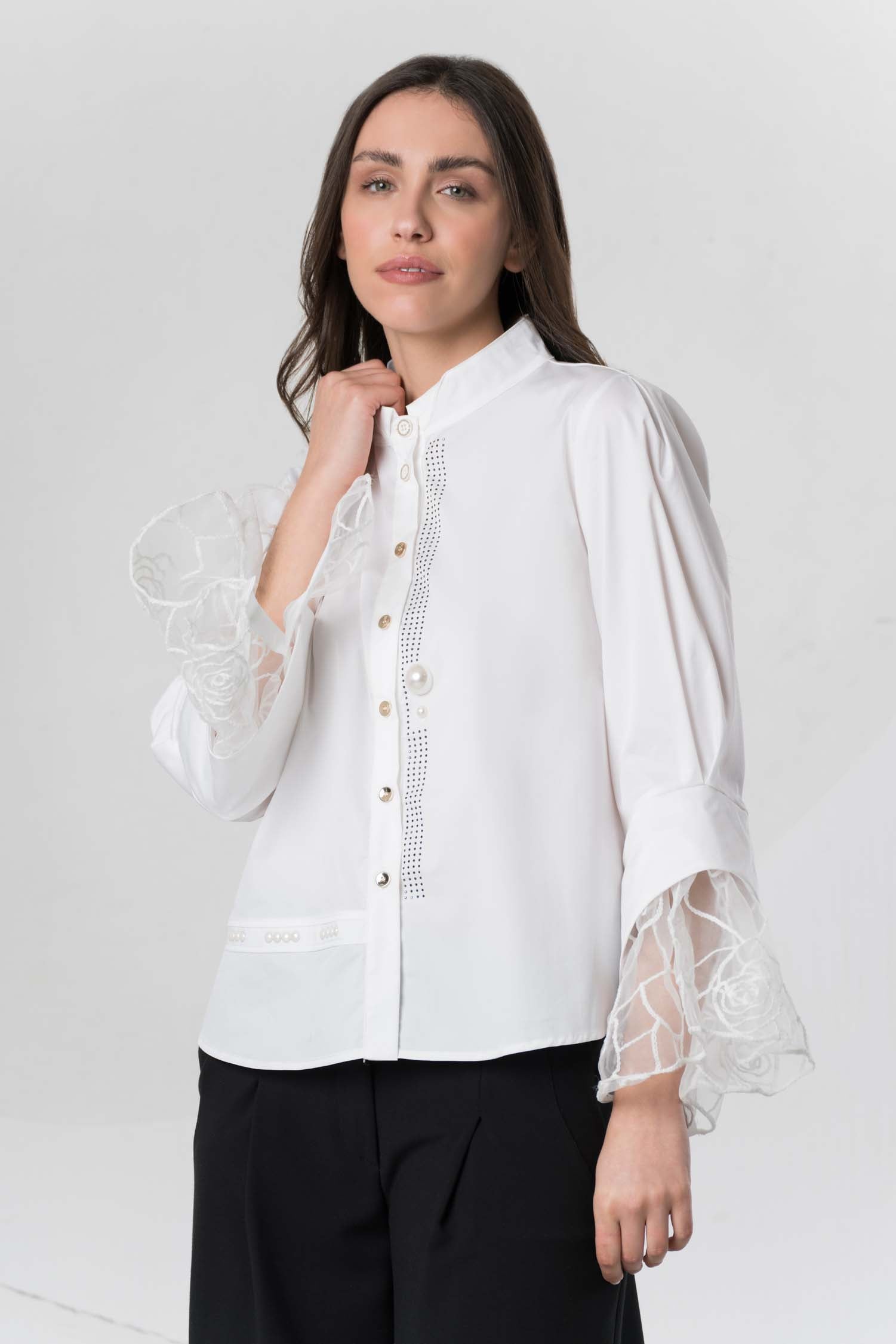 This classic blouse captivates with its elegant batwing sleeves, crafted from sheer fabric for exceptional lightness. Subtle button details add a touch of individuality, while delicate rhinestones further enhance its sophisticated character, making it a versatile companion for refined looks.