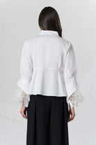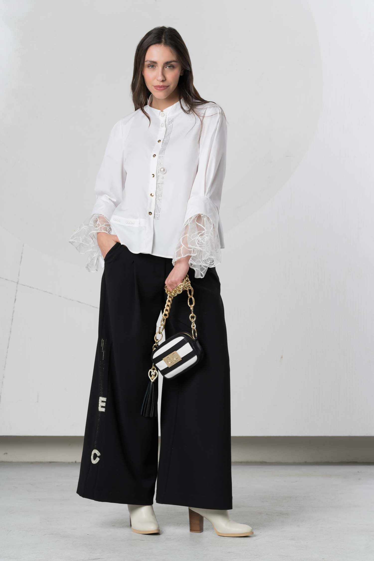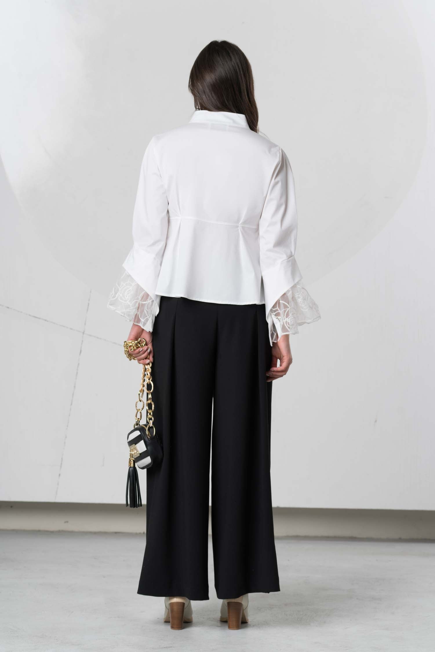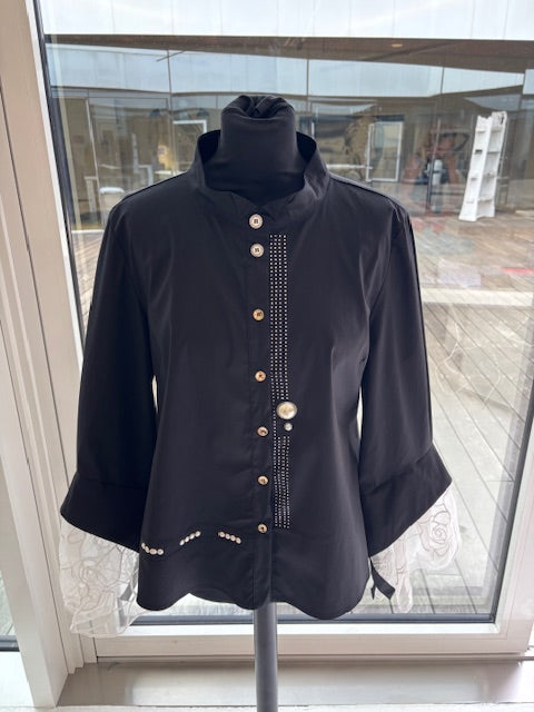 This classic blouse captivates with its elegant batwing sleeves, crafted from sheer fabric for exceptional lightness. Subtle button details add a touch of individuality, while delicate rhinestones further enhance its sophisticated character, making it a versatile companion for refined looks.