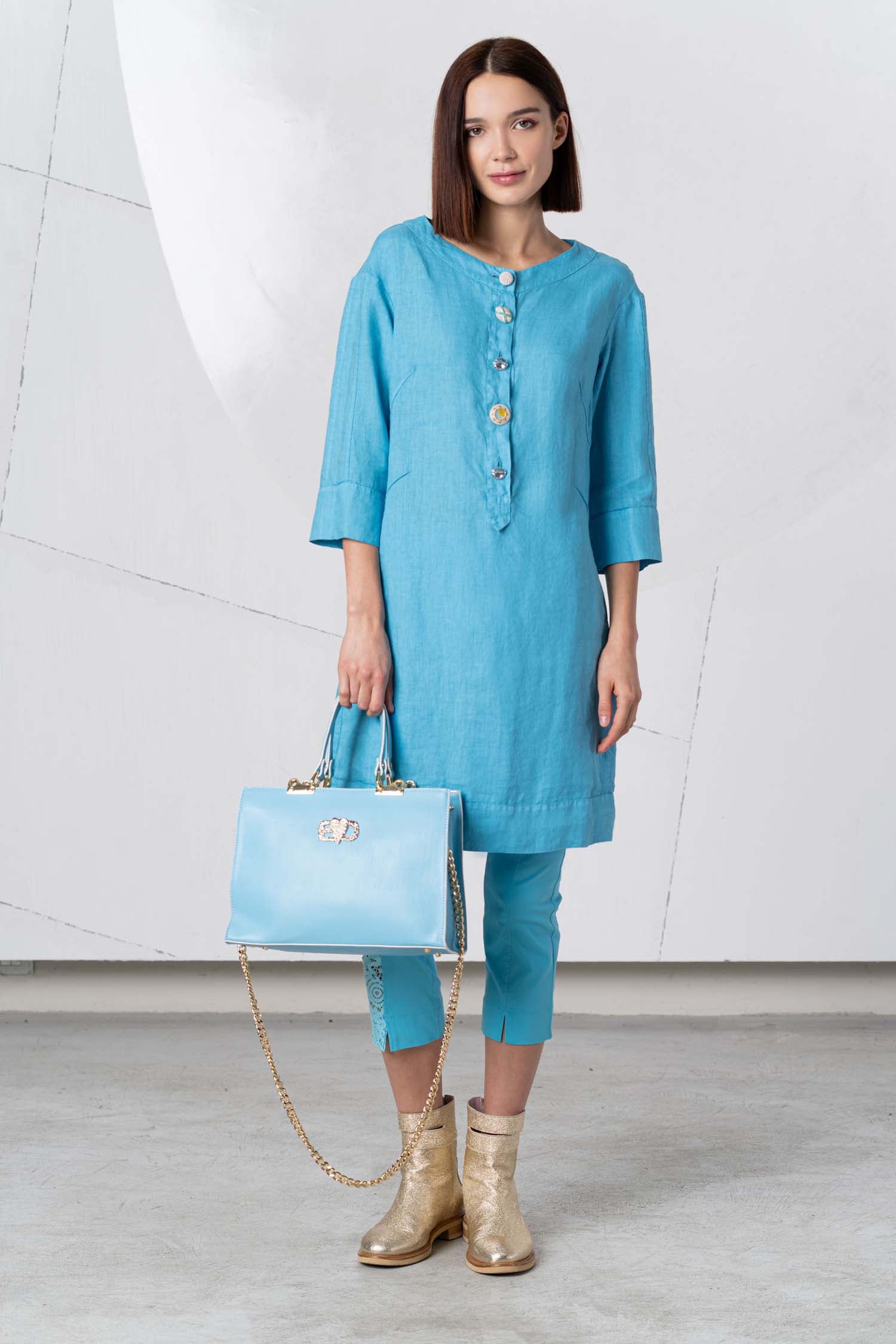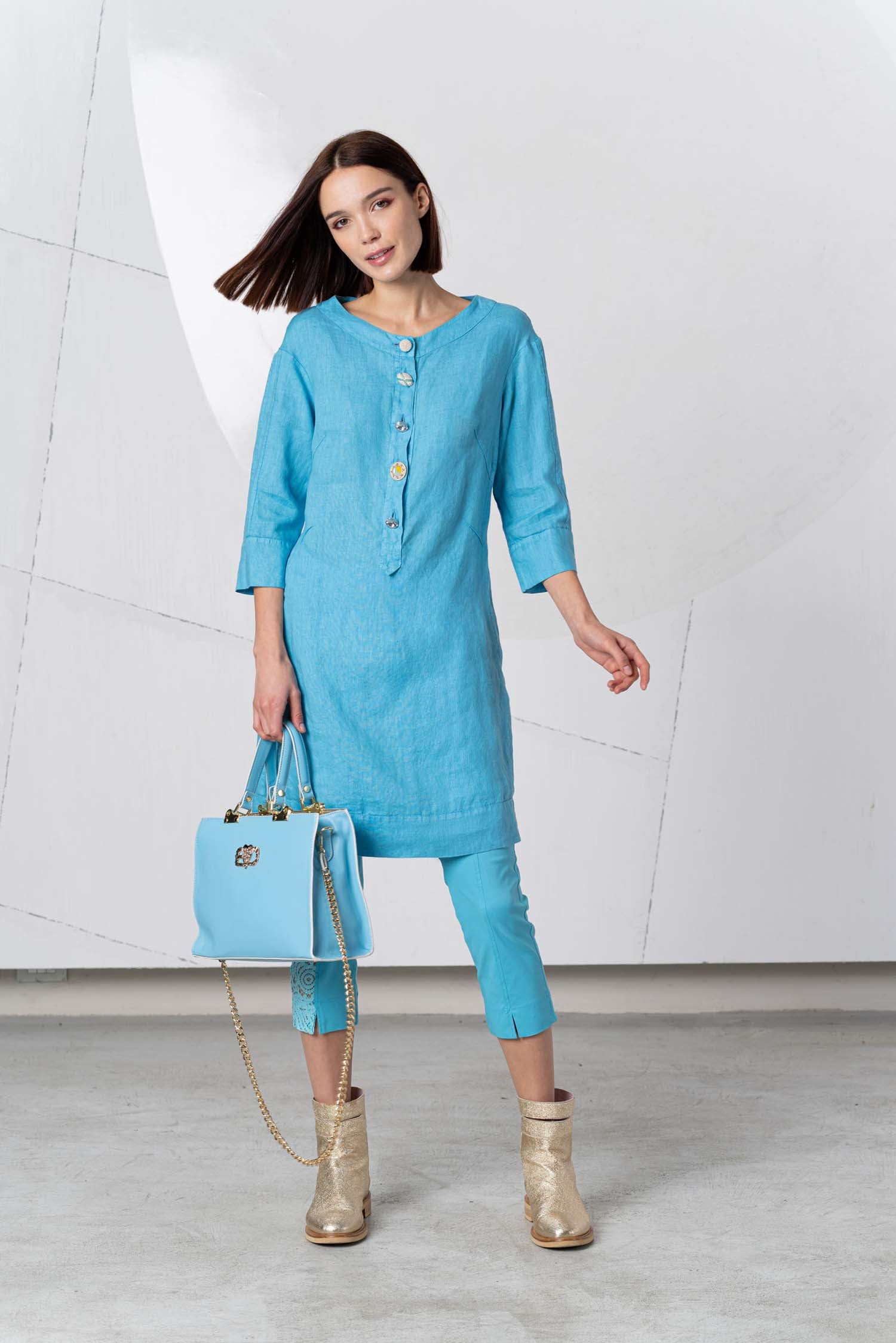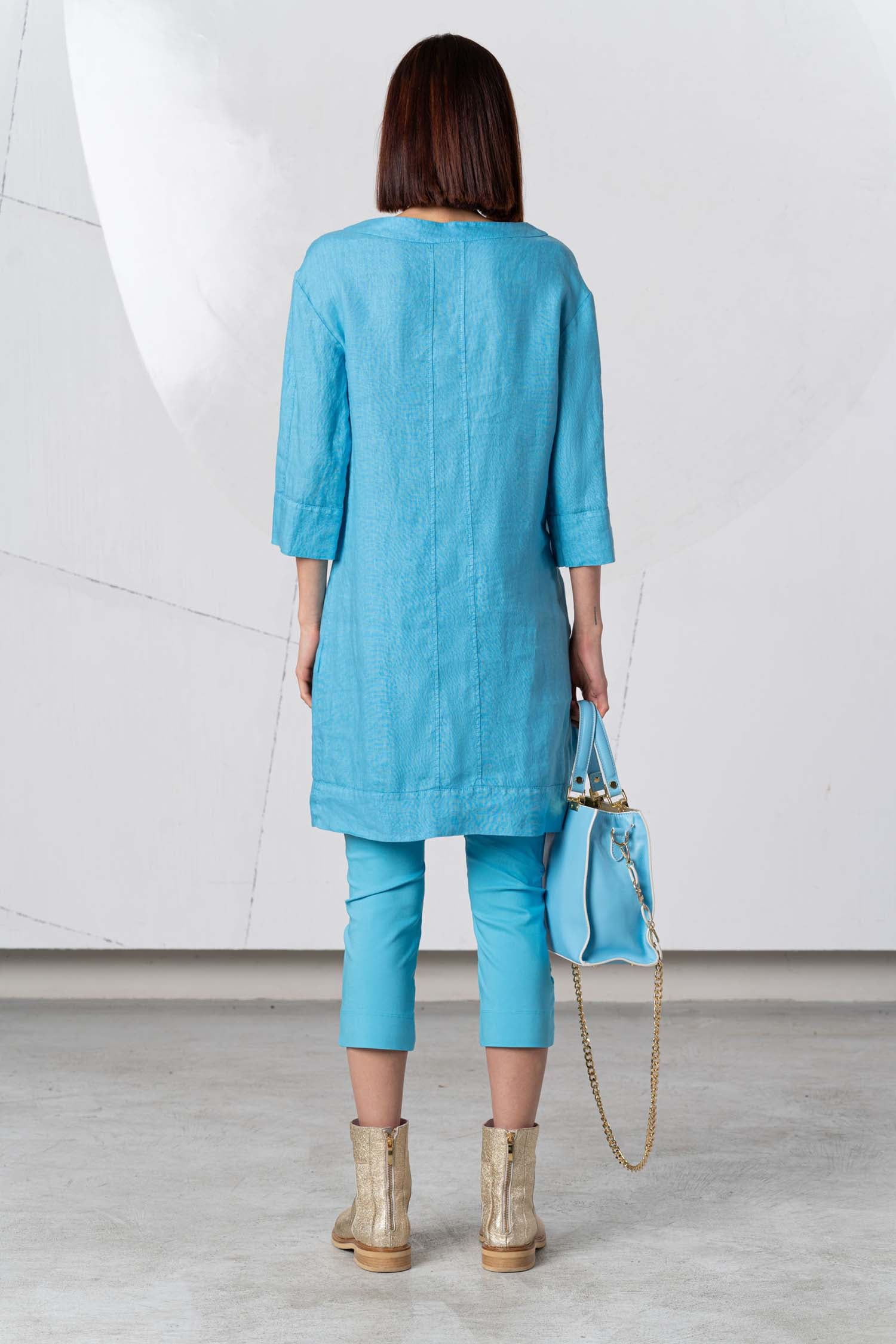 Give your look a comfortable yet elegant feel with the ELISA CAVALETTI Estro tunic in turquoise, made from 100% linen. Perfect for a day at the beach or a relaxed afternoon in the city. Create an unforgettable look with this unique tunic!
