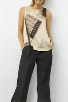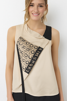 Beautiful beige top with writing in the chest area.