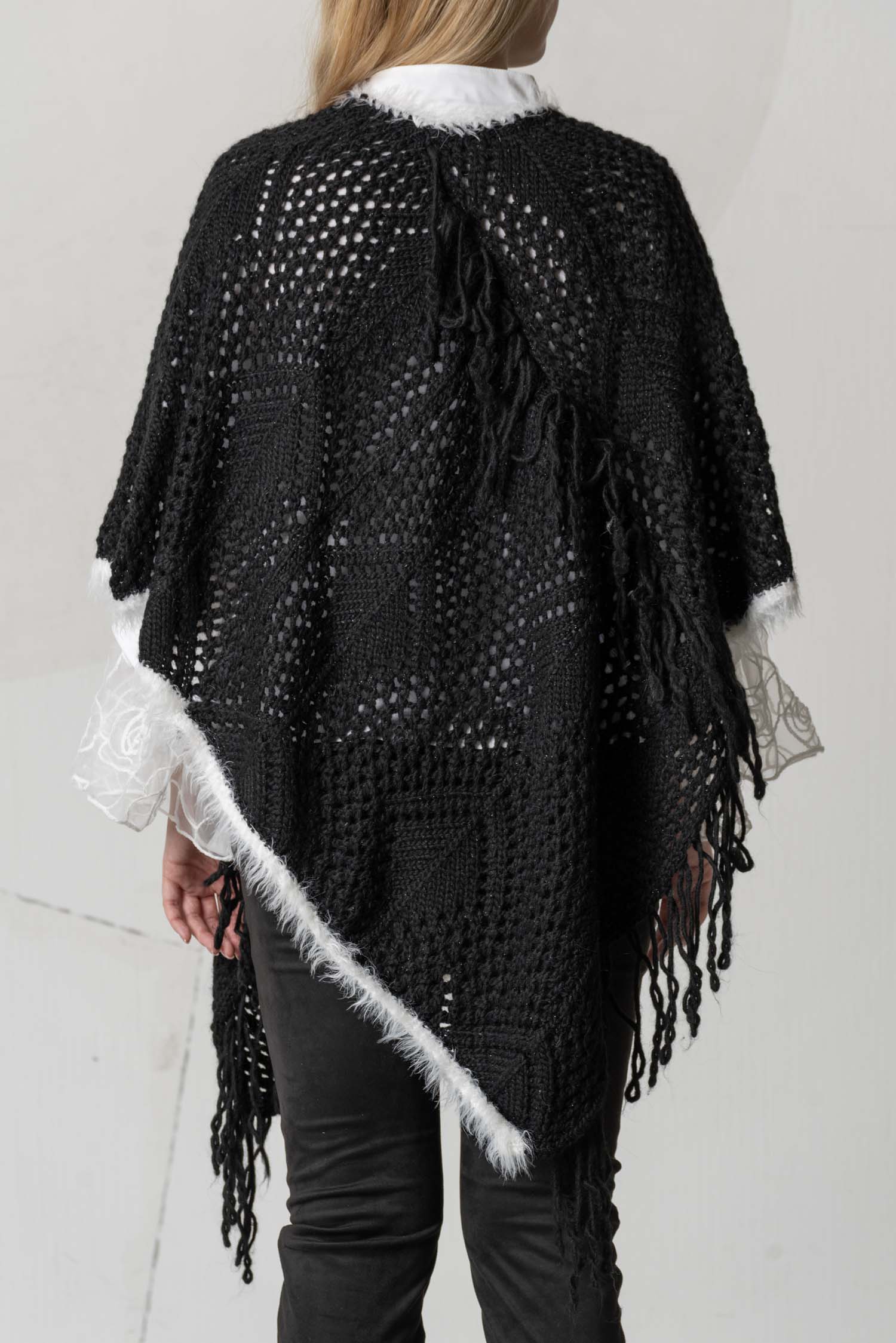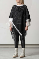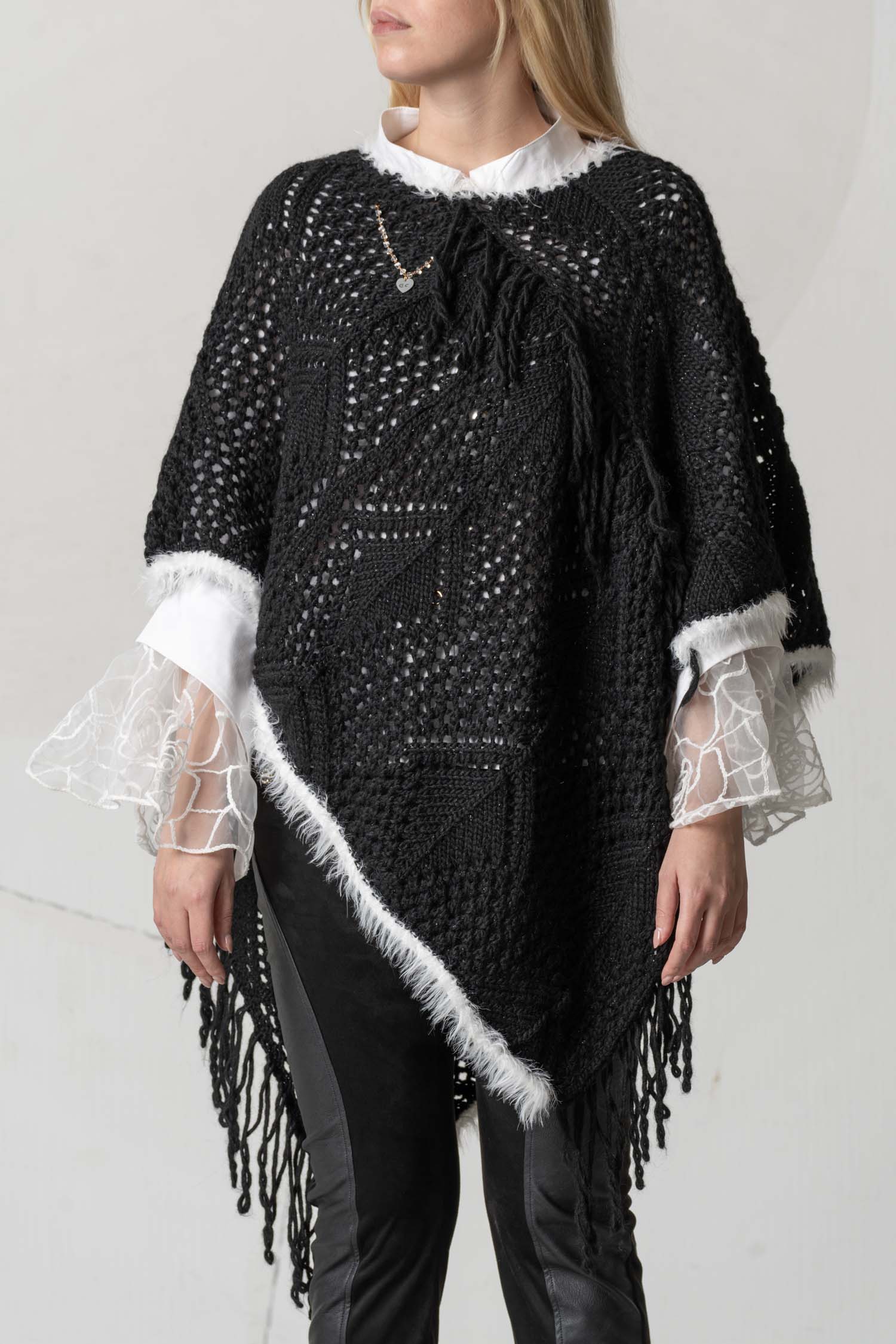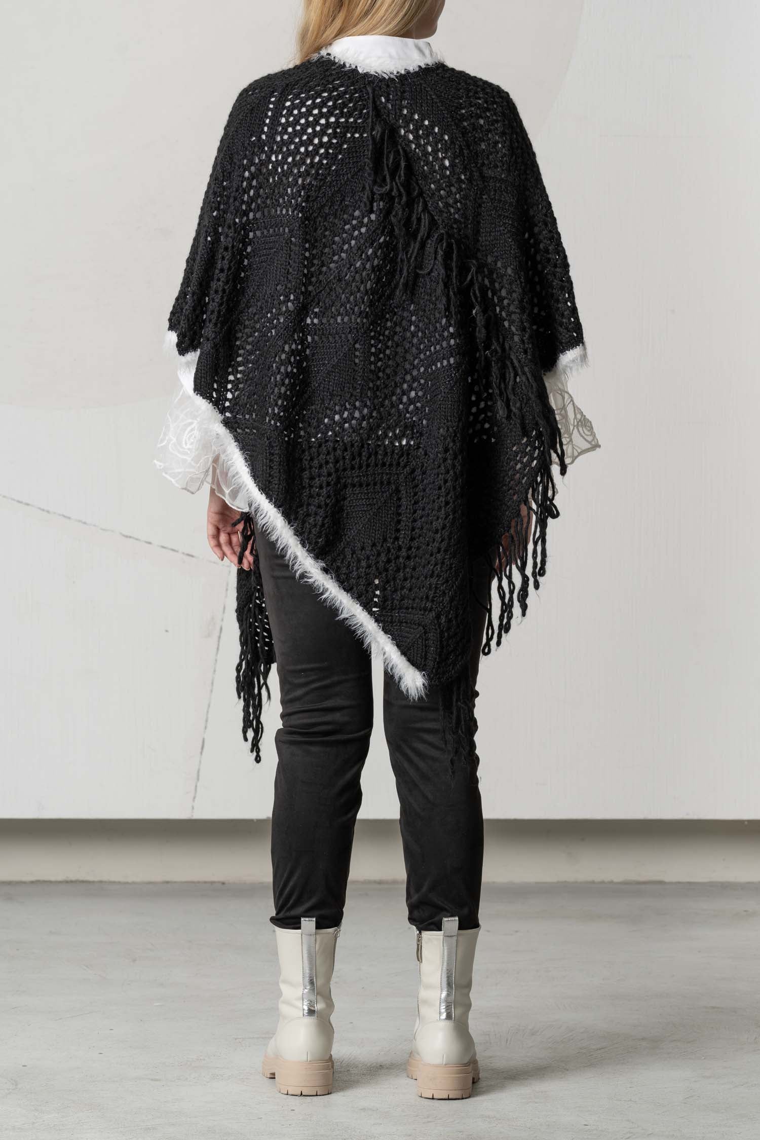 The ELISA CAVALETTI knitted poncho in elegant grey combines premium wool with a fashionable openwork pattern that is both breathable and warm. Its subtle fringed hem adds a sophisticated touch to any outfit, and the high-quality materials ensure lasting comfort. This timeless piece is ideal for style-conscious women who appreciate both functionality and design.