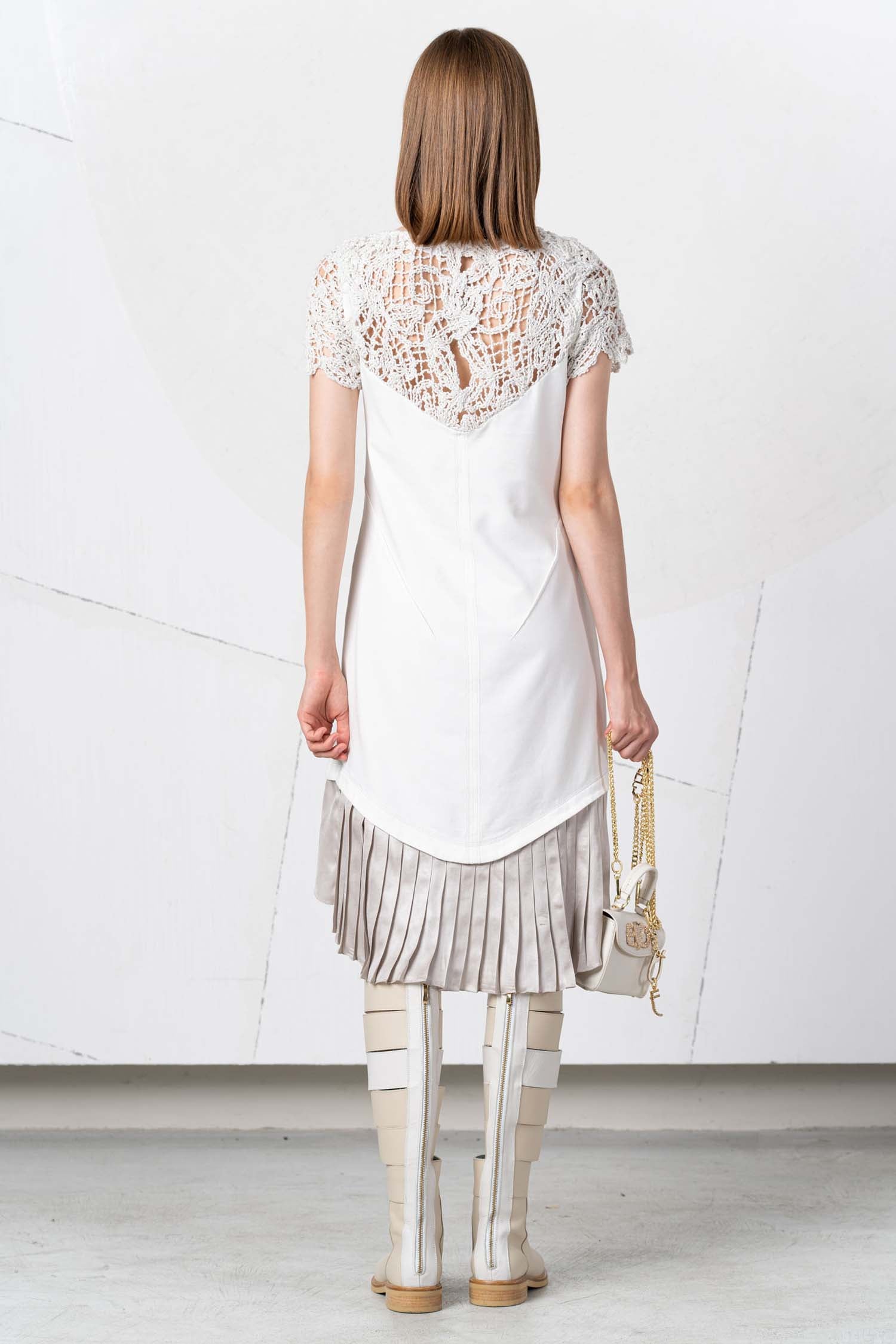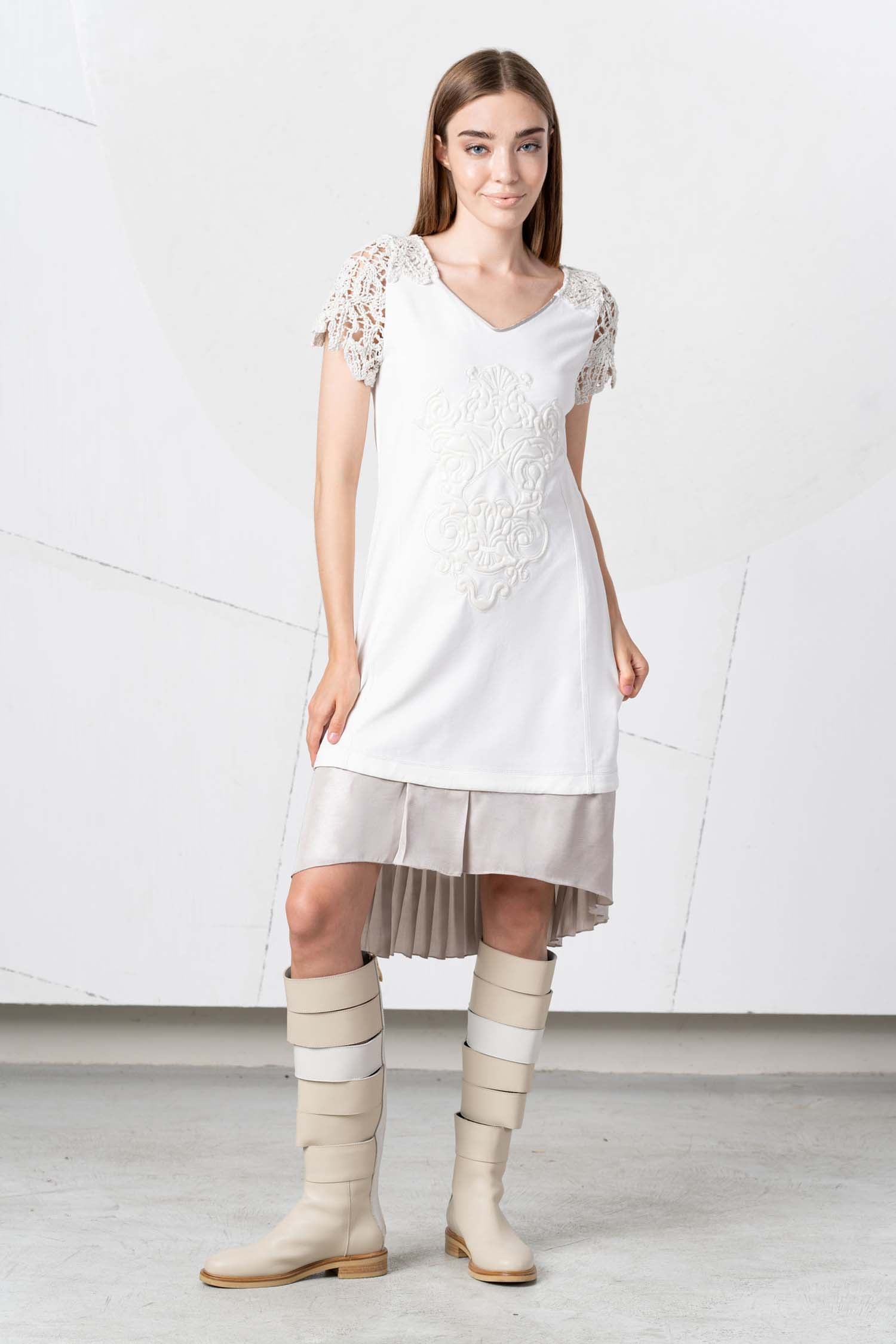 Experience the modern elegance of the ELISA CAVALETTI Incontro Euforia dress. In white and beige, it captivates with its asymmetrical design and V-neck. The short sleeves ensure comfort and make this dress a must-have for any occasion.