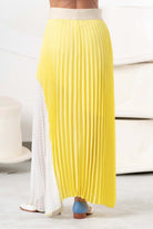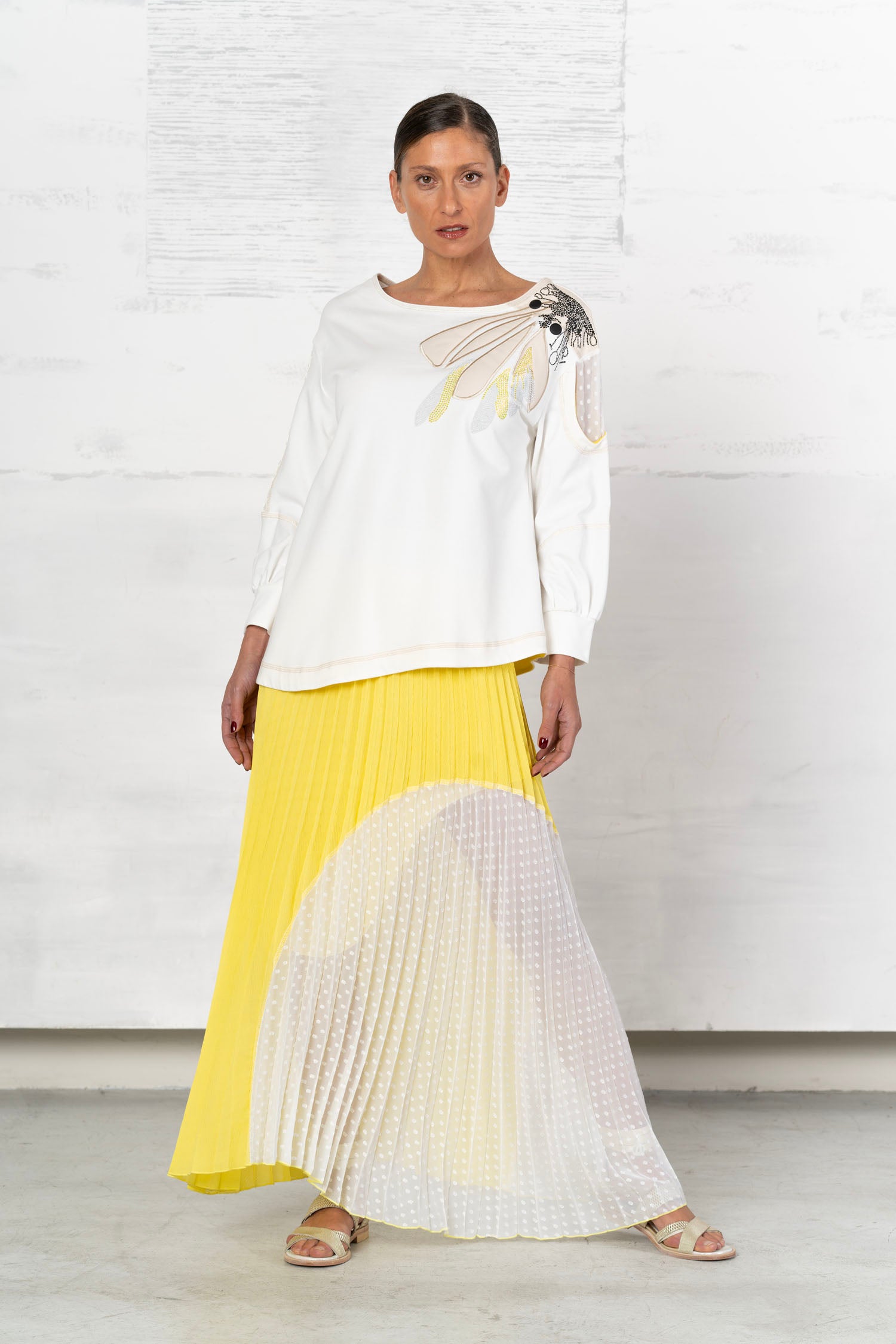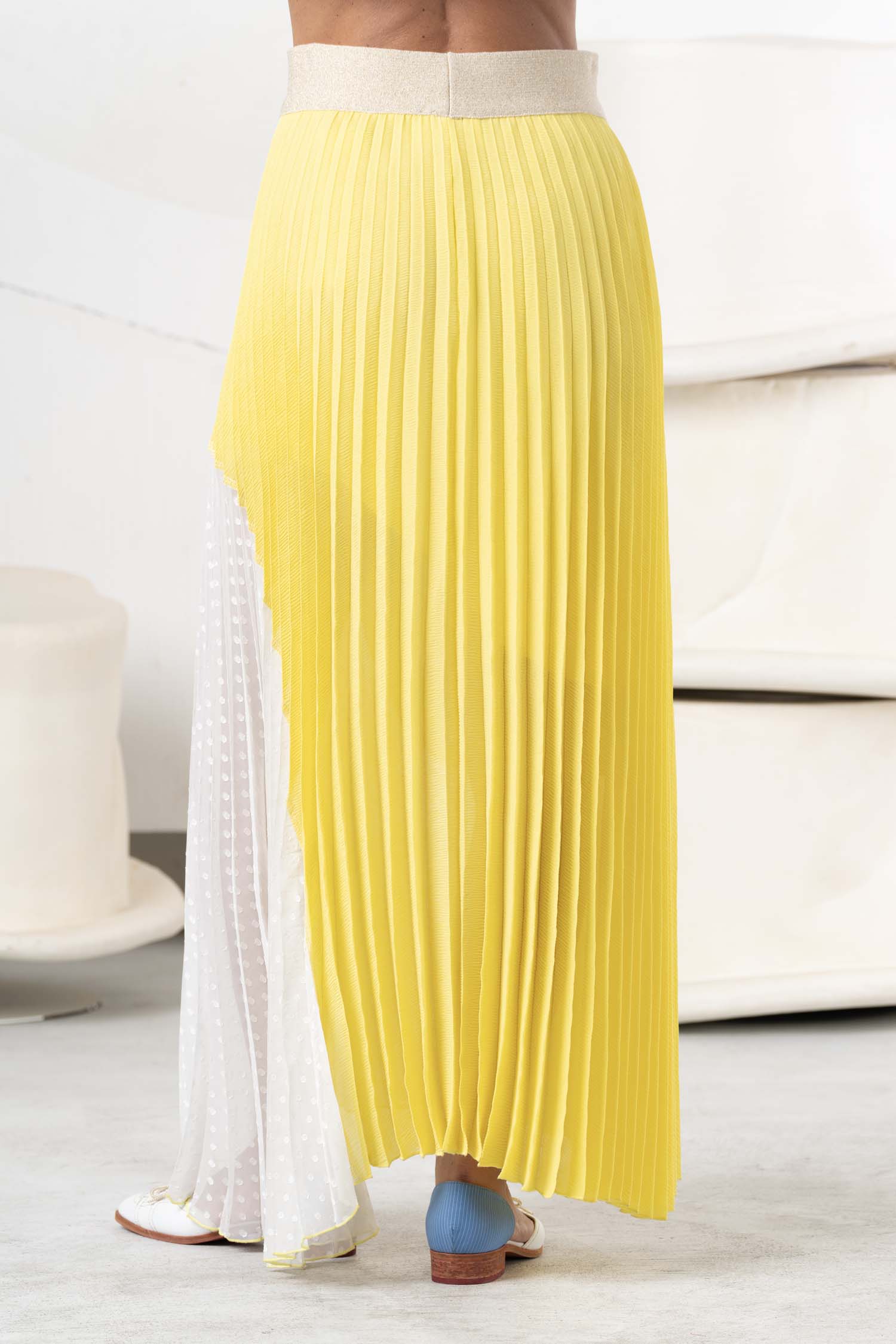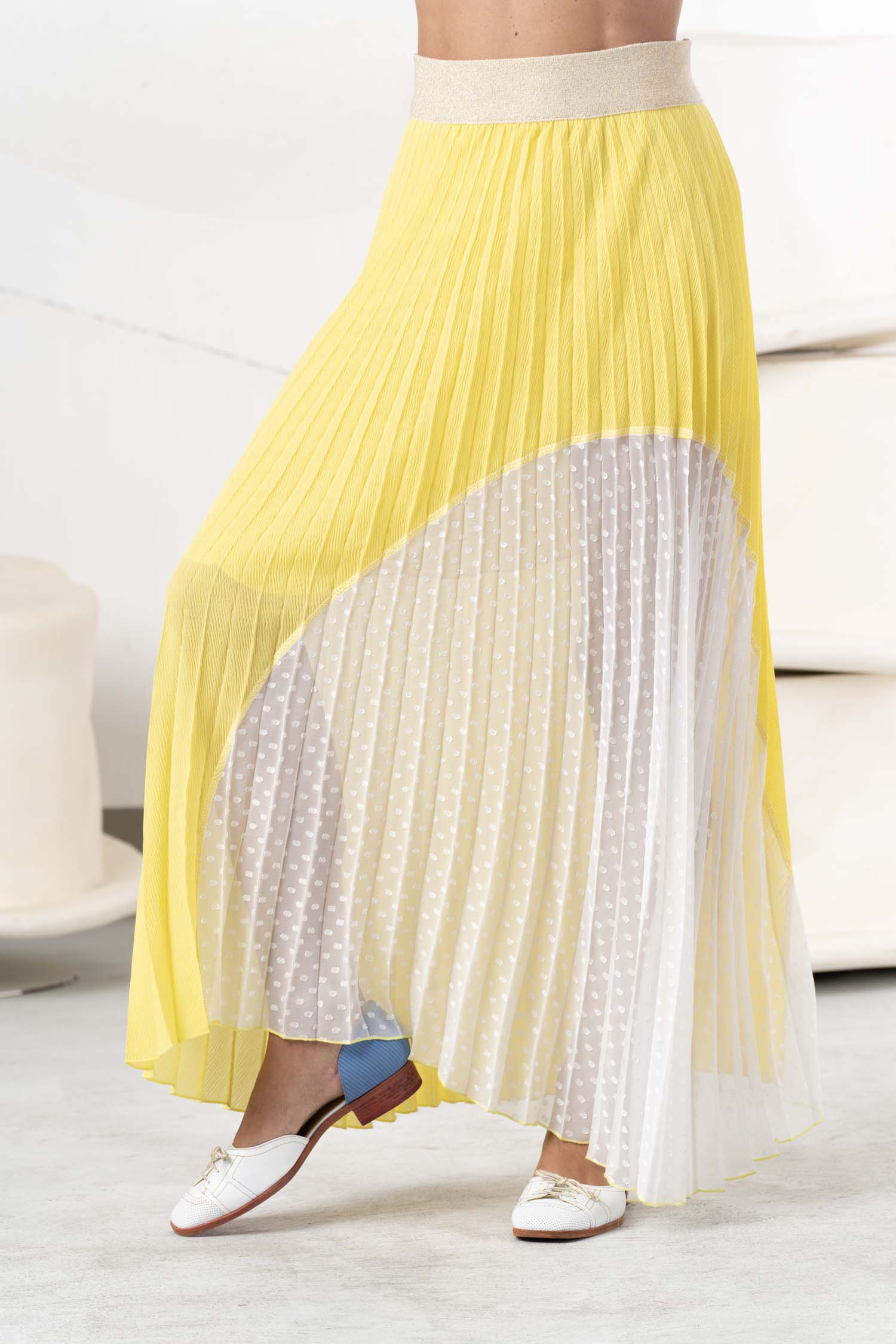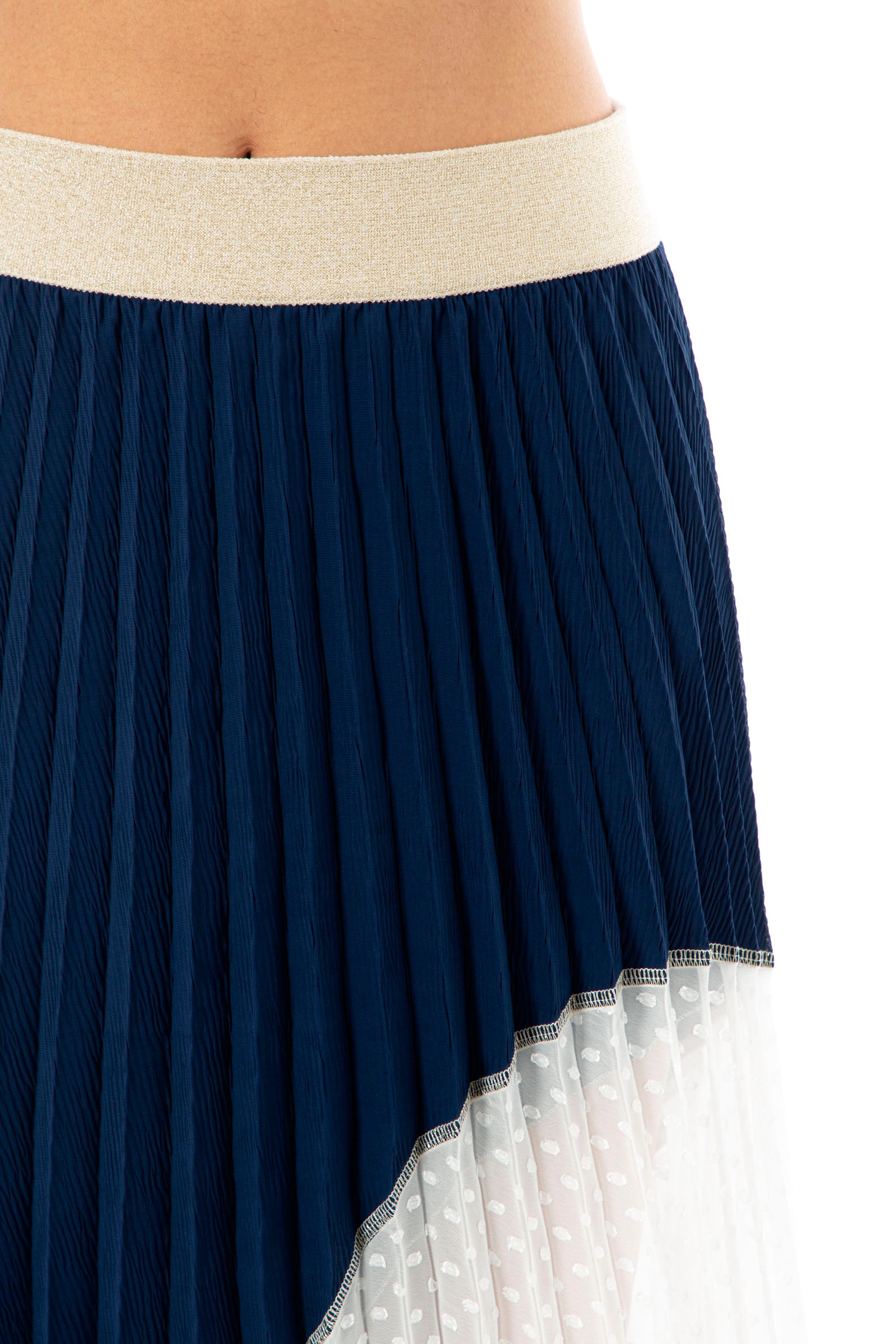 This pleated skirt impresses with its stylish color combination featuring white, creating a fresh and modern look. Thanks to its trendy design, it can be combined in many ways and adds an elegant touch to any outfit. Ideal for fashion-conscious women who appreciate contemporary and sophisticated details.