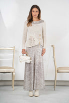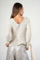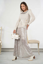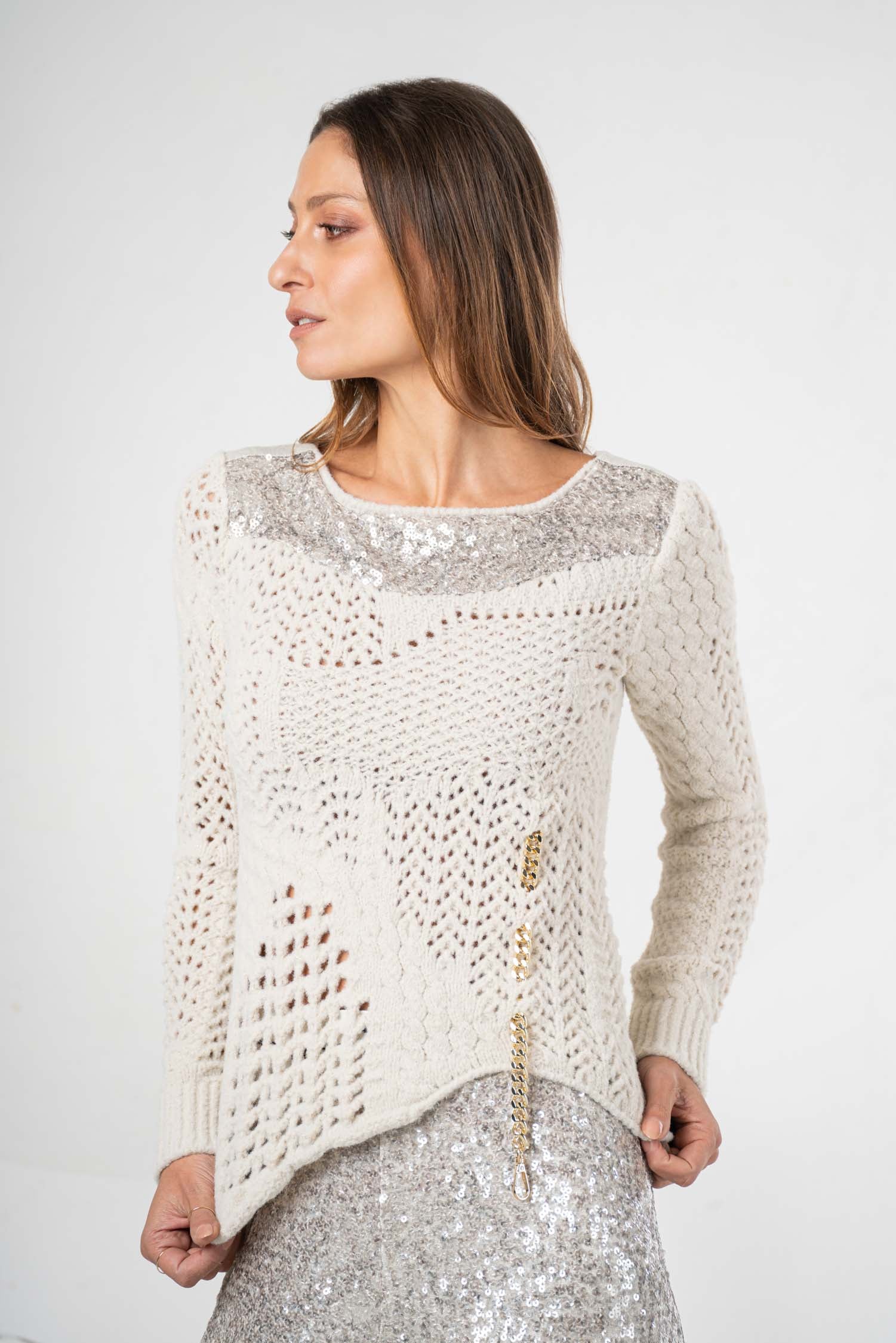 This beige knit sweater impresses with its varied knit patterns and subtly integrated sequins, lending the garment a sophisticated, elegant touch. The high-quality workmanship ensures comfortable wear and durability. Ideal for style-conscious wearers who appreciate timeless knitwear with a hint of glamour.