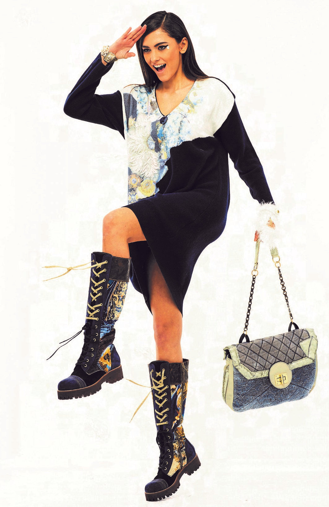 Dark blue sweater dress with colorful pattern.