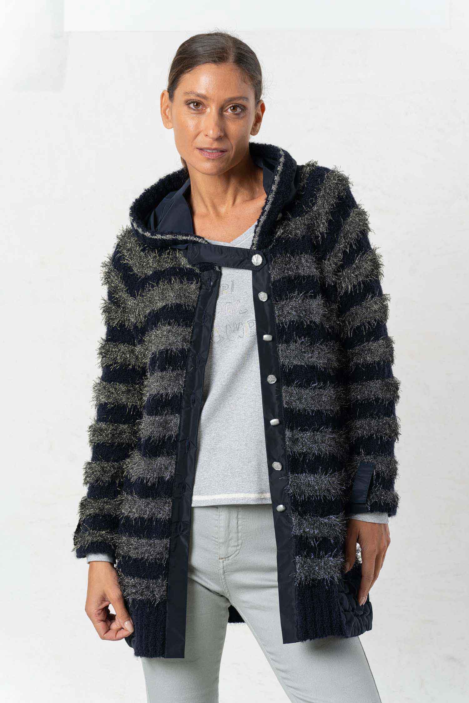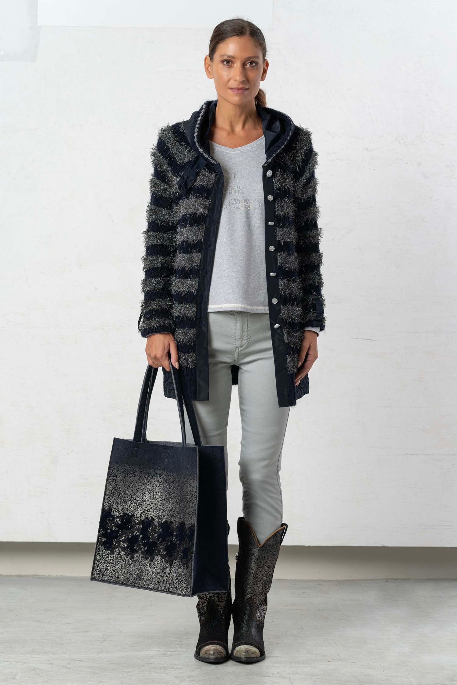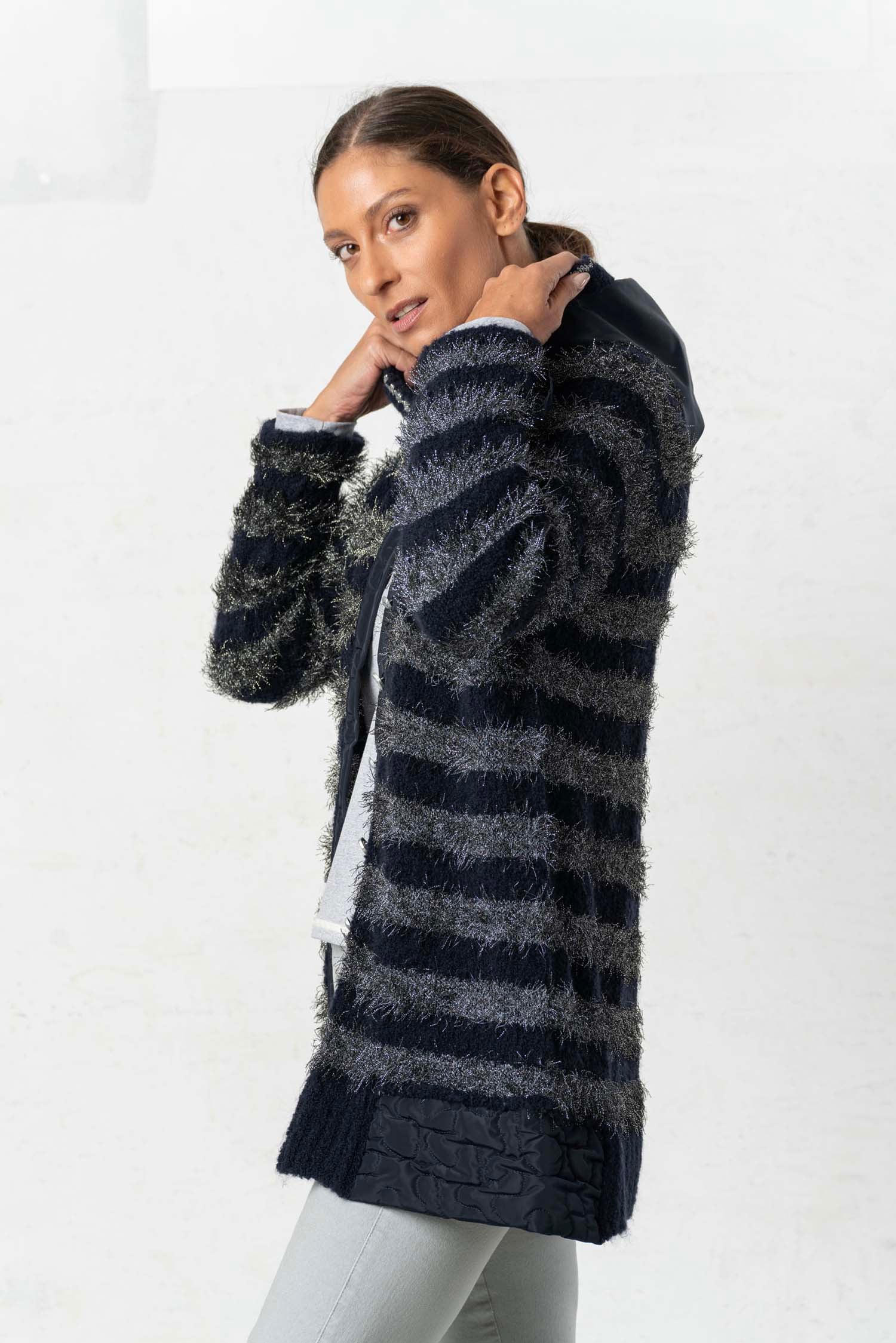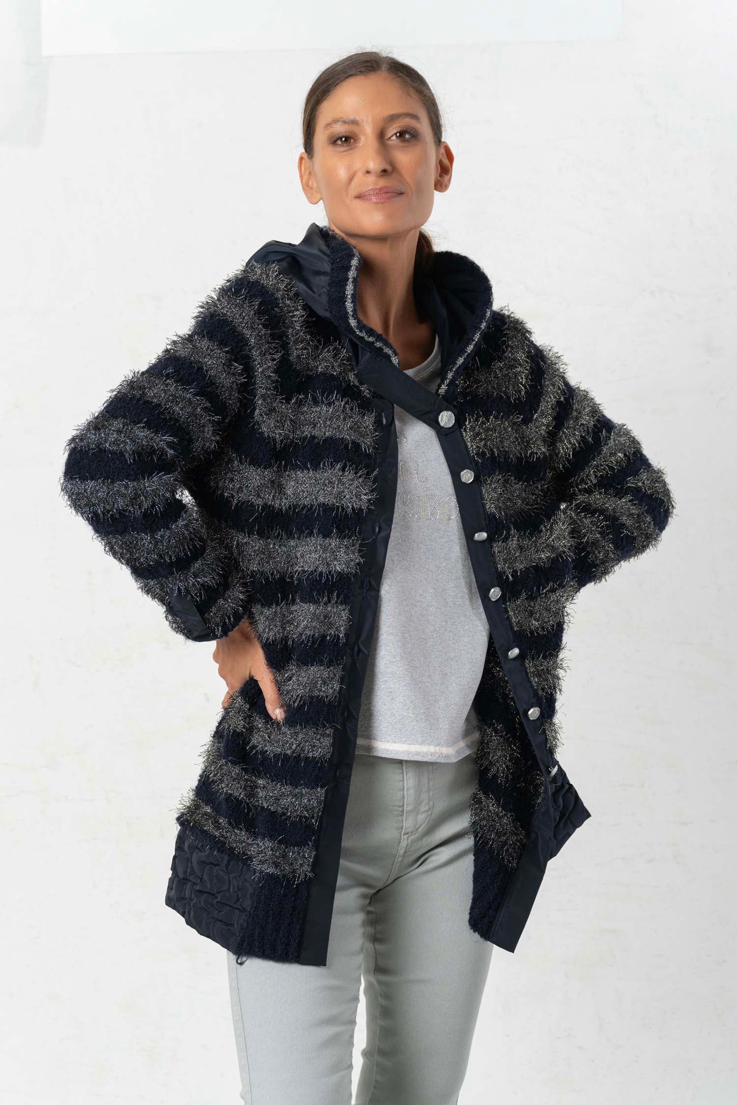 The ELISA CAVALETTI Conquiste jacket is a cozy cardigan in dark blue and grey. Its plush, faux-fur texture ensures a comfortable feel and keeps you wonderfully warm on cold days. Win people's hearts with this unique jacket!