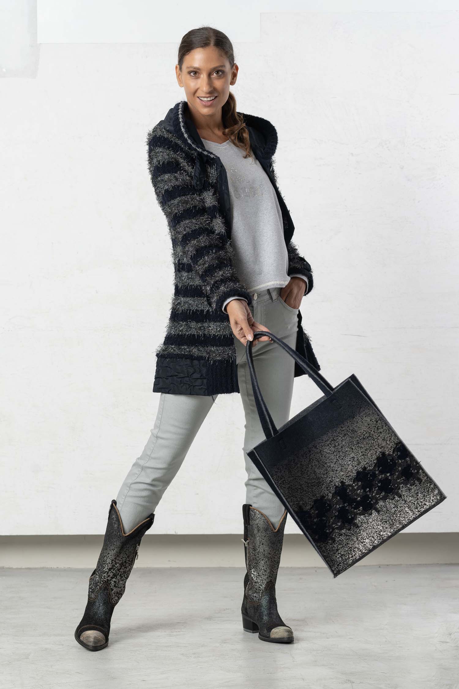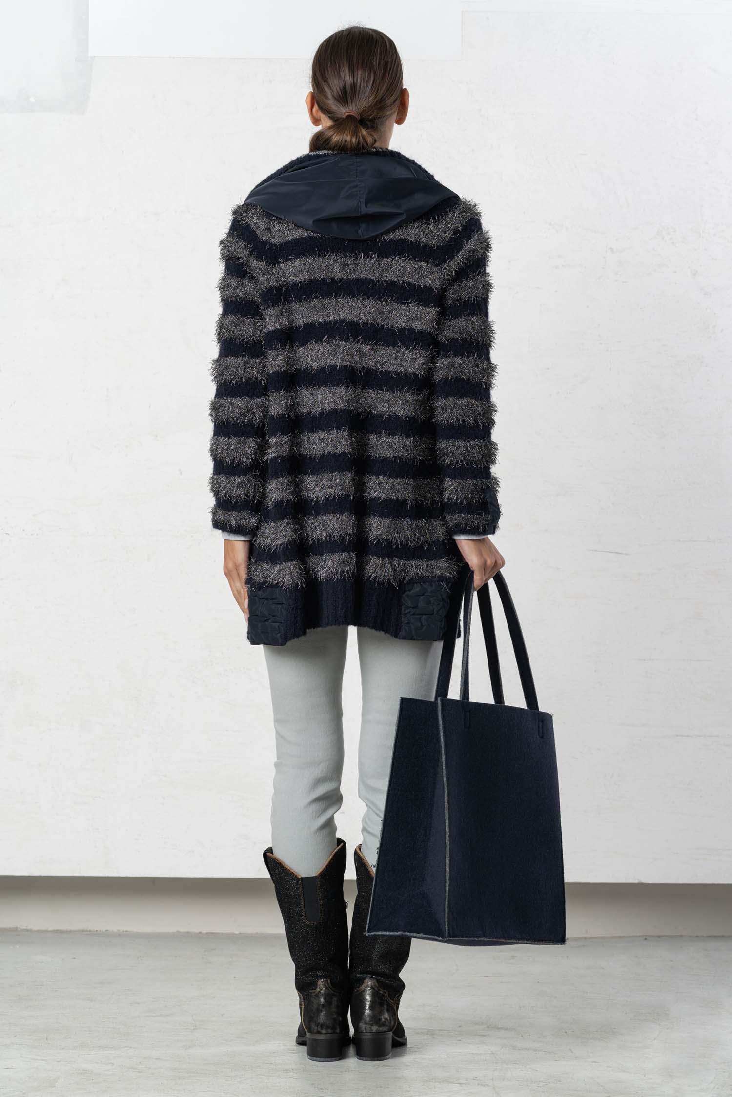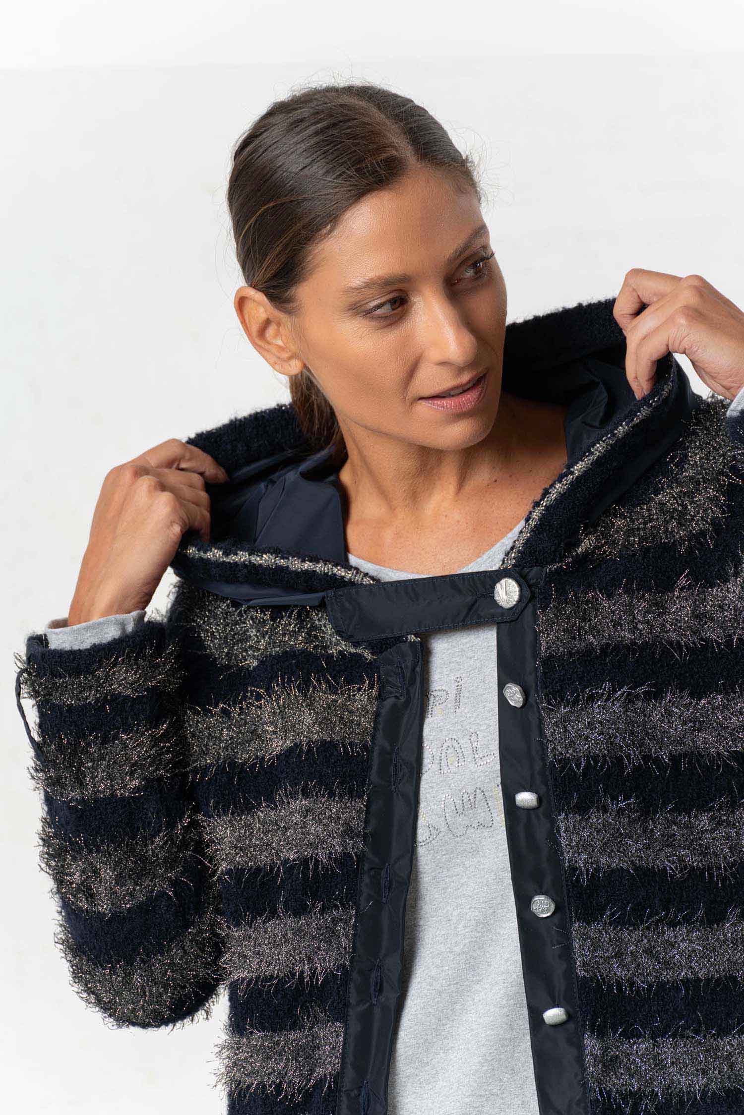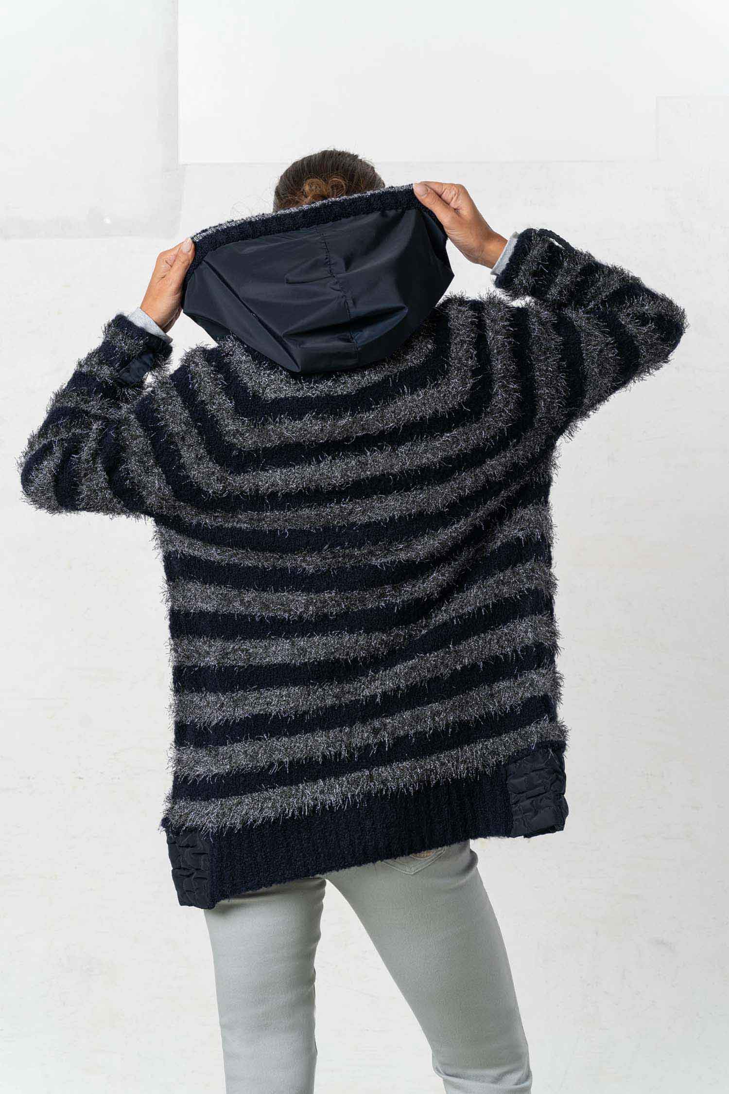 The ELISA CAVALETTI Conquiste jacket is a cozy cardigan in dark blue and grey. Its plush, faux-fur texture ensures a comfortable feel and keeps you wonderfully warm on cold days. Win people's hearts with this unique jacket!