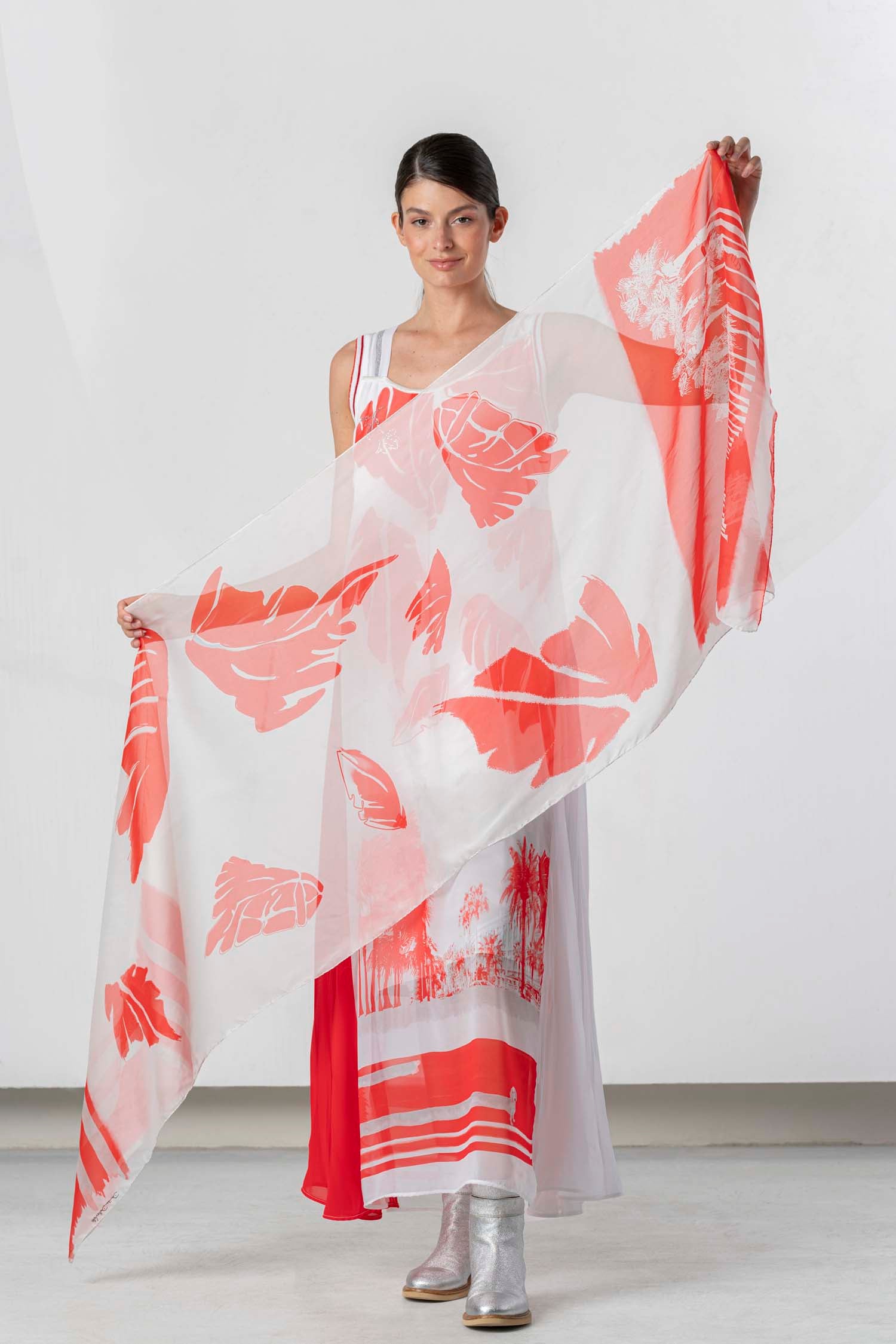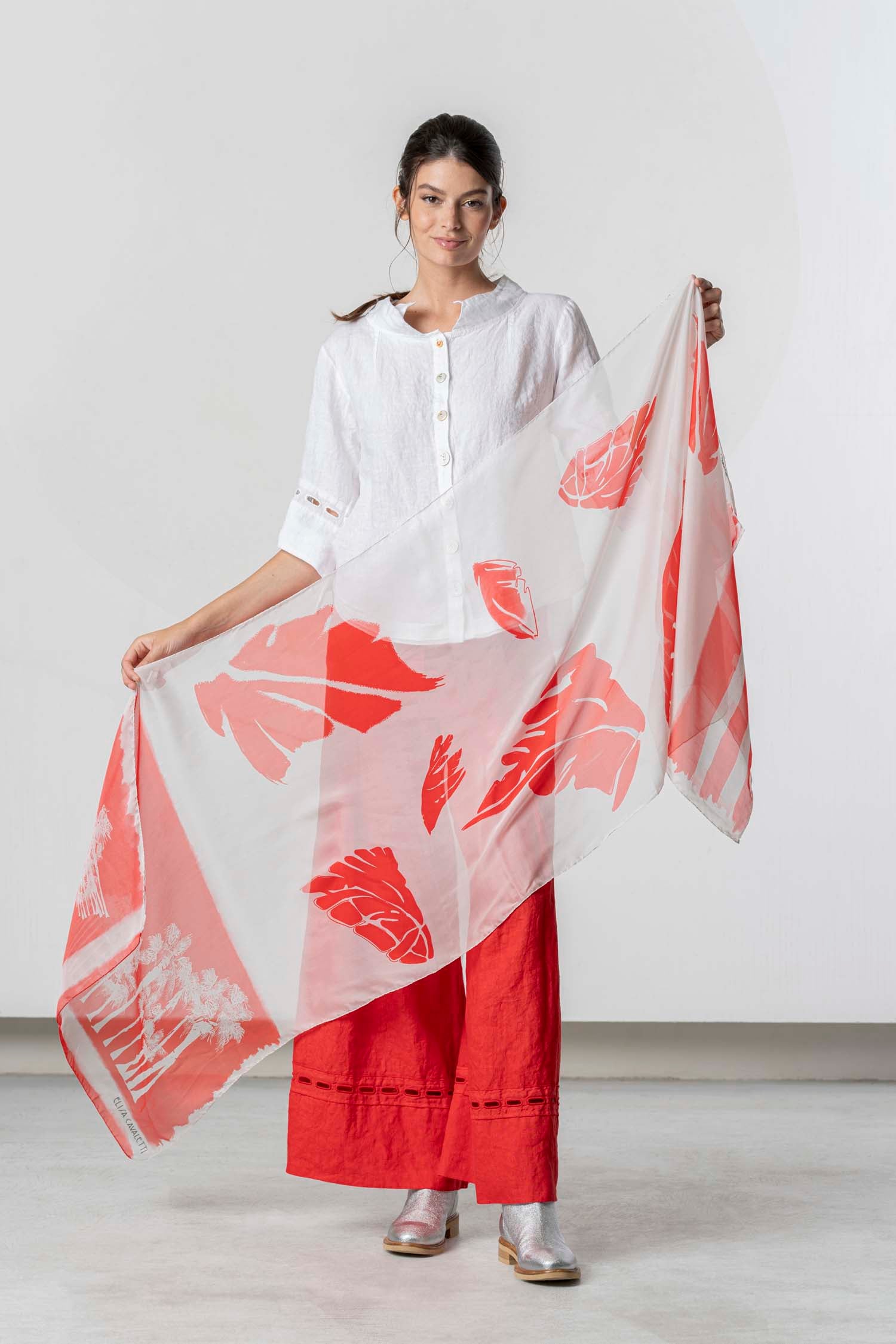 Dieses elegante Seidentuch überzeugt mit einem frischen, tropischen Druck in Korallenrot und floralen Mustern. Die leichte, hochwertige Seide sorgt für ein angenehmes Tragegefühl und lässt sich vielseitig tragen – sei es als Schal, Kopftuch oder Accessoire. Ein stilvoller Begleiter, der jedes Outfit aufwertet.